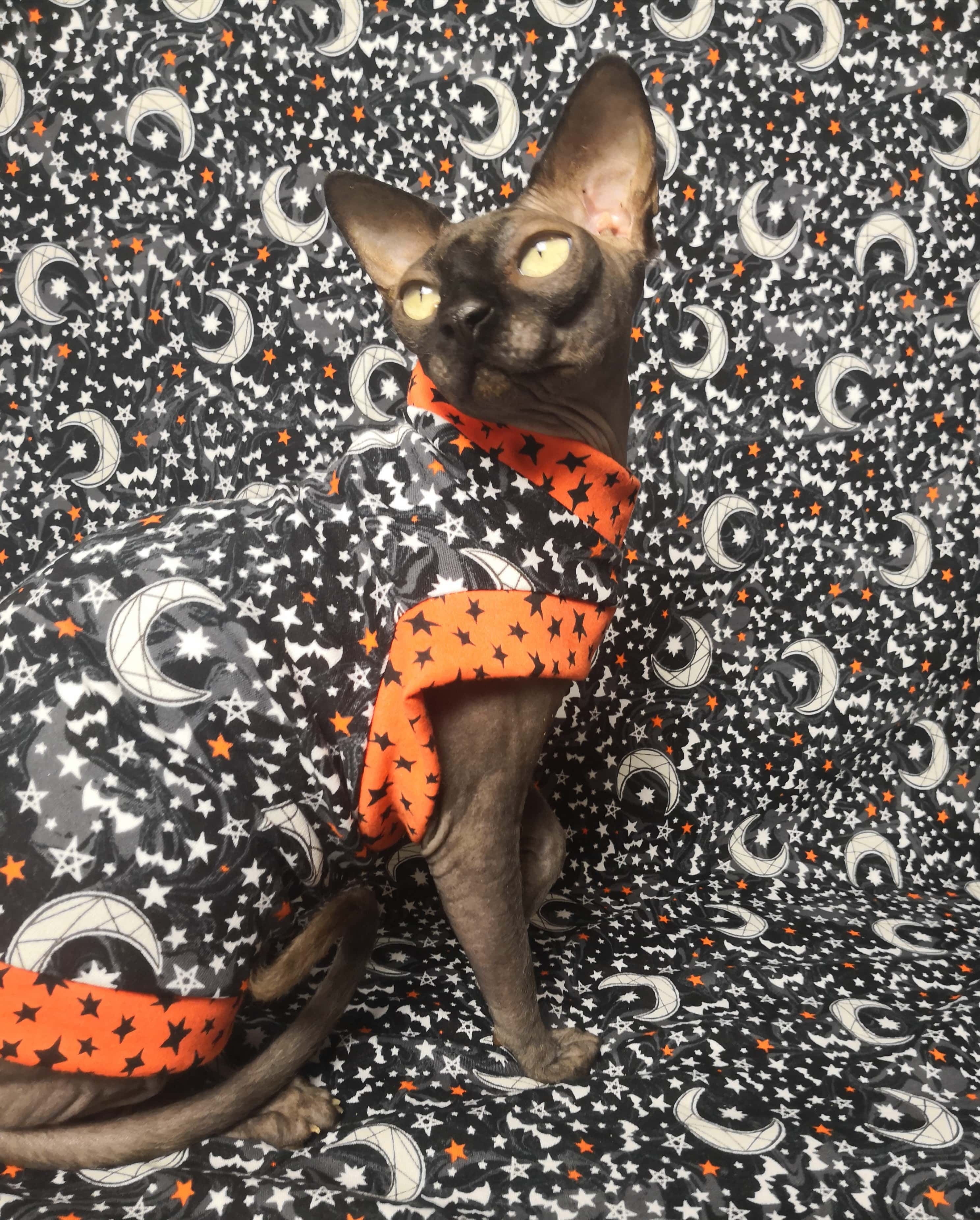 These two are an Open Edition and Limited Edition cat shirt / sweater for your hairless Sphynx / Devon Rex / Cornish Rex / Peterbald, and even for some of our stylish furry friends. This is a lightweight stretchy cotton spandex blend fabric with printed glow-in-the-dark Halloween moons and stars and bats adorned with the same trim or limited orange star trim. This is our Second Open Edition and we will try our best to accommodate all orders right up until Halloween.