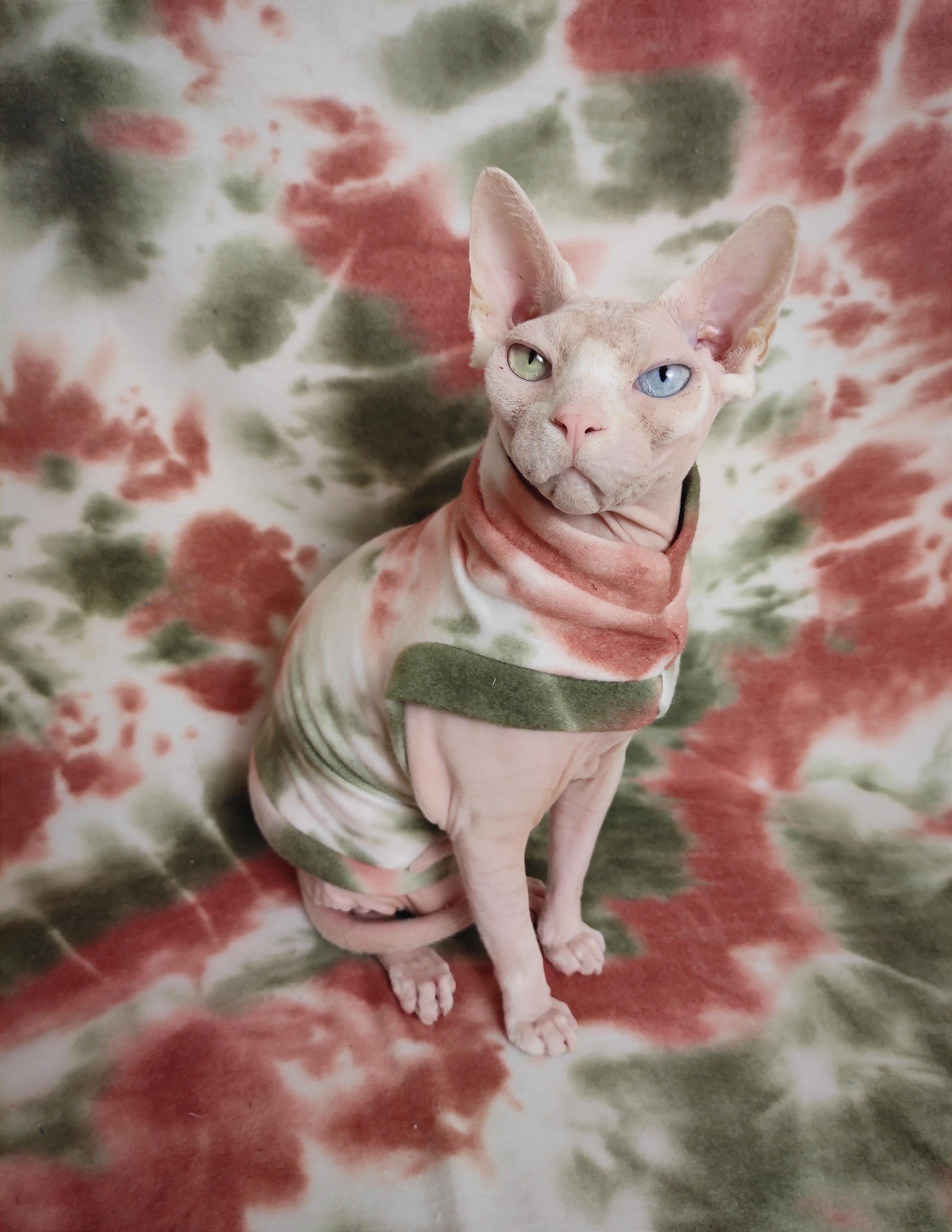 REGULAR size is for most adult hairless cats age 1 to 18. BAMBINO size fits hairless kittens age 6 months to 1 year and smaller adult cats. ANKLE BITER size fits kittens 15 weeks to 6 month olds. LIL NIPPER size fits hairless kittens age 8 weeks to 15 week olds for when they are with the breeder or for the trip home. Custom orders are welcome for larger and smaller cats - pricing is the same - $27.50