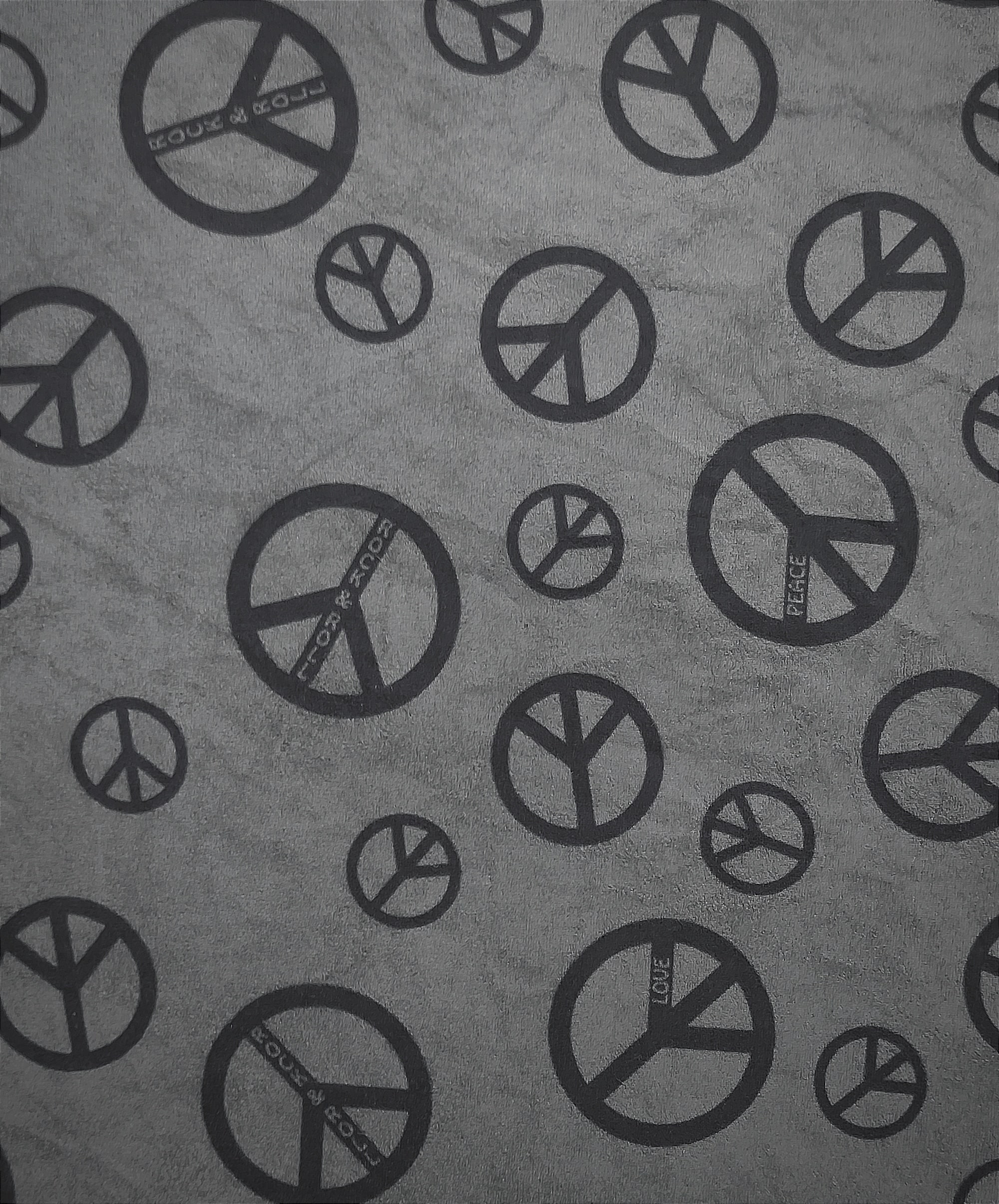 This is a lightweight sueded green fabric with printed peace signs, some of which have the words "peace", "love" and "rock & roll" text on them.