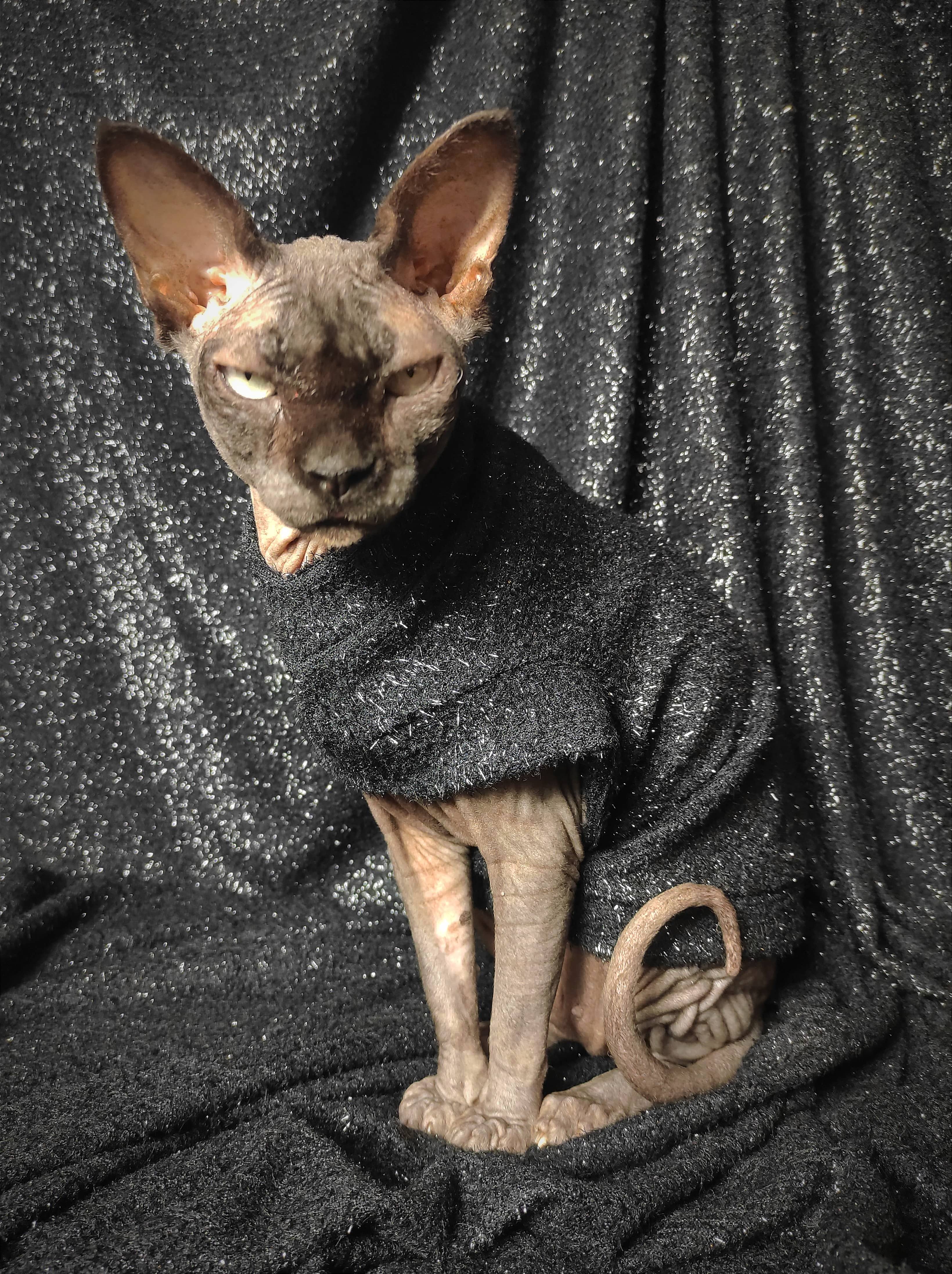 REGULAR size is for most adult hairless cats age 1 to 18. BAMBINO size fits hairless kittens age 6 months to 1 year and smaller adult cats. ANKLE BITER size fits hairless kittens 15 week to 6 month olds. LIL NIPPER size fits hairless kittens age 8 weeks to 15 week olds for when they are with the breeder or for the trip home. Custom orders are welcome for larger and smaller cats - pricing is the same - $27.50