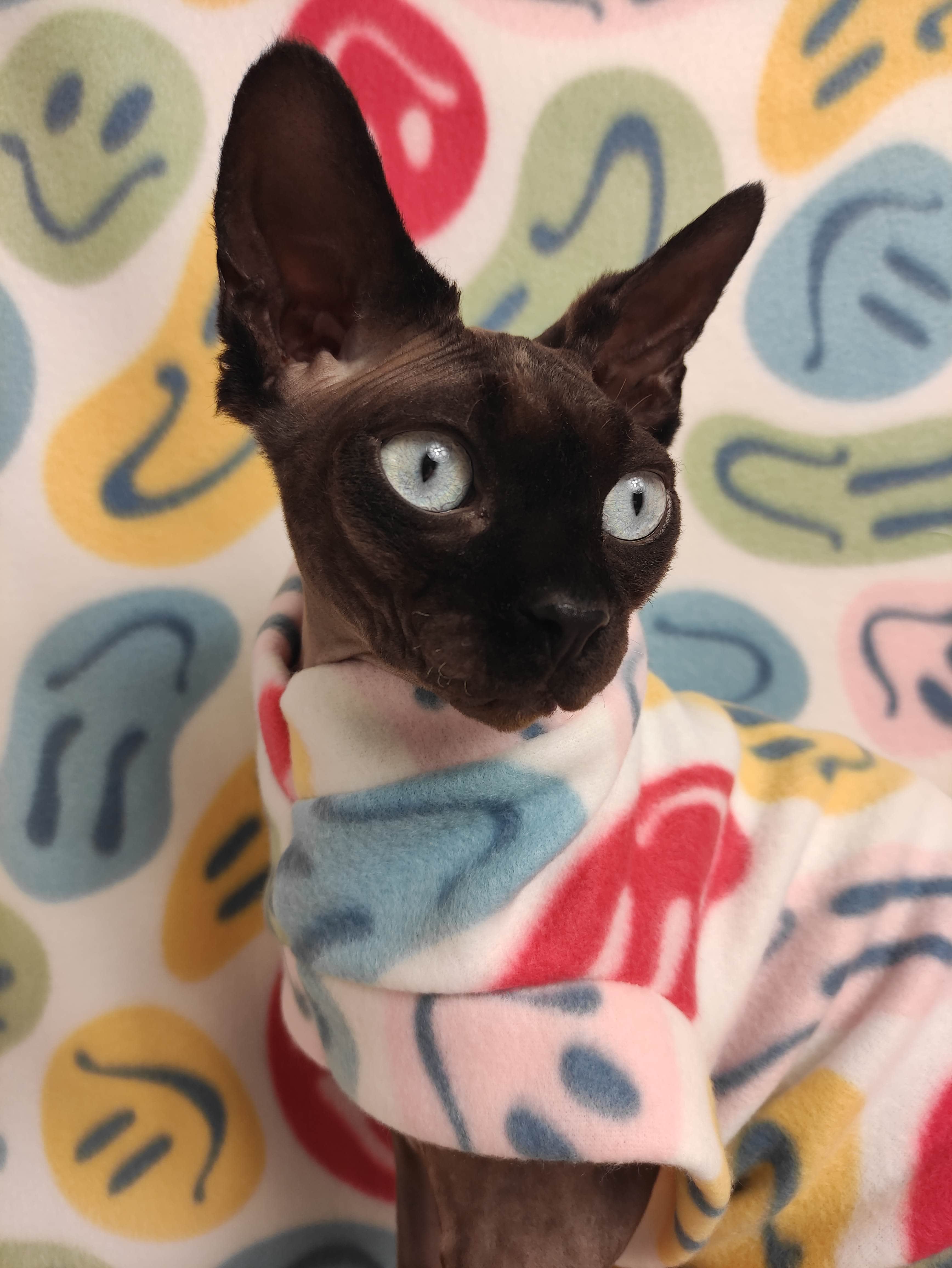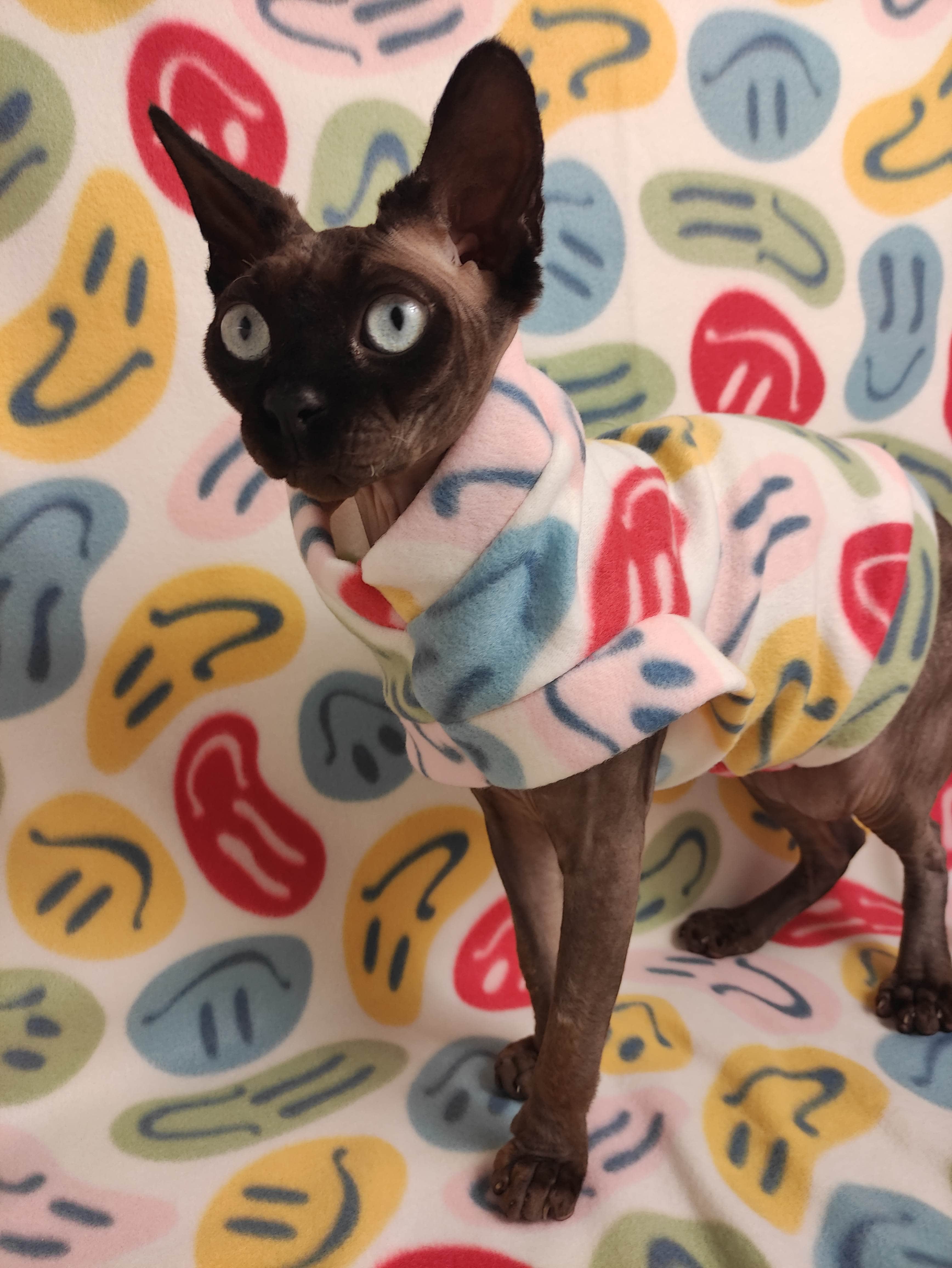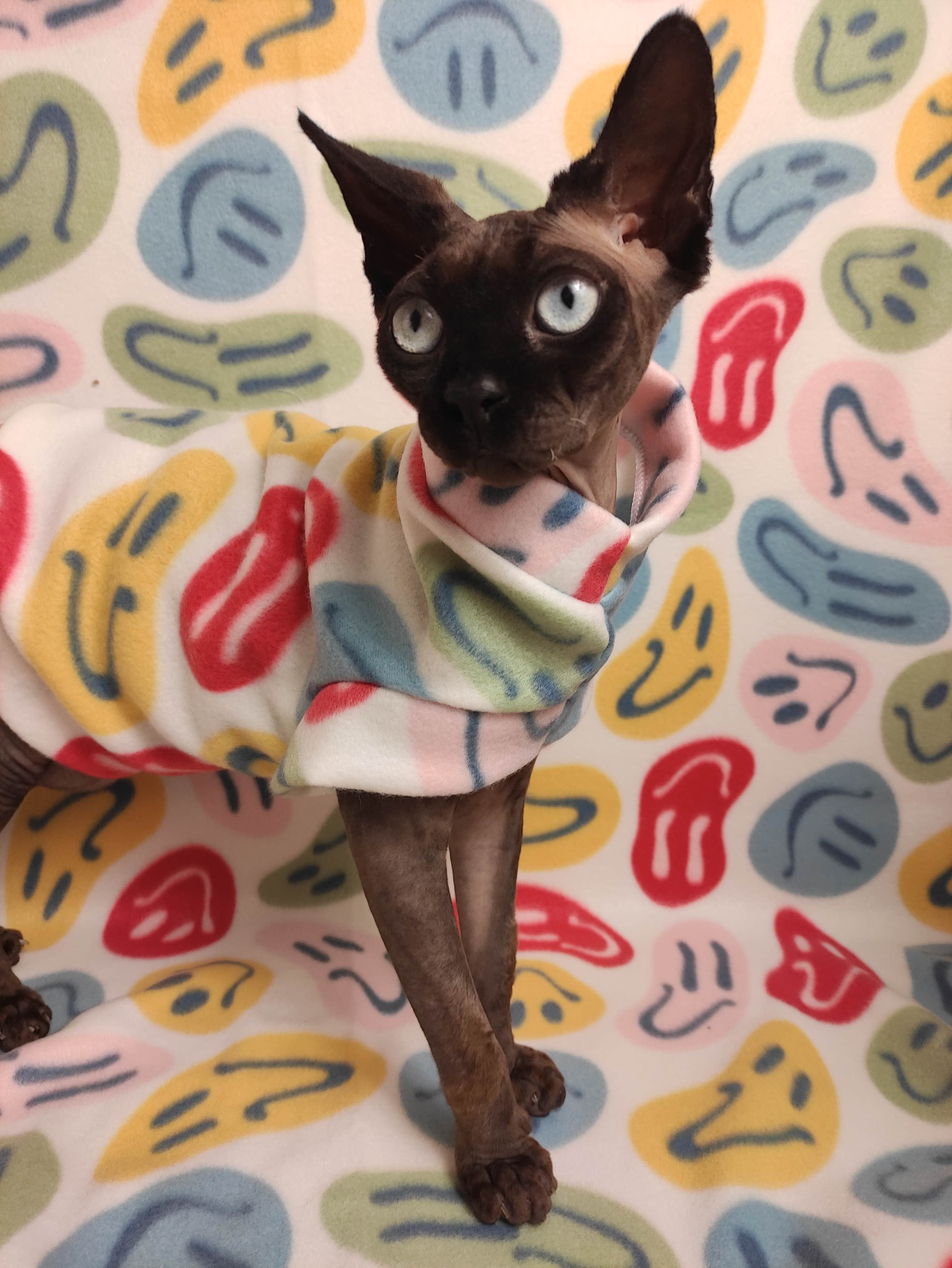 REGULAR size is for most adult hairless cats age 1 to 18. BAMBINO size fits hairless kittens age 6 months to 1 year and smaller adult cats. LIL NIPPER size fits hairless kittens age 8 weeks to 15 week olds for when they are with the breeder or for the trip home. Custom orders are welcome for larger and smaller cats - pricing is the same - $27.50