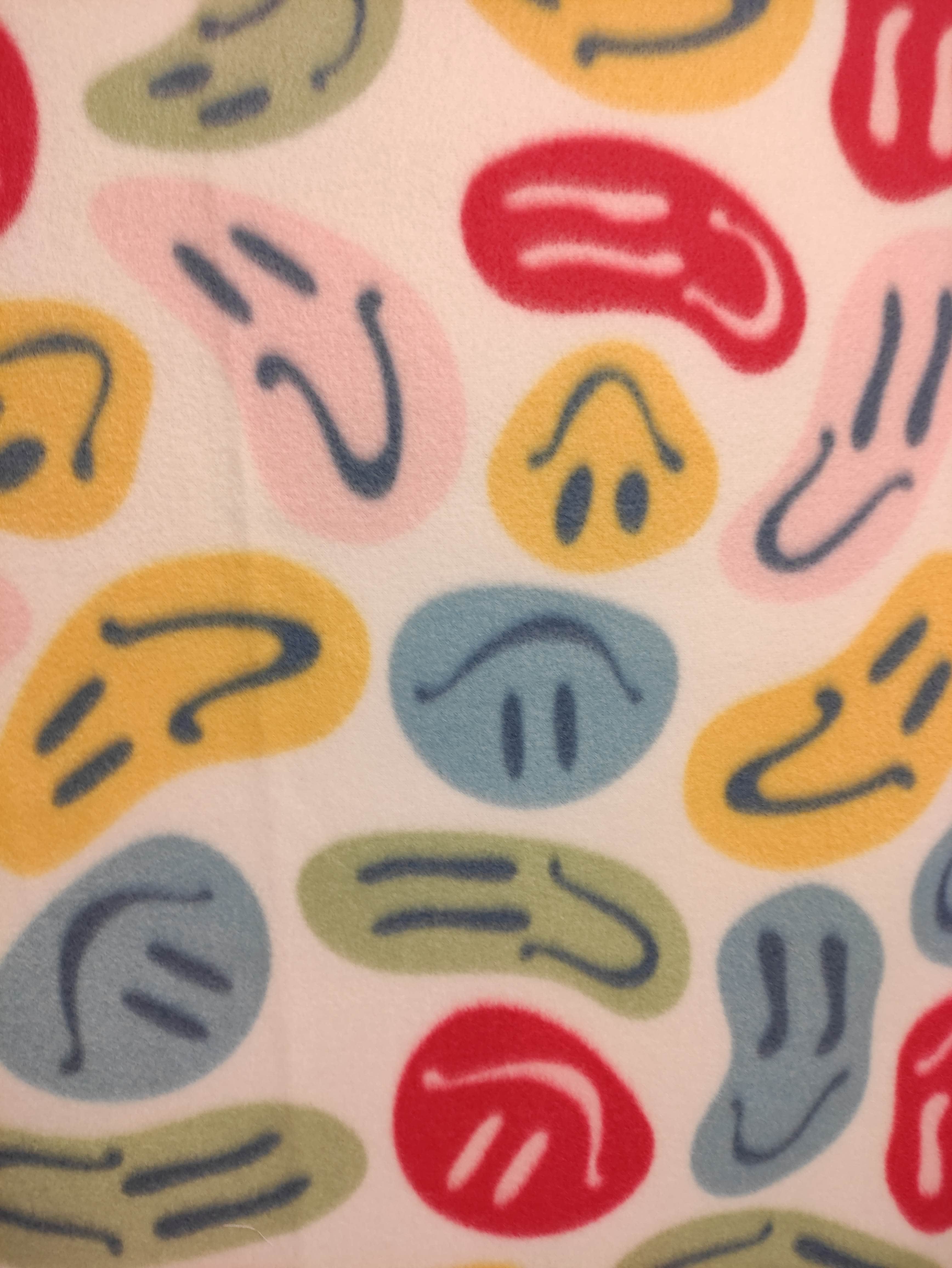 This is a soft medium weight stretchy fleece with empty smiley faces on white background. Print is large and designs will be random.