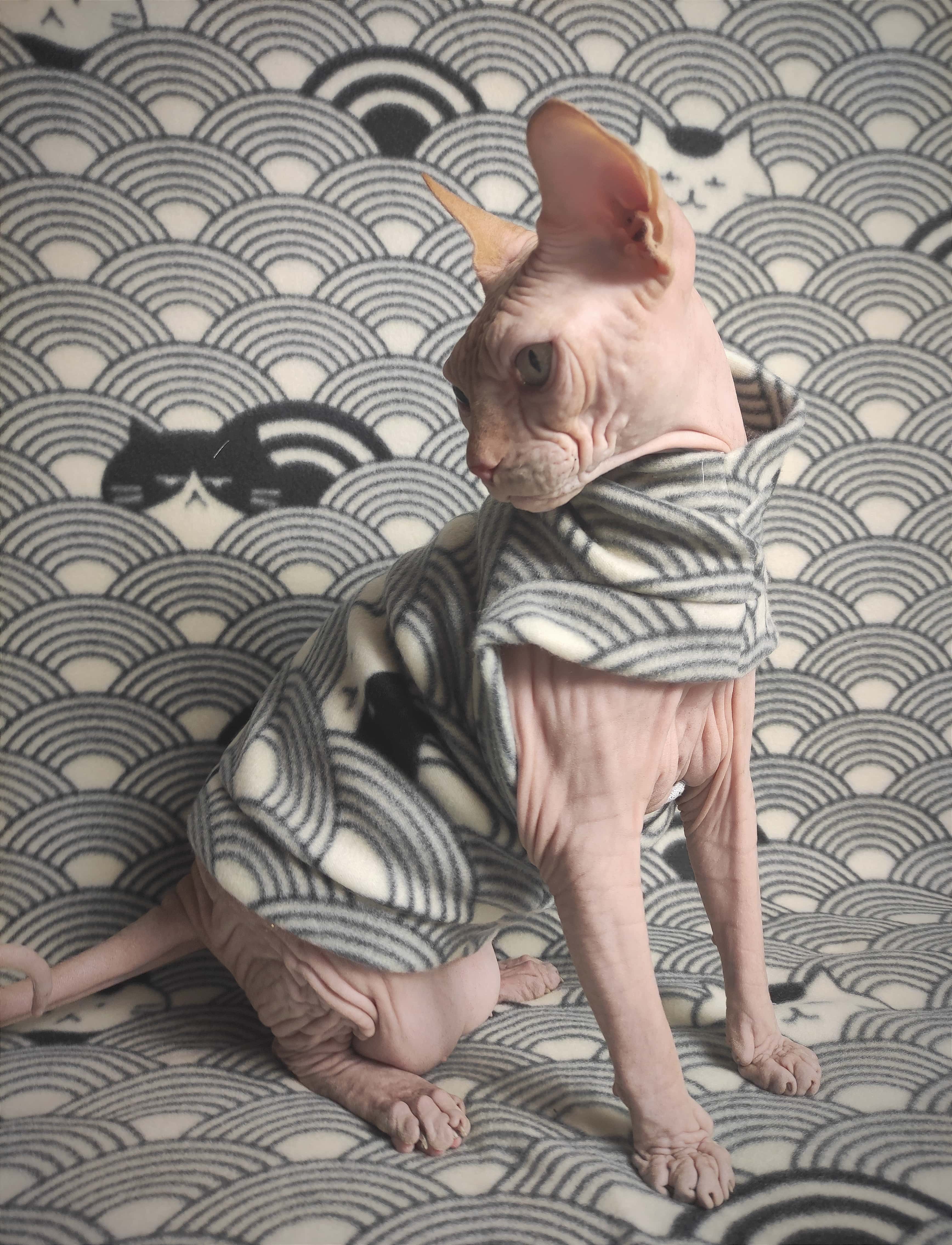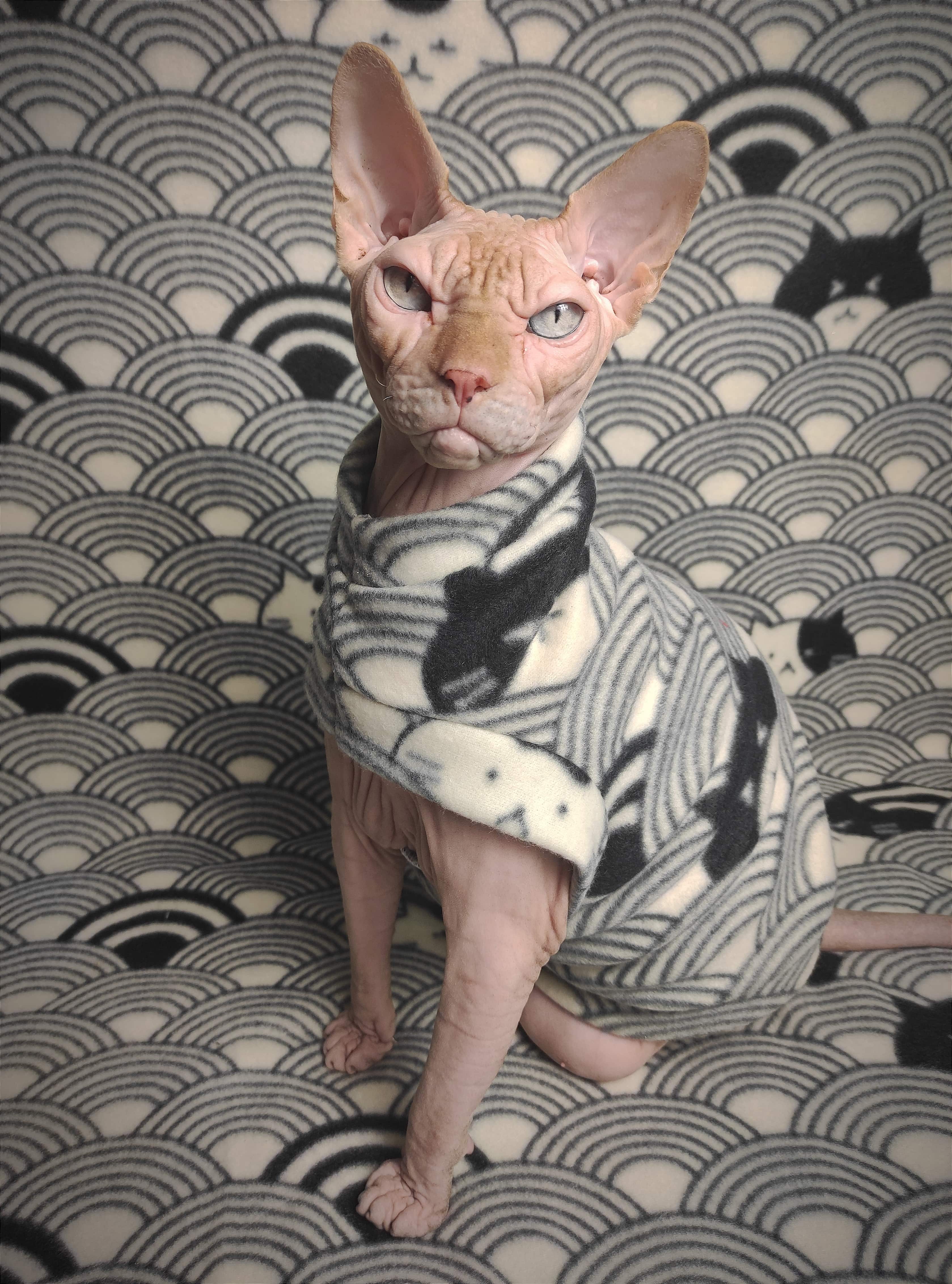 REGULAR size is for most adult hairless cats age 1 to 18. BAMBINO size fits hairless kittens age 6 months to 1 year and smaller adult cats. LIL NIPPER size fits hairless kittens age 8 weeks to 15 week olds for when they are with the breeder or for the trip home. Custom orders are welcome for larger and smaller cats - pricing is the same - $27.50