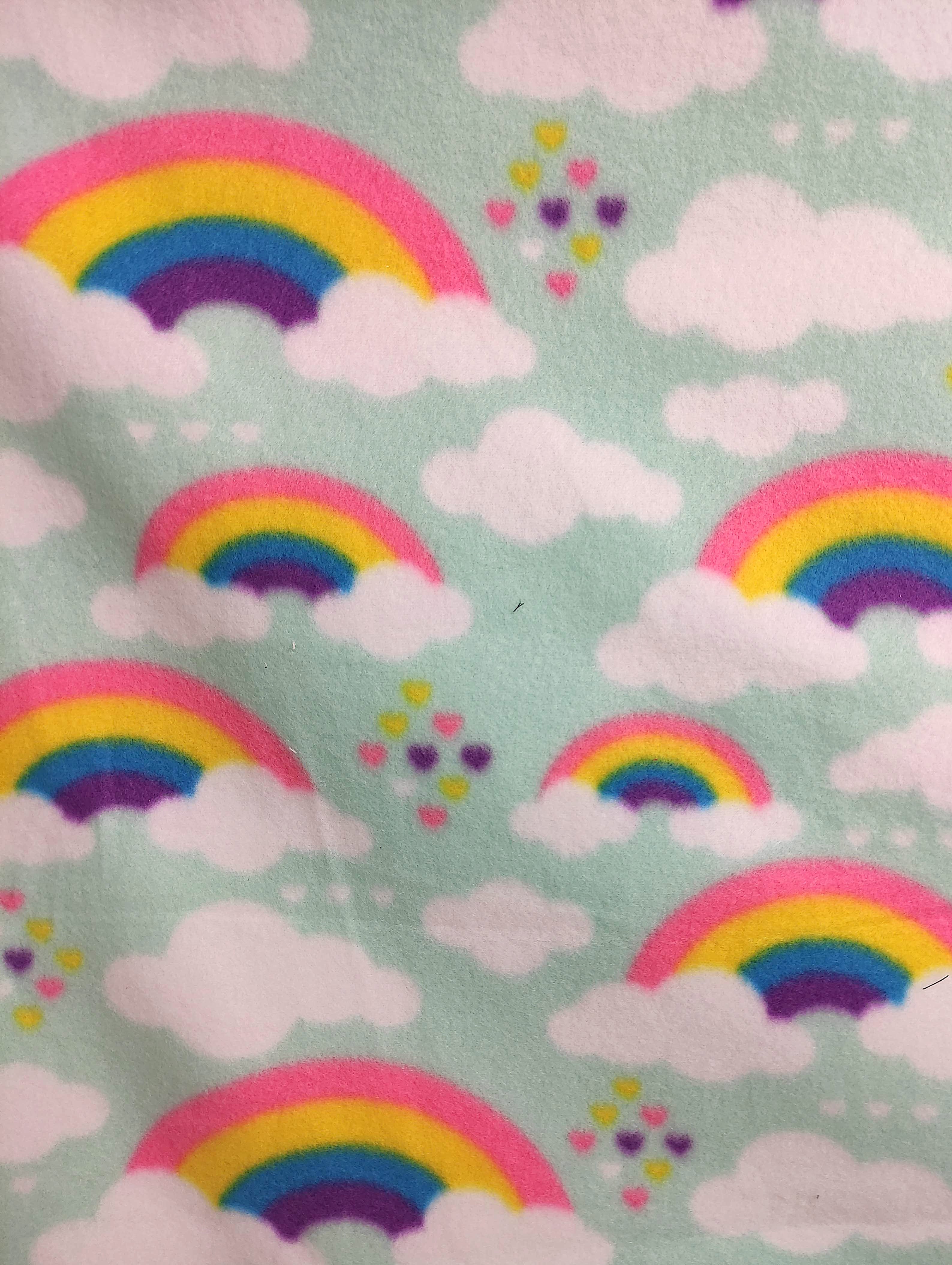 This is a soft medium weight stretchy fleece with neon rainbows, clouds and little hearts on blue sky background 😻
