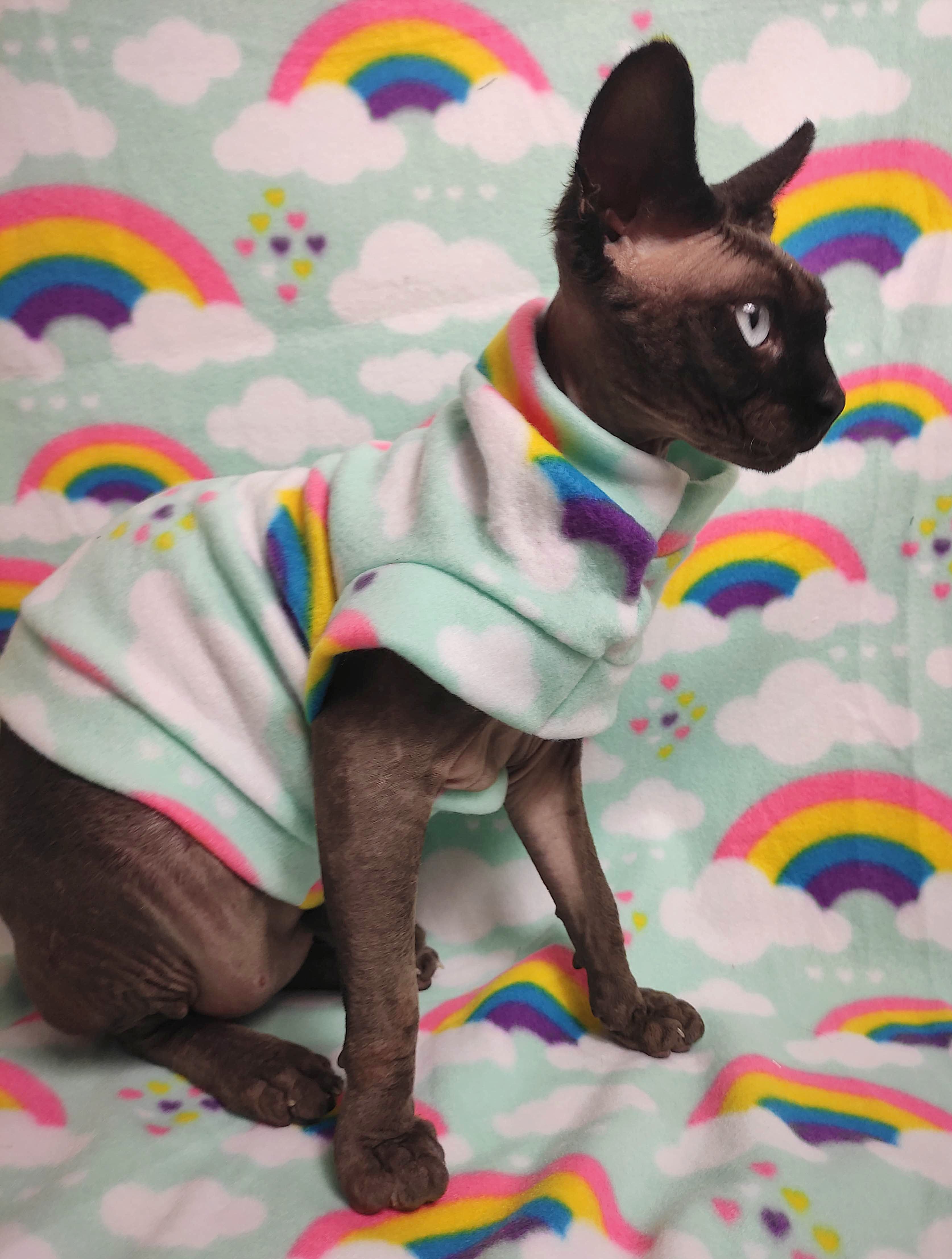 REGULAR size is for most adult hairless cats age 1 to 18. BAMBINO size fits hairless kittens age 6 months to 1 year and smaller adult cats. LIL NIPPER size fits hairless kittens age 8 weeks to 15 week olds for when they are with the breeder or for the trip home. Custom orders are welcome for larger and smaller cats - pricing is the same - $27.50