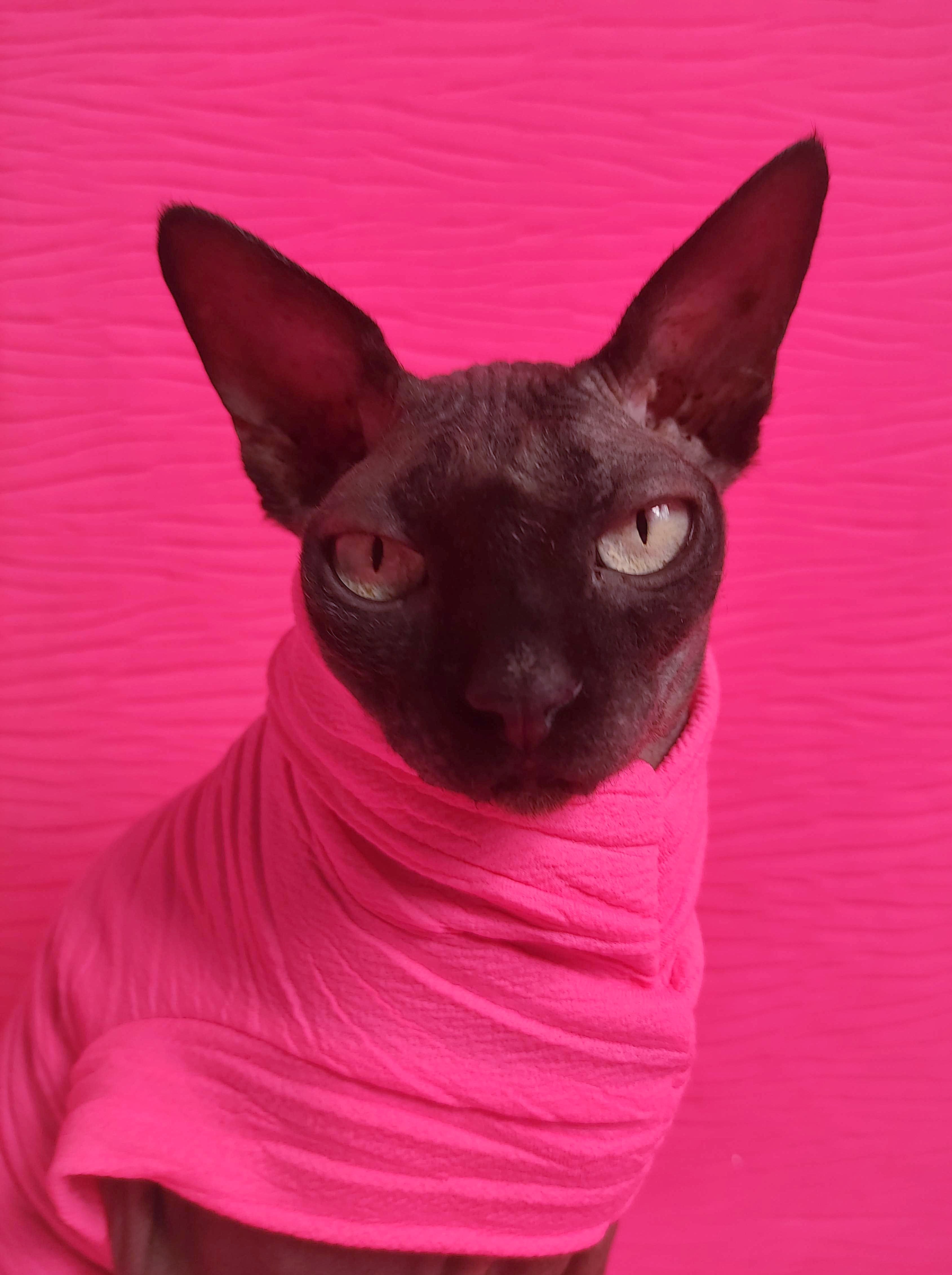 REGULAR size is for most adult hairless cats age 1 to 18. BAMBINO size fits hairless kittens age 6 months to 1 year and smaller adult cats. ANKLE BITER size fits kittens 15 weeks to 6 month olds. LIL NIPPER size fits hairless kittens age 8 weeks to 15 week olds for when they are with the breeder or for the trip home. Custom orders are welcome for larger and smaller cats - pricing is the same - $27.50