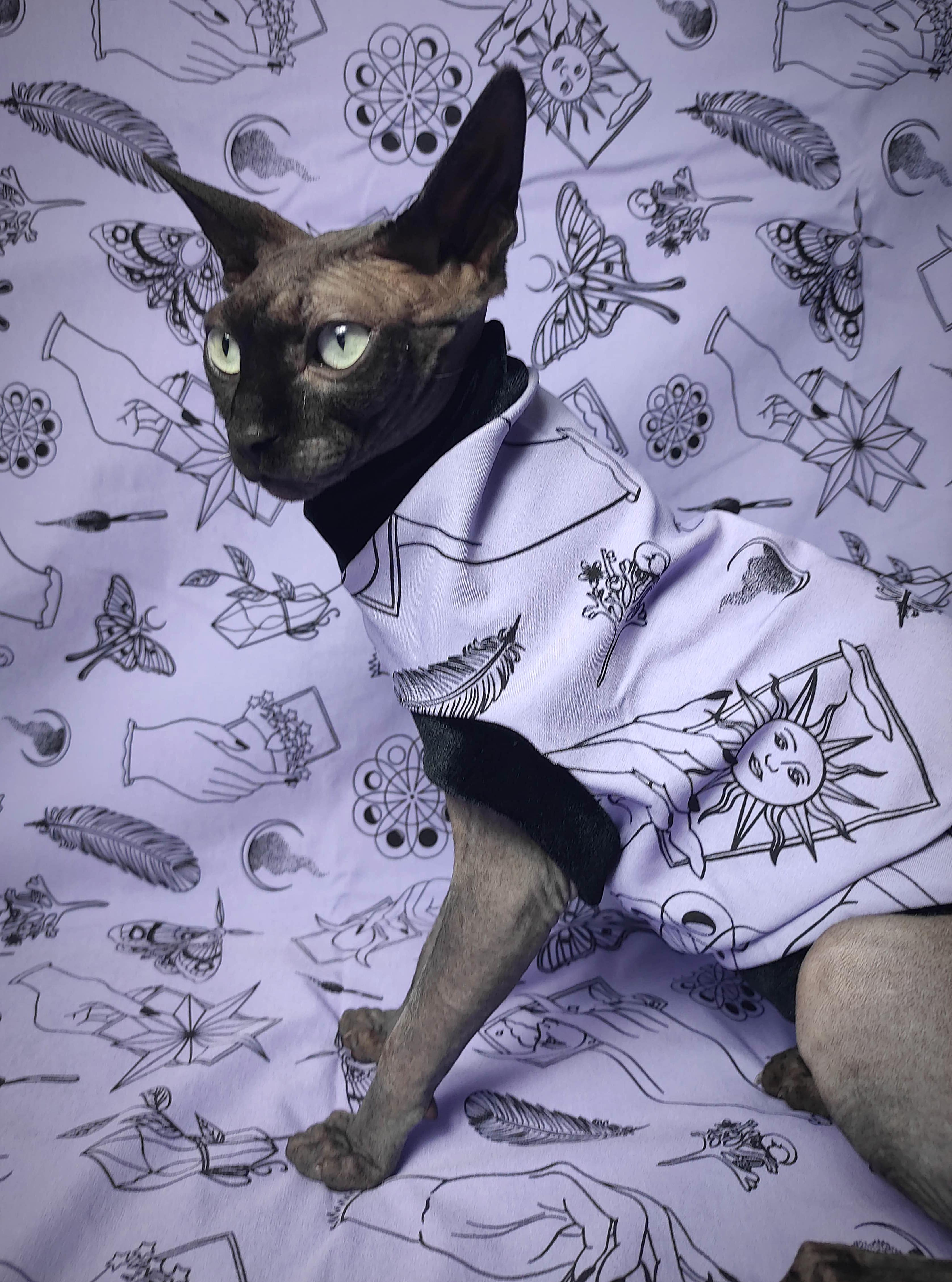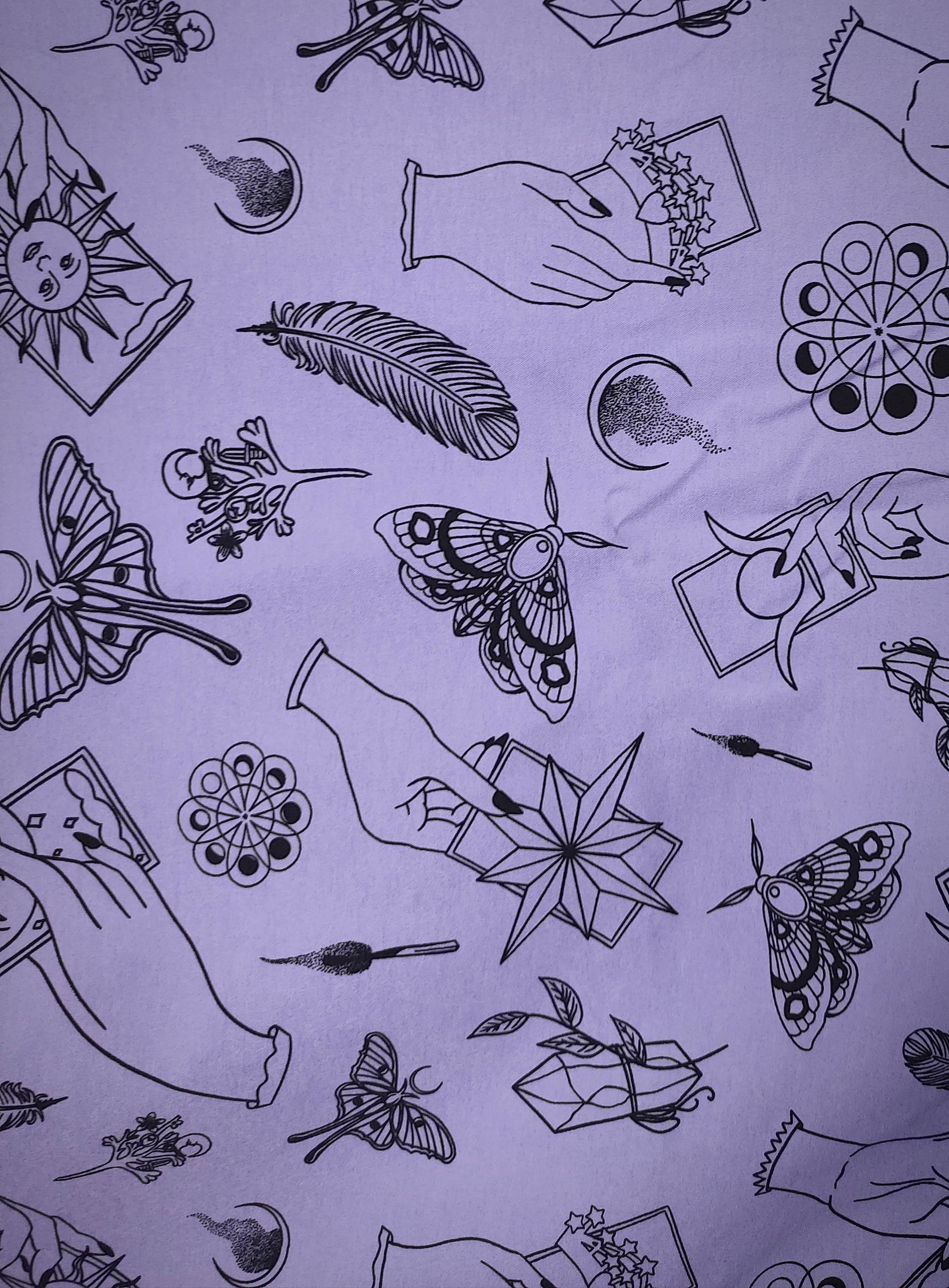 This is an amazing lightweight cotton sateen fabricfeaturing illustrations of celestial and nature-inspired elements, including moths, hands, feathers, stars, sun, moon, and mandalas on lilac background, finished with black velvet trim 😻 Regular Size limited to only 8, Bambino Size is limited to only 7, Ankle Biter Size is limited to 2. Lil Nipper Size is limited to 2. No more will be made when they are gone.