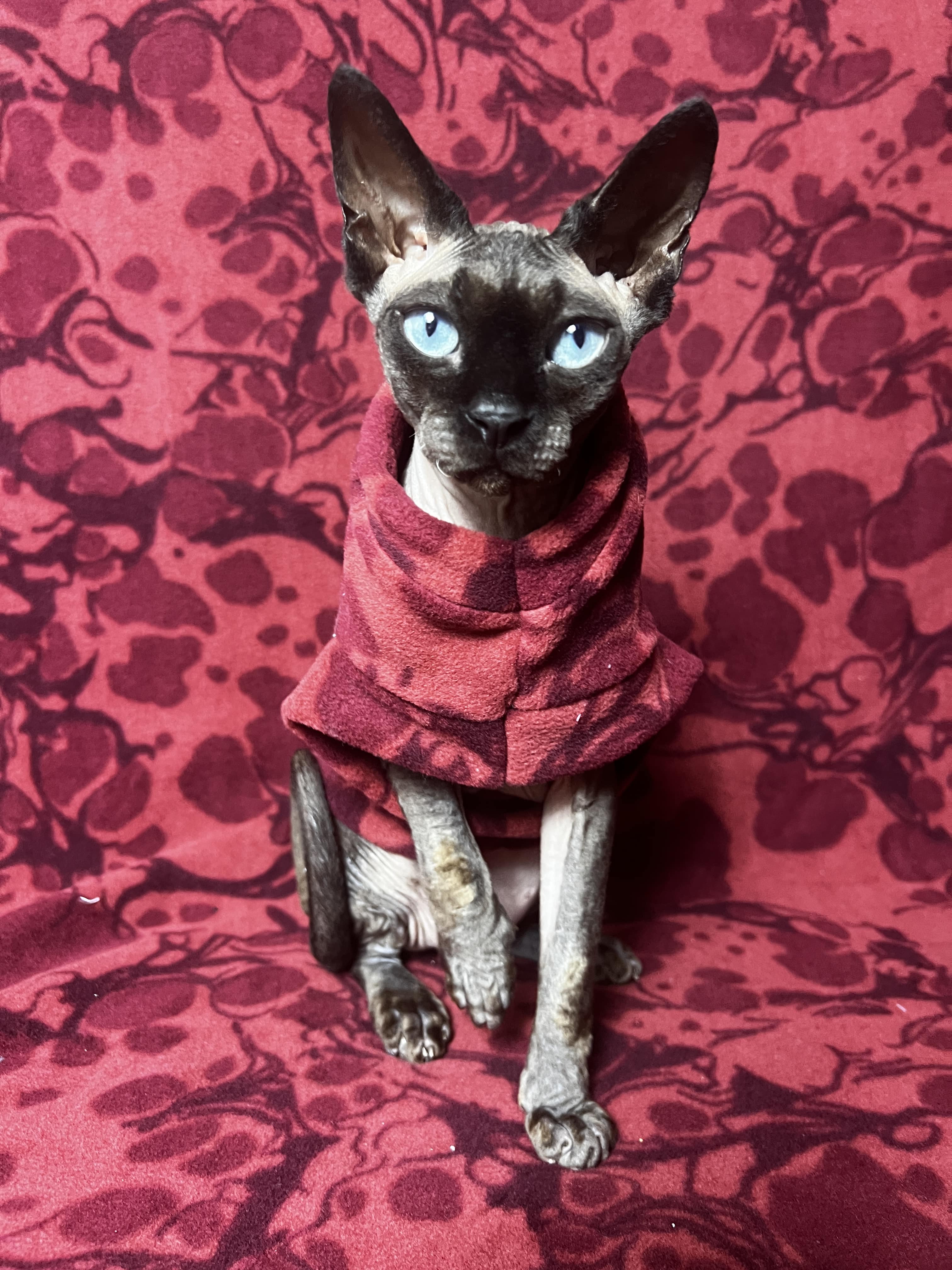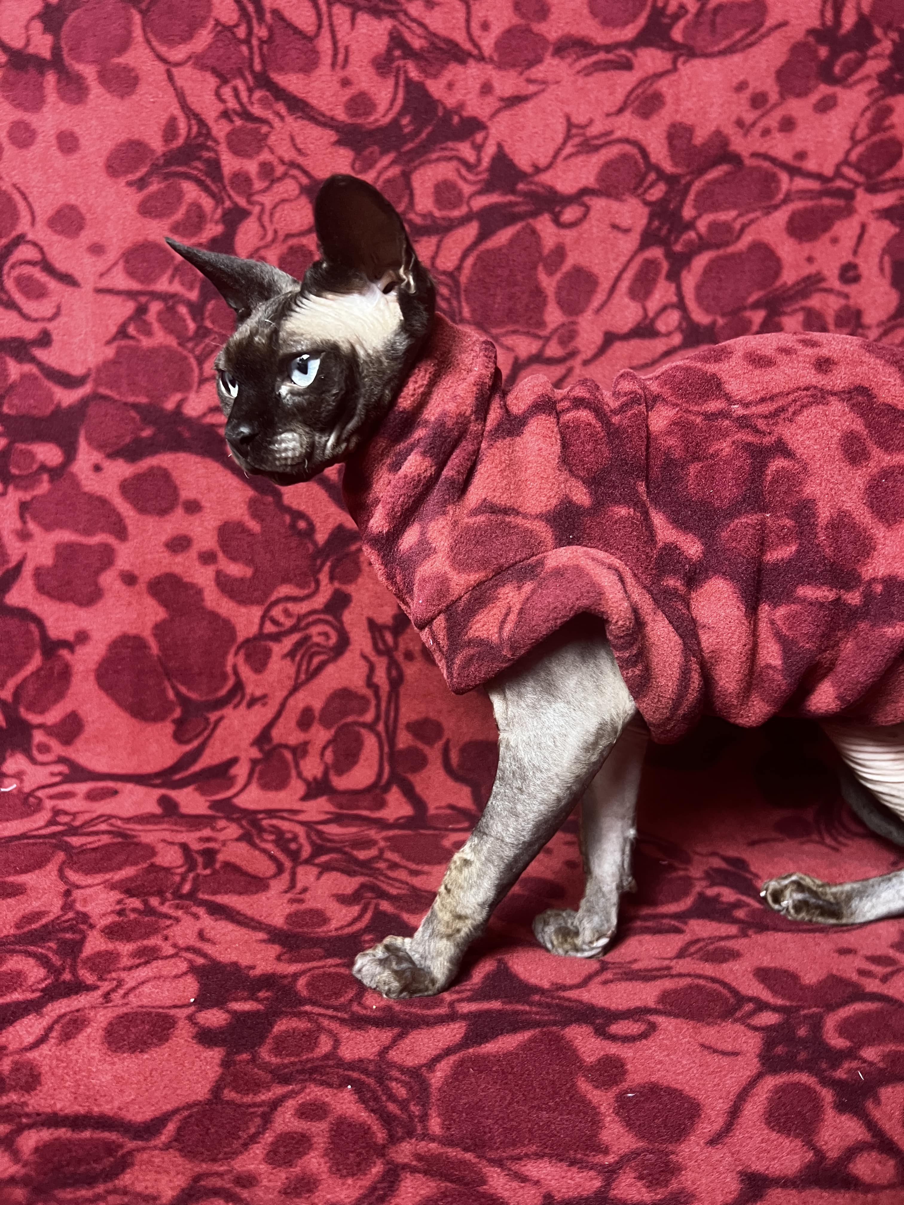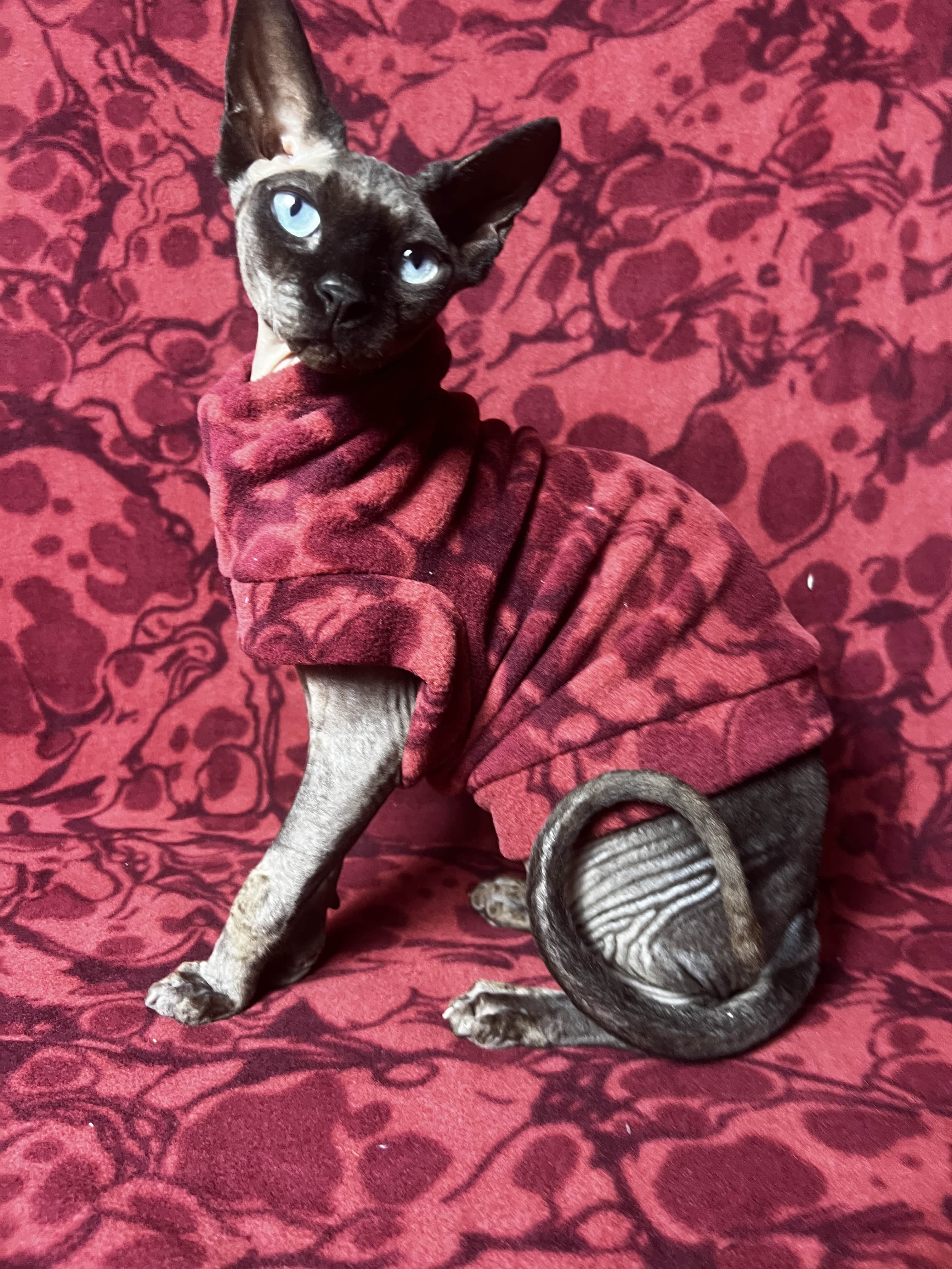 REGULAR size is for most adult hairless cats age 1 to 18. BAMBINO size fits hairless kittens age 6 months to 1 year and smaller adult cats. LIL NIPPER size fits hairless kittens age 8 weeks to 15 week olds for when they are with the breeder or for the trip home. Custom orders are welcome for larger and smaller cats - pricing is the same - $27.50
