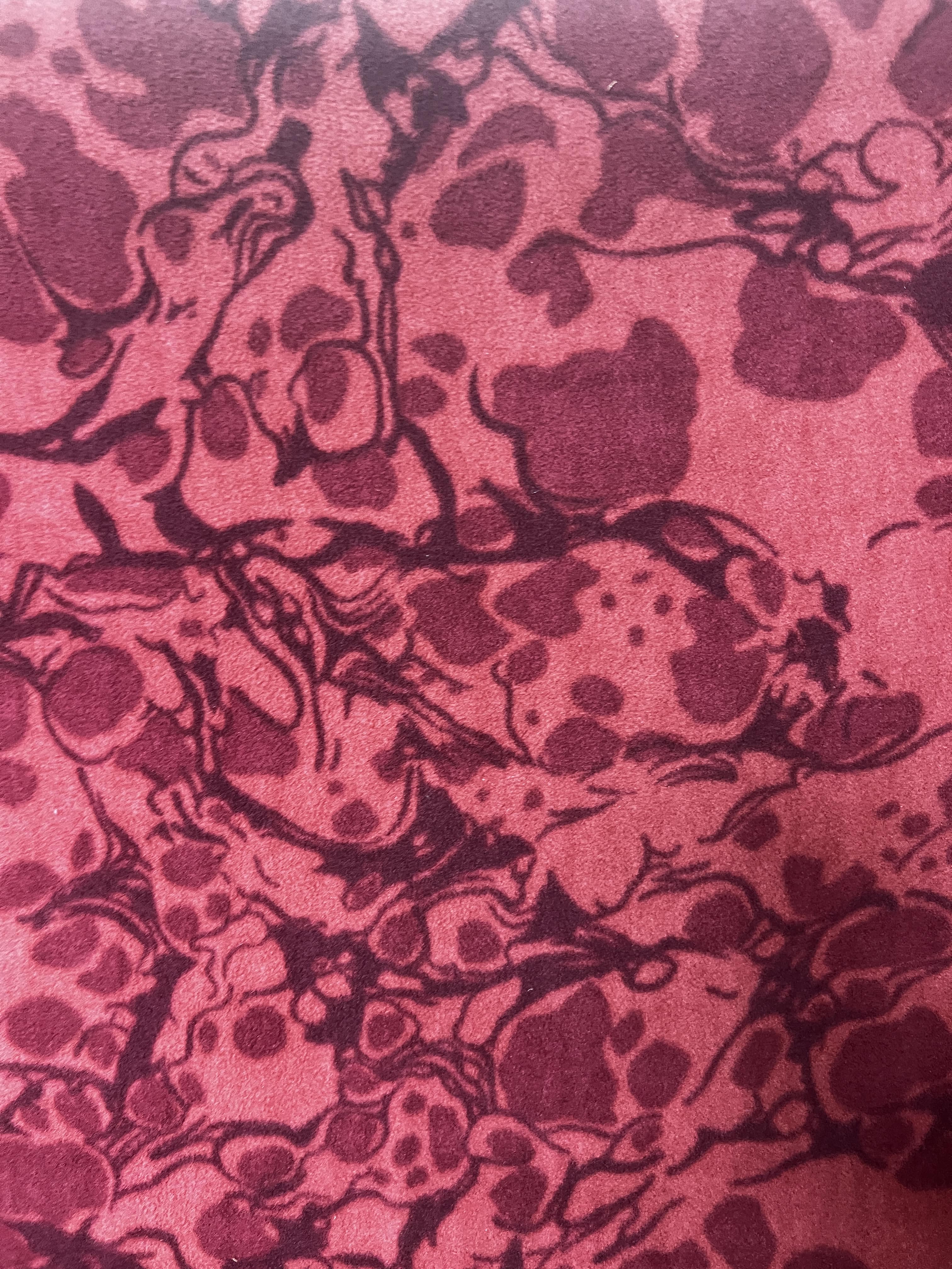 This is a soft heavyweight stretchy luxe fleece with biomorphic red, maroon, oxblood patterns. Print is large and designs will be random.