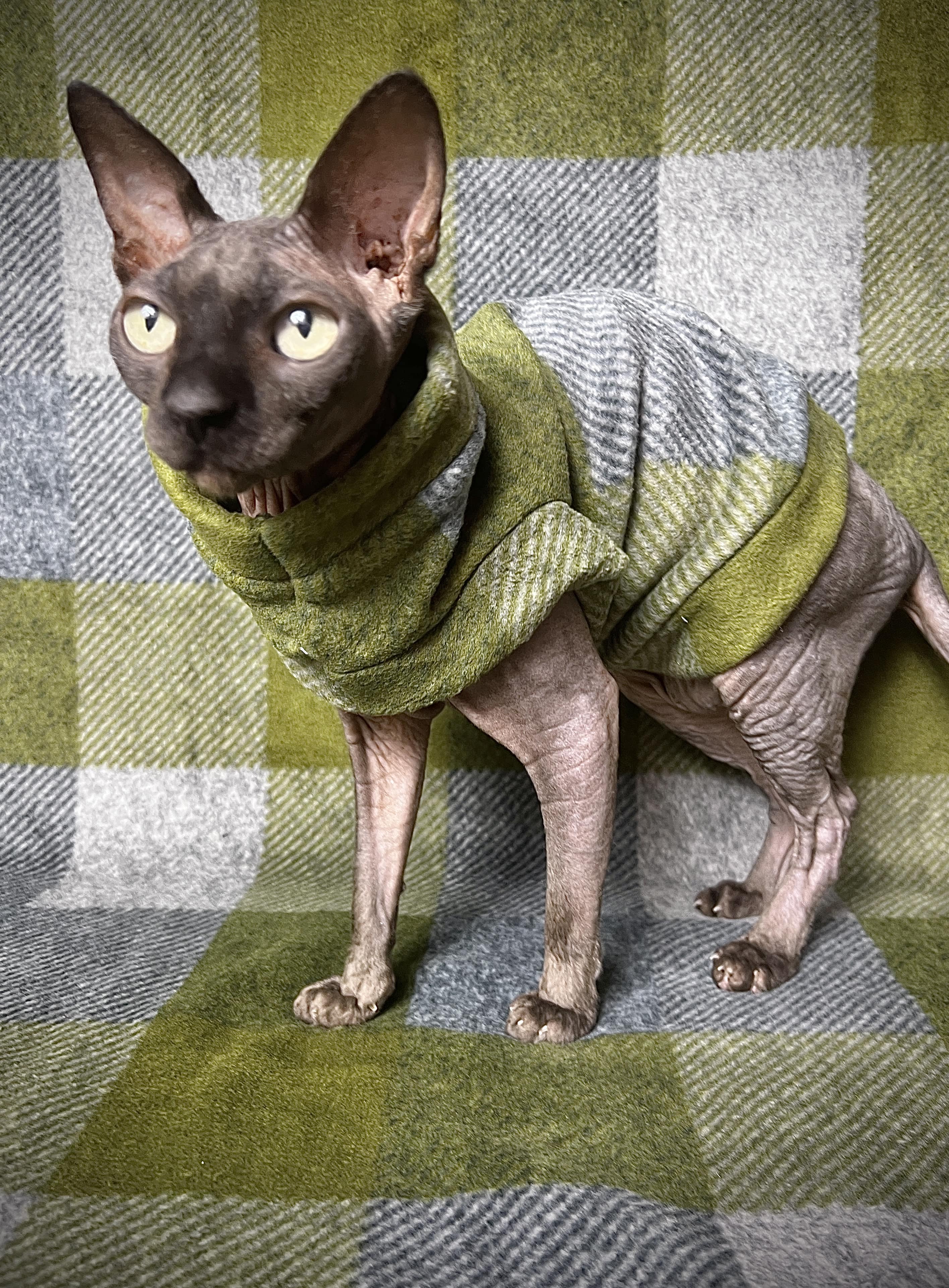 These sweaters fit like no other sweaters. Our original pattern has one hole for both front legs rather than individual holes. The unique design makes it easy to put on and take off, while allowing for improved mobility of your cat. No annoying Velcro anywhere. No awkward walking. All sweaters are machine washable and dryer safe unless specifically mentioned.