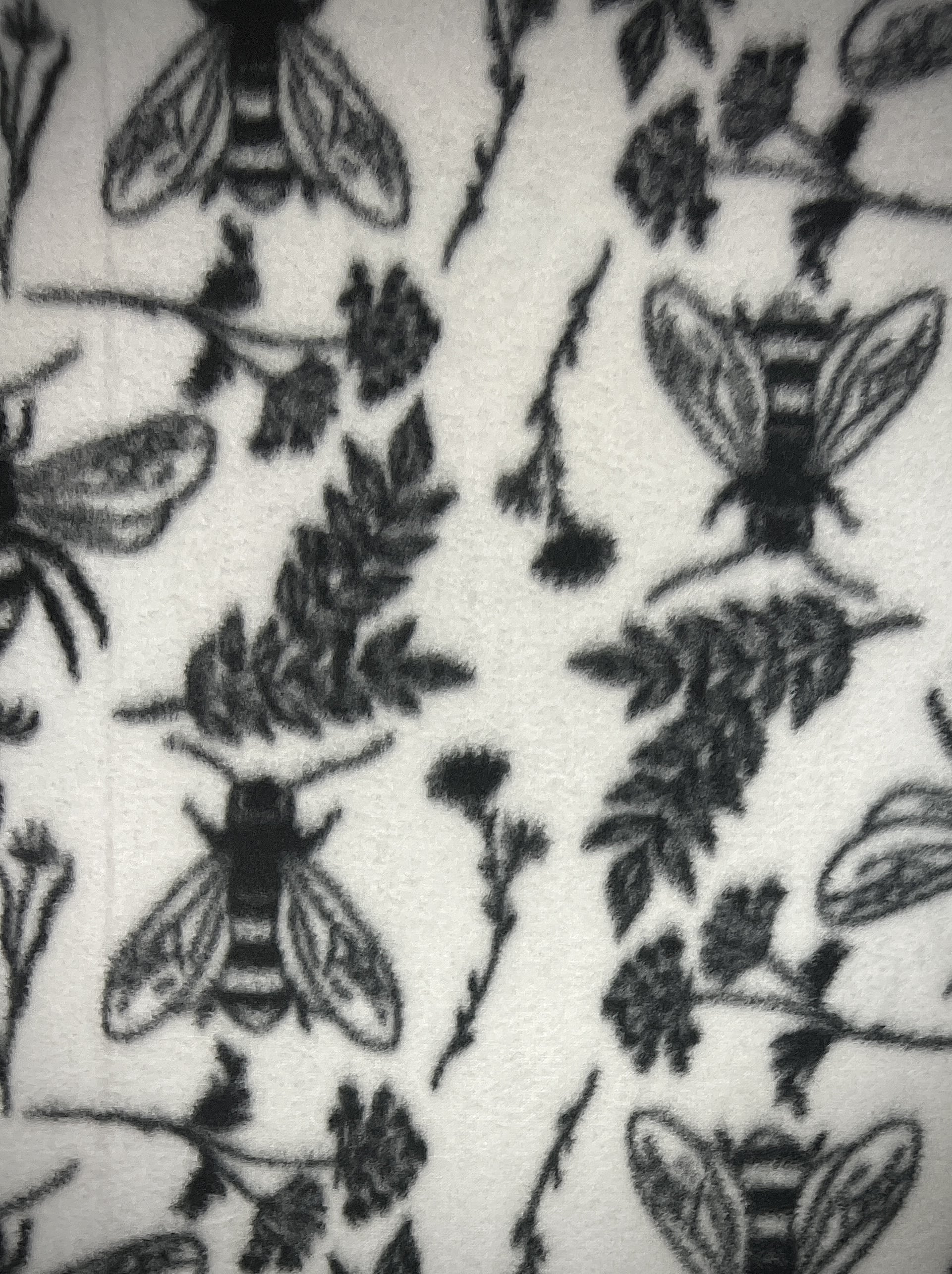 This is a soft heavyweight stretchy luxe fleece with bees and royal patterns on white background with soft black trim. Print is large and designs will be random.