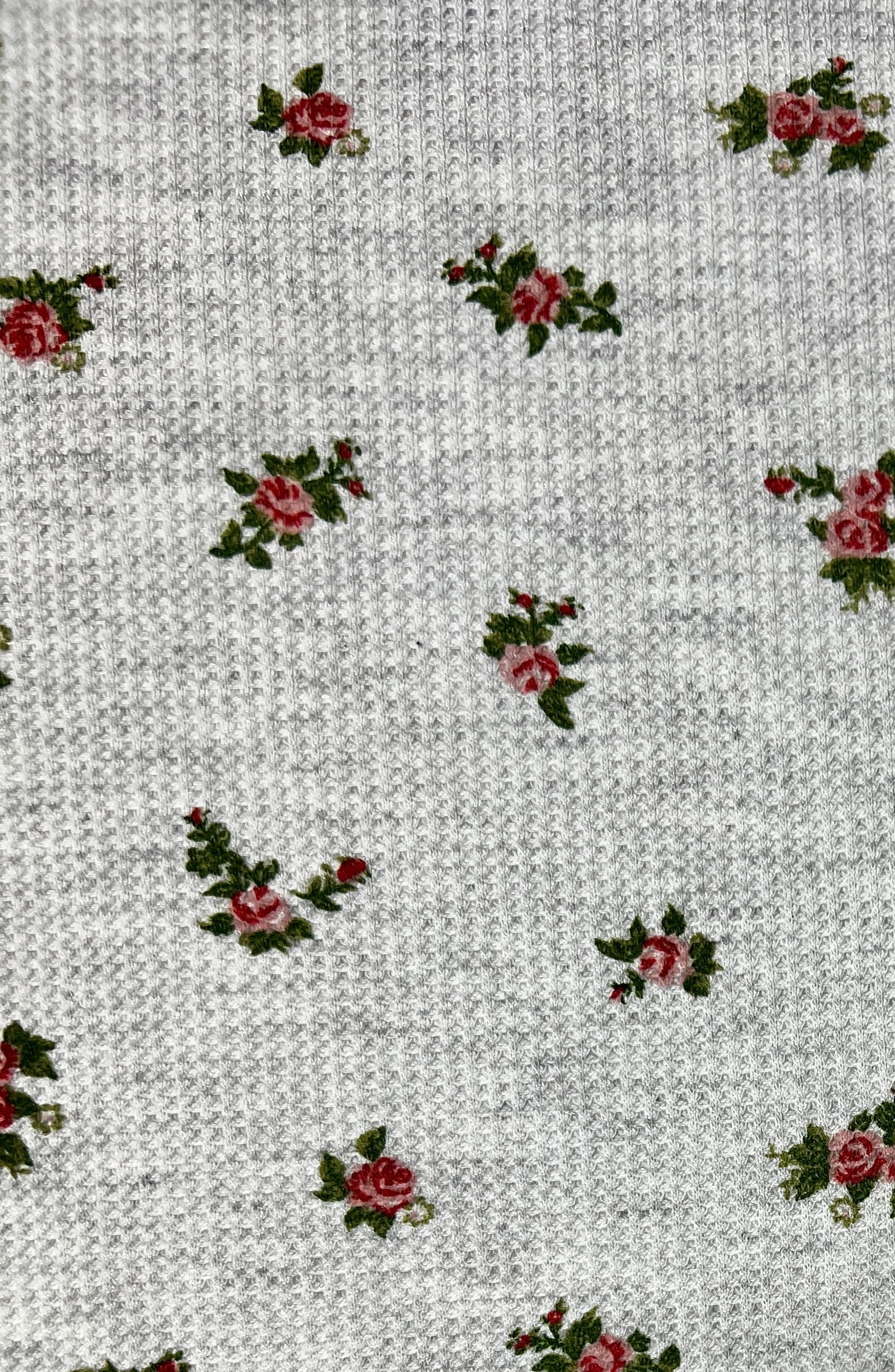This is a stretchy midweight grey heather printed tiny rose thermal fabric. Regular Size limited to only 9. Bambino Size limited to only 8. Ankle Biter Size limited to only 2. Lil Nipper size limited to only 2. No more will be made when they are gone.