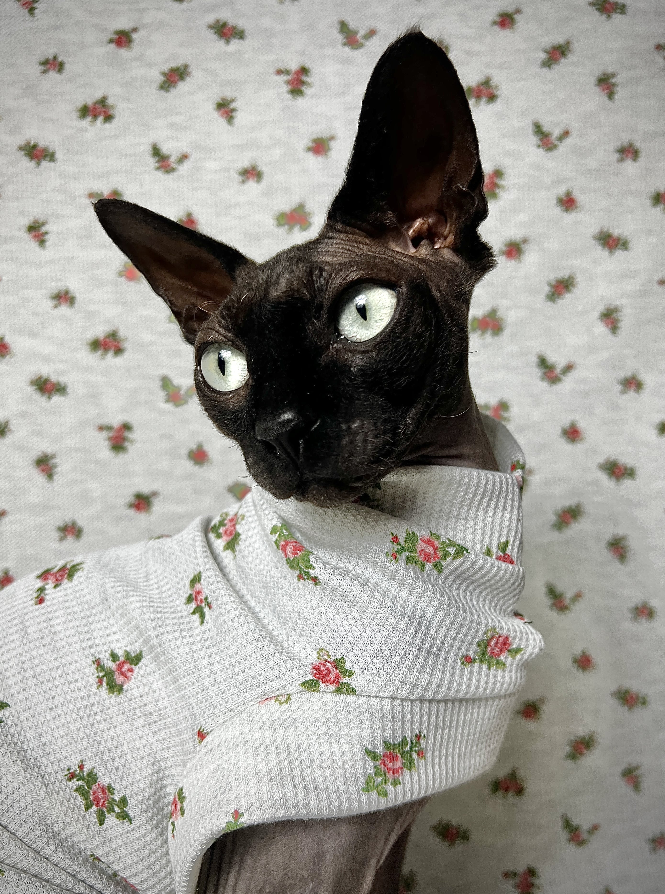These sweaters fit like no other sweaters. Our original pattern has one hole for both front legs rather than individual holes. The unique design makes it easy to put on and take off, while allowing for improved mobility of your cat. No annoying Velcro anywhere. No awkward walking. All sweaters are machine washable and dryer safe unless specifically mentioned.