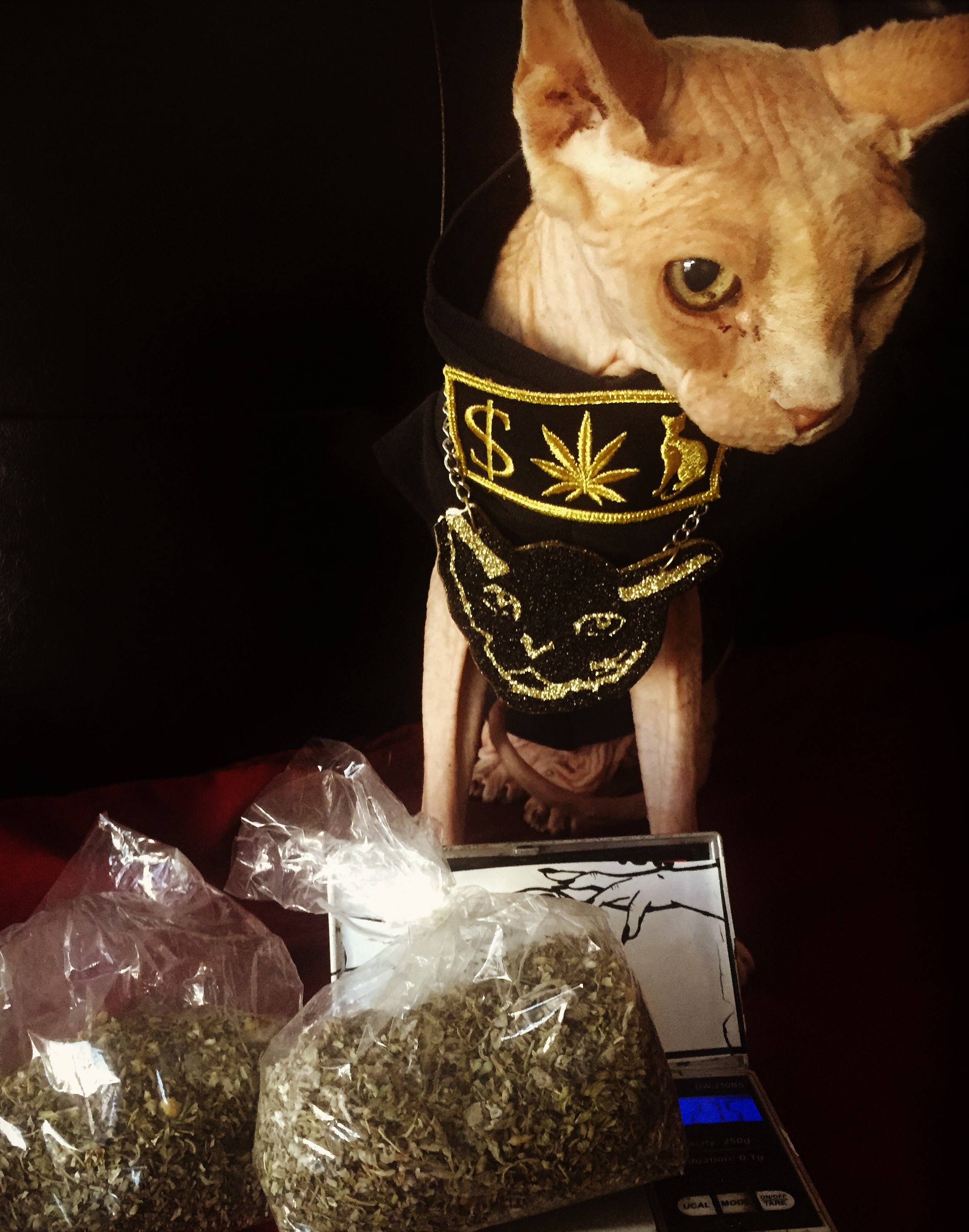 This is a Limited Edition upcycled cat shirt inspired by our friend Kreech (as shown as the model in the photos) This is a lightweight black t-shirt material with a gold or platinum patch sewn on the neck. The Gold and White Silver patches are limited to 17 each color. No more will be made when they are gone. Money, Pot, bling, diamonds and cats not included!