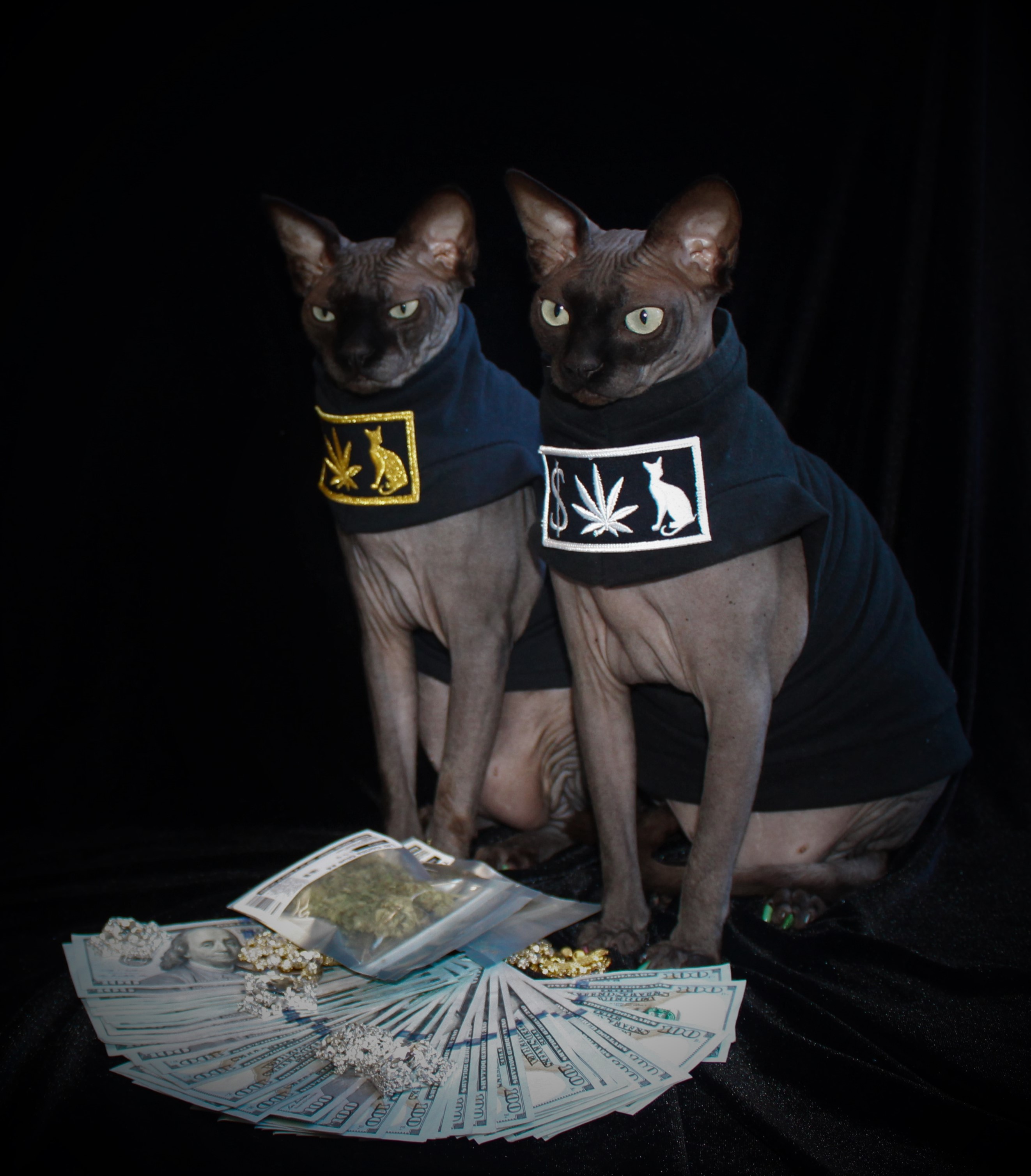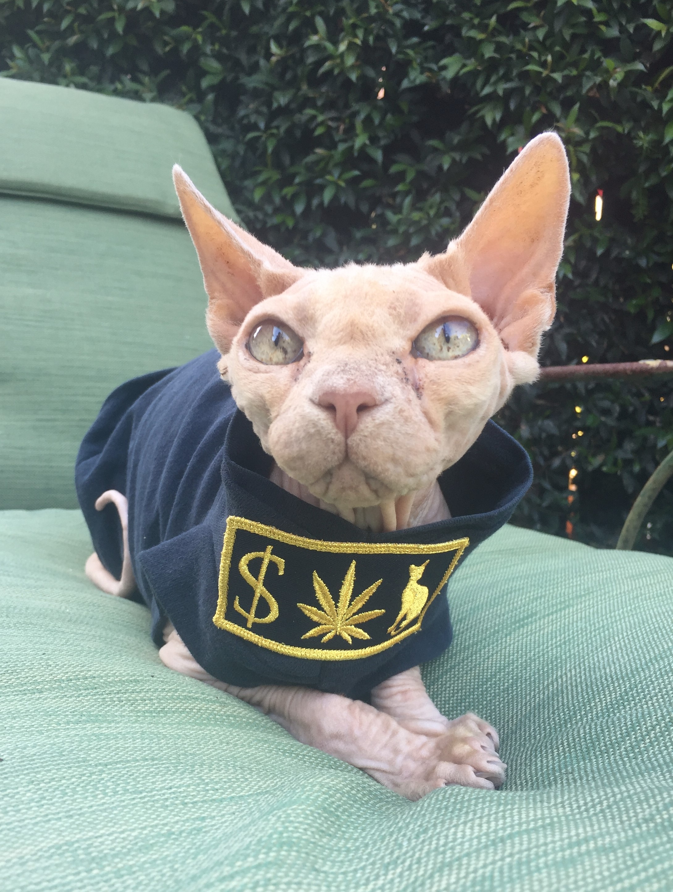 This is a Limited Edition upcycled cat shirt inspired by our friend Kreech (as shown as the model in the photos) This is a heavyweight black sweatshirt fleece material with a gold or platinum patch sewn on the neck. The Gold and White Silver patches are limited to 17 each color. No more will be made when they are gone. Money, Pot, bling, diamonds and cats not included!