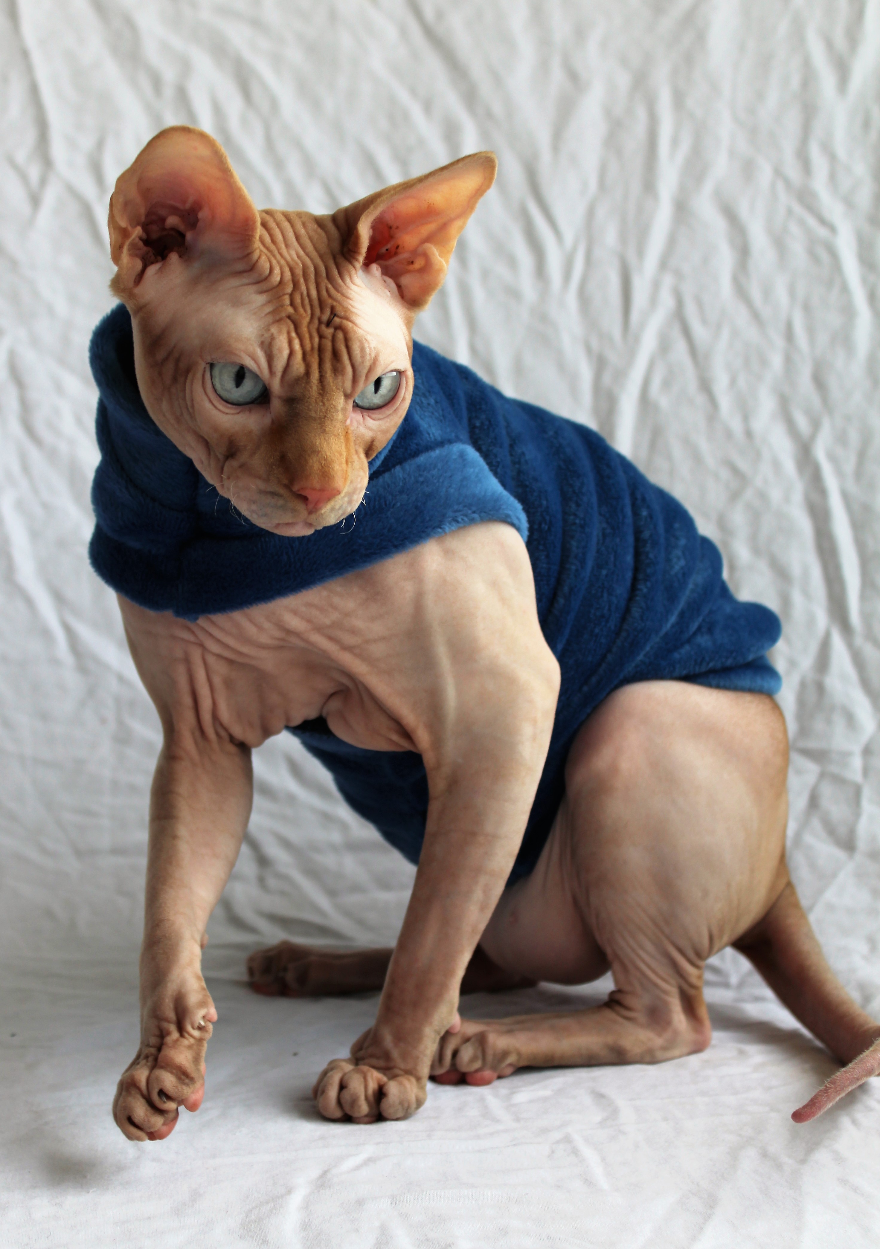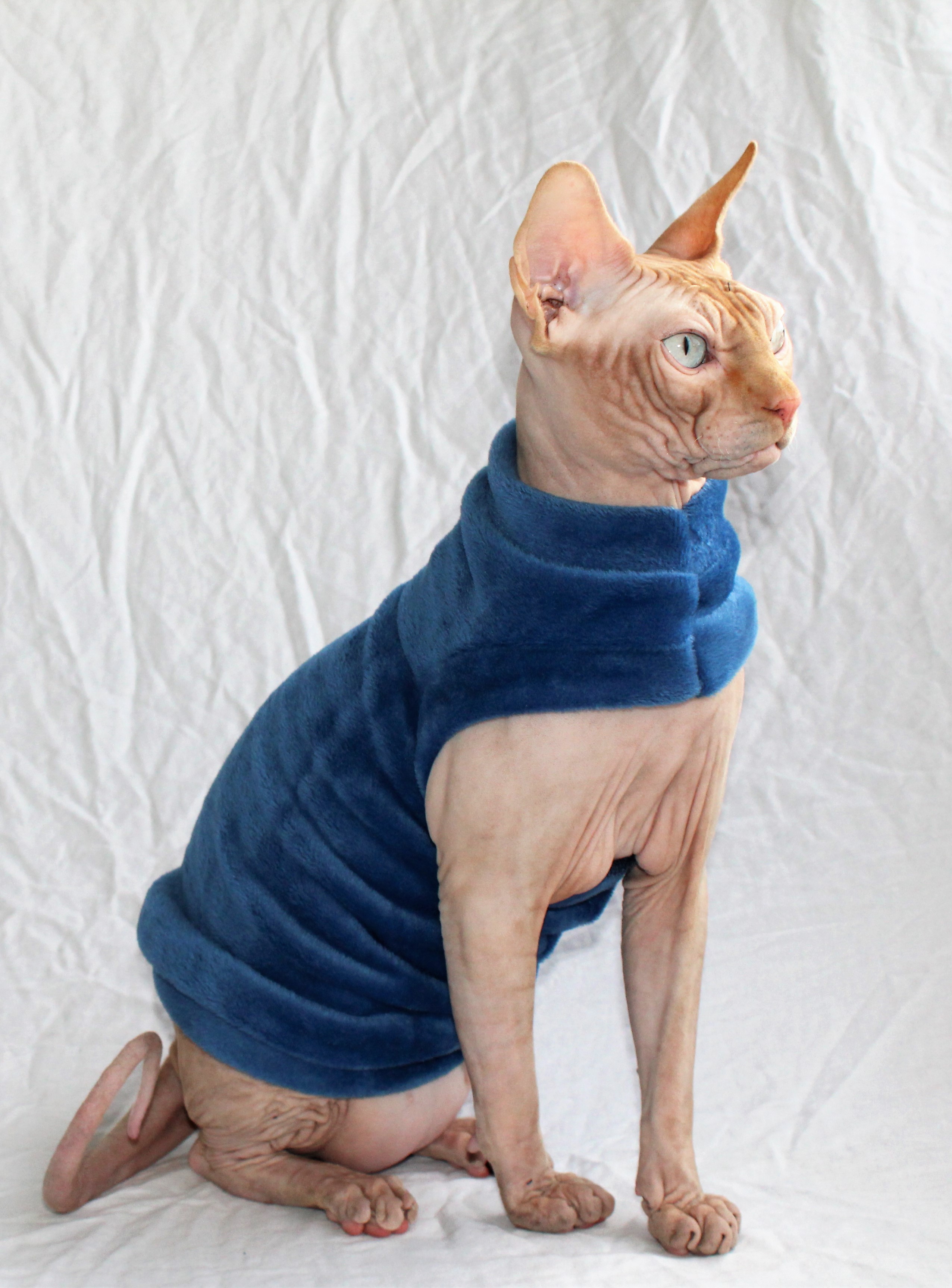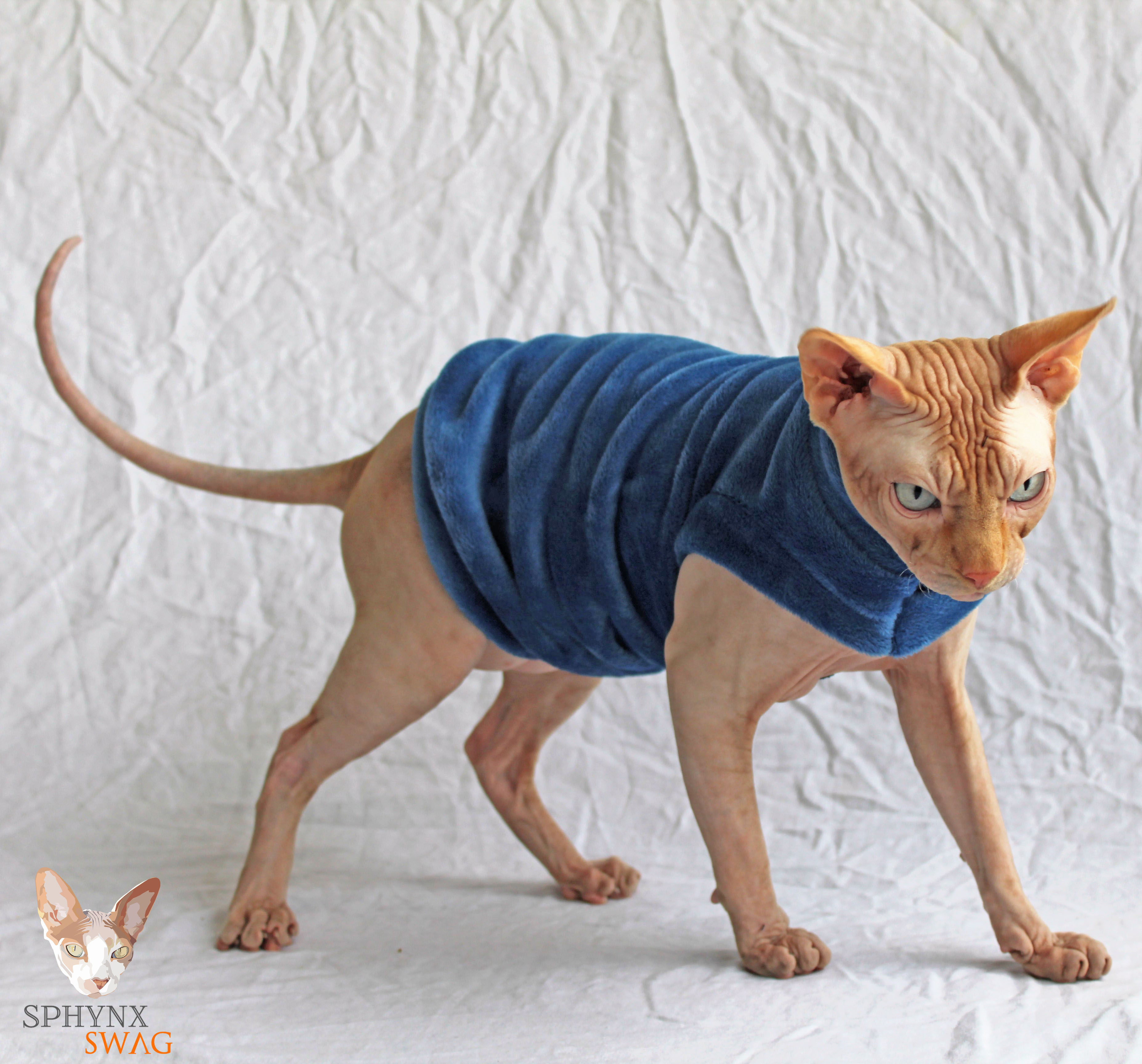 This is a heavy weight bright blue plush velour fabric. This fabric has stretch to it. This is a Limited Edition cat shirt / sweater for your hairless Sphynx / Devon Rex / Cornish Rex / Peterbald, and even for some of our stylish furry friends. Regular Size limited to only 6, Bambino Size is limited to only 2, Ankle Biter Size is limited to 1, Lil Nipper Size is limited to 1. No more will be made when they are gone.