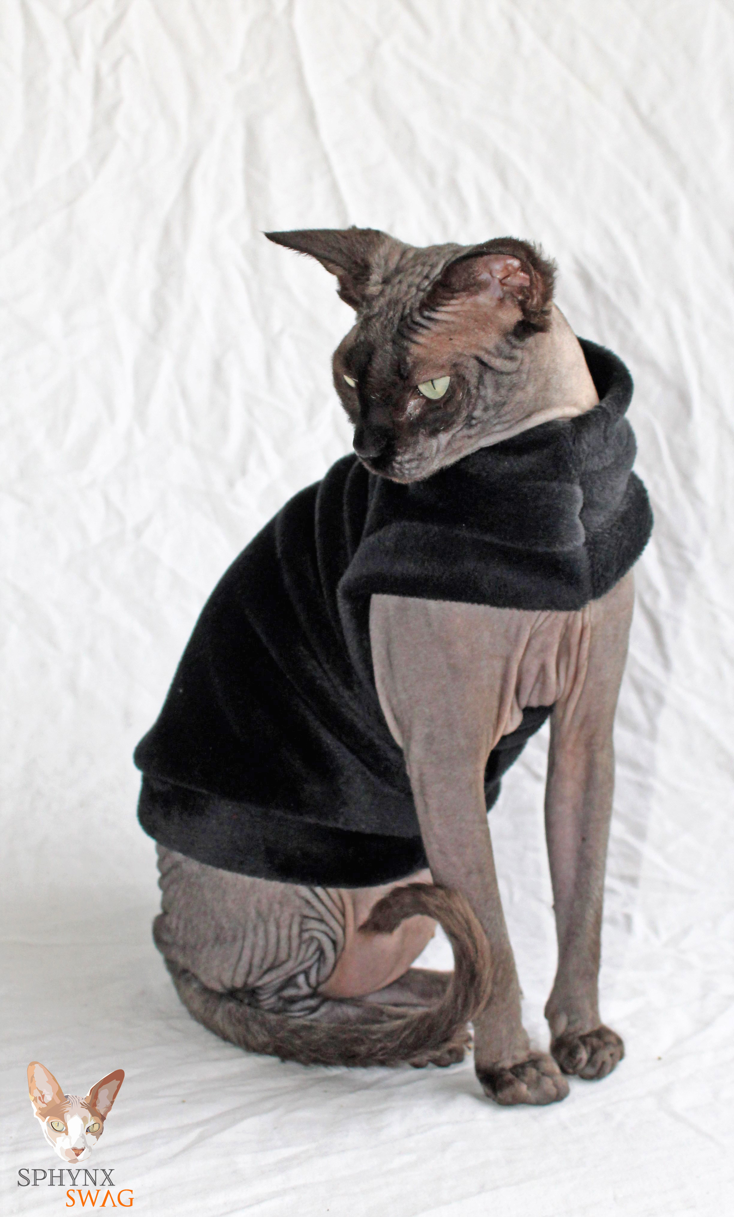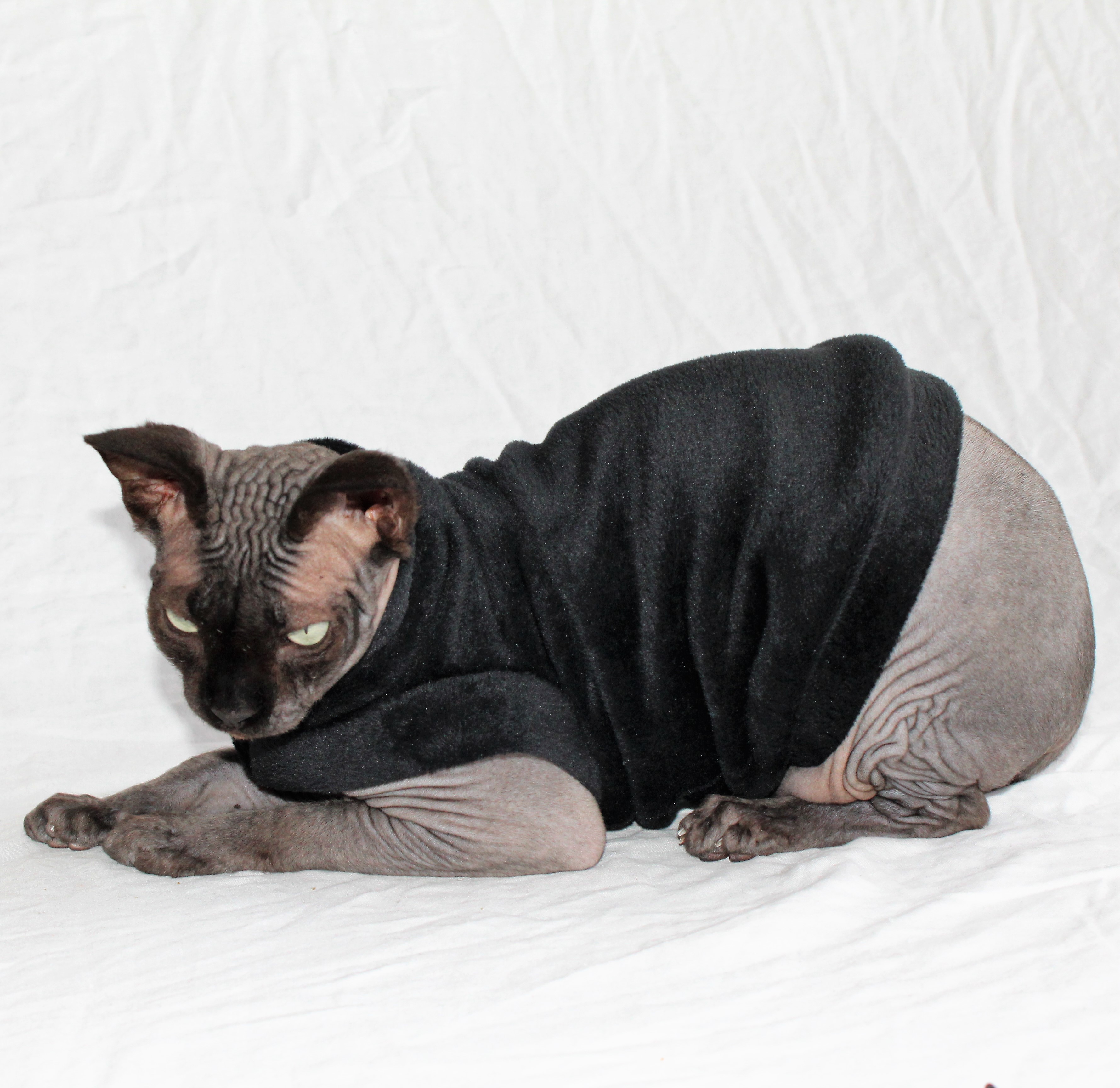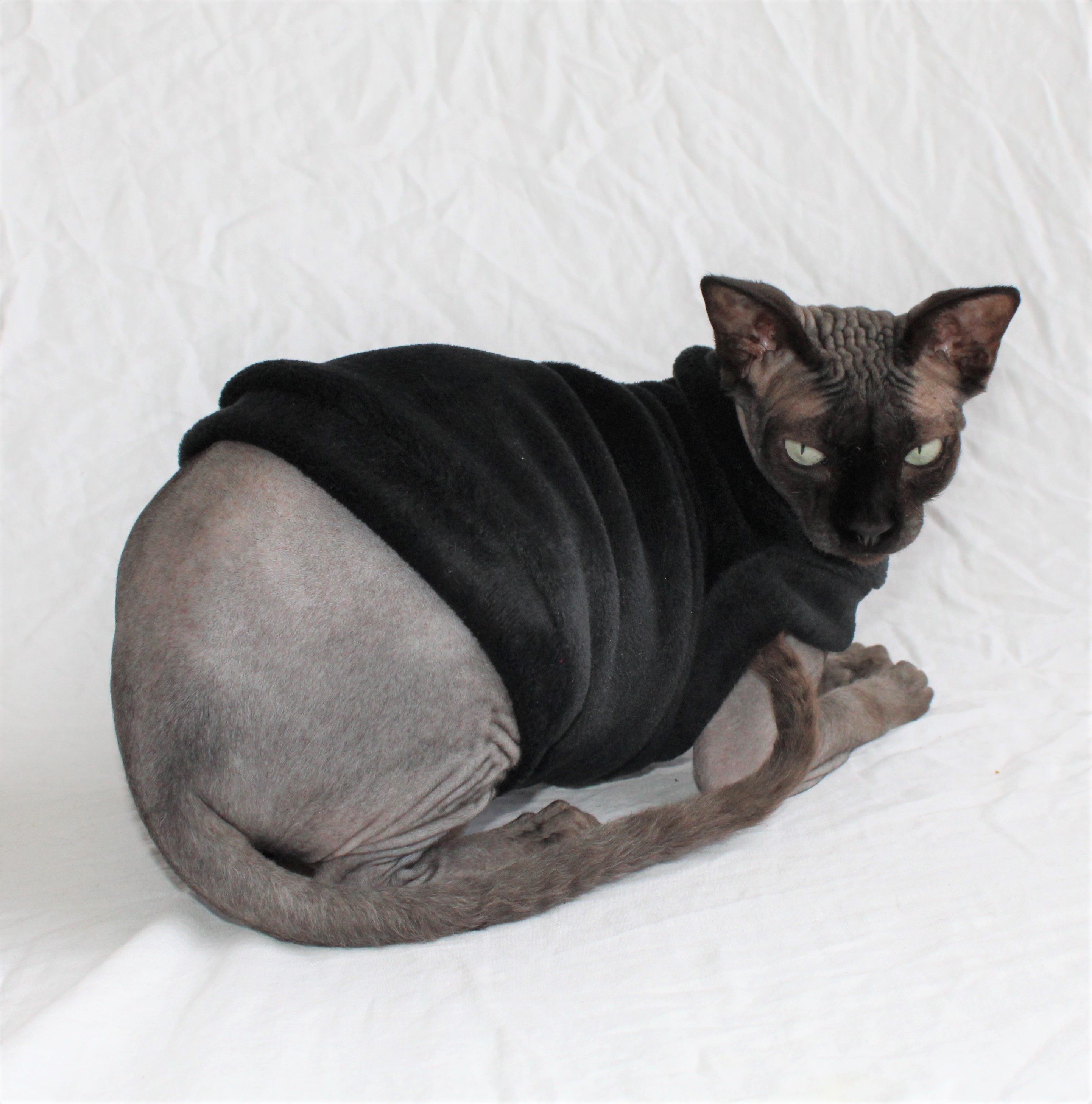 This is a heavy weight black plush velour fabric. This fabric has stretch to it. This is a Limited Edition cat shirt / sweater for your hairless Sphynx / Devon Rex / Cornish Rex / Peterbald, and even for some of our stylish furry friends. Regular Size limited to only 6, Bambino Size is limited to only 2, Ankle Biter Size is limited to 1, Lil Nipper Size is limited to 1. No more will be made when they are gone.