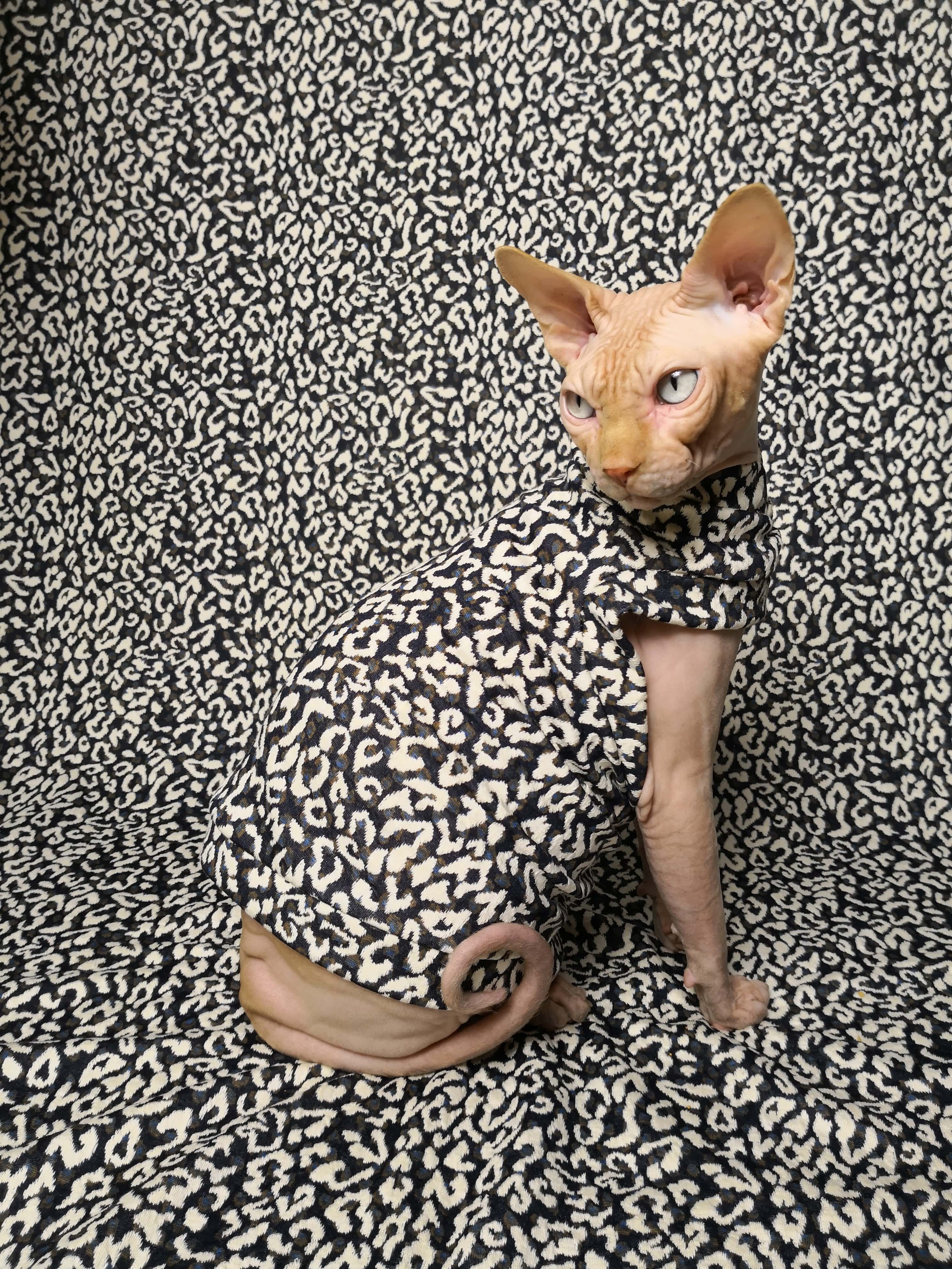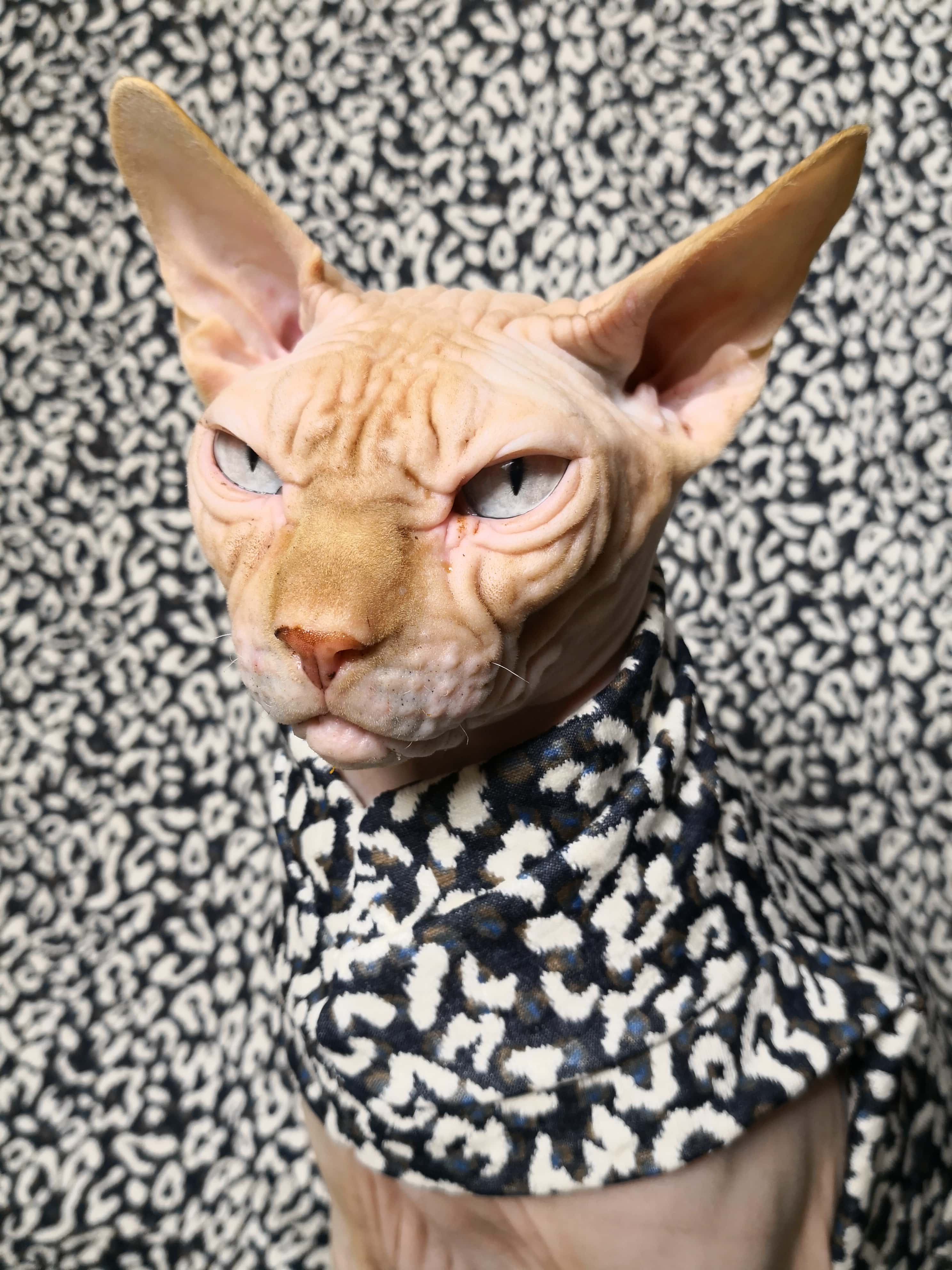 This is a Limited Edition cat shirt / sweater for your hairless Sphynx / Devon Rex / Cornish Rex / Peterbald, and even for some of our stylish furry friends. This is a lightweight woven cheetah fabric with blue, tan and brown spots that make the pattern pop. Regular Size limited to only 6, Bambino Size is limited to only 5, Ankle Biter Size is limited to 2, Lil Nipper Size is limited to 2. No more will be made when they are gone.