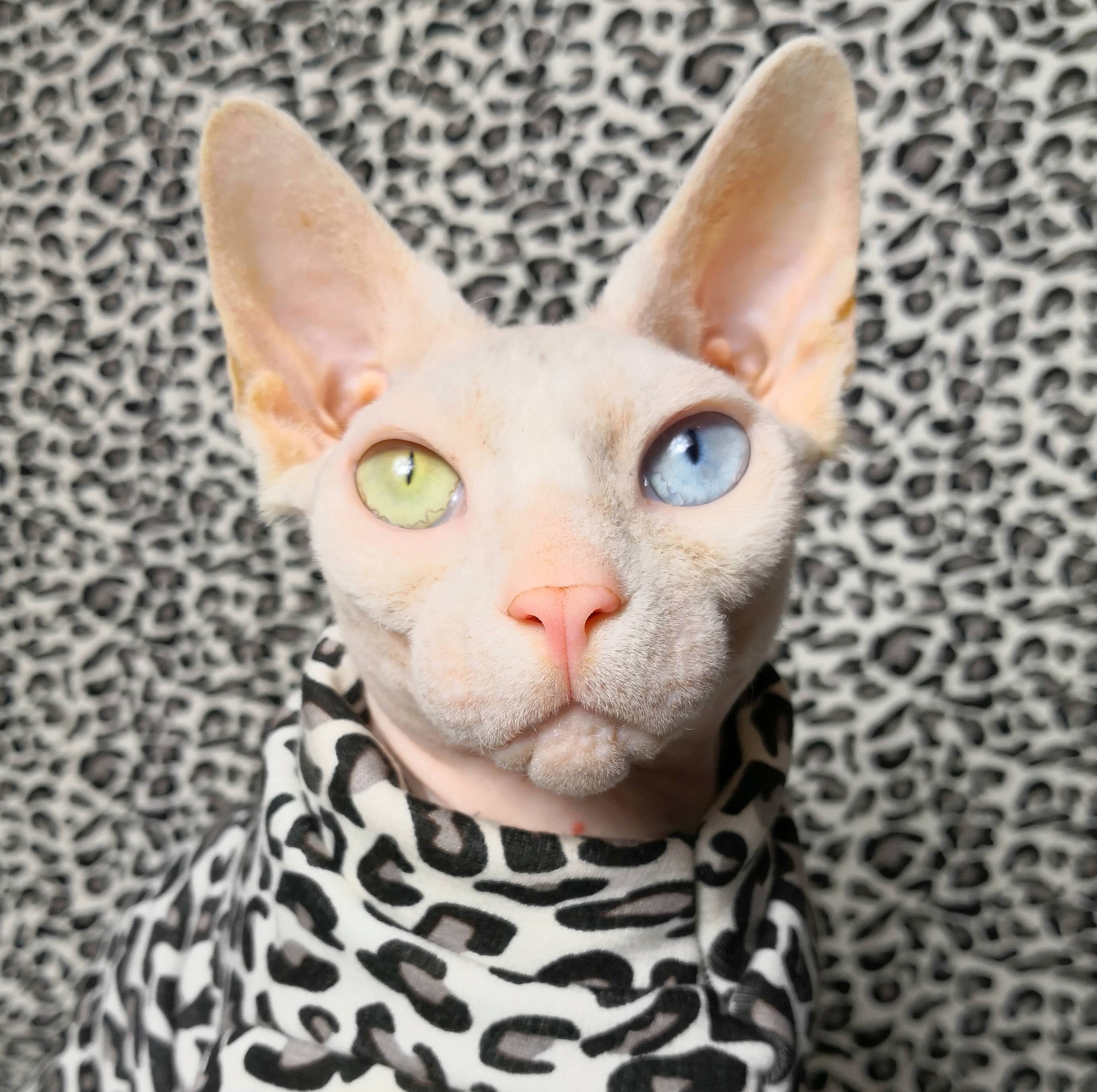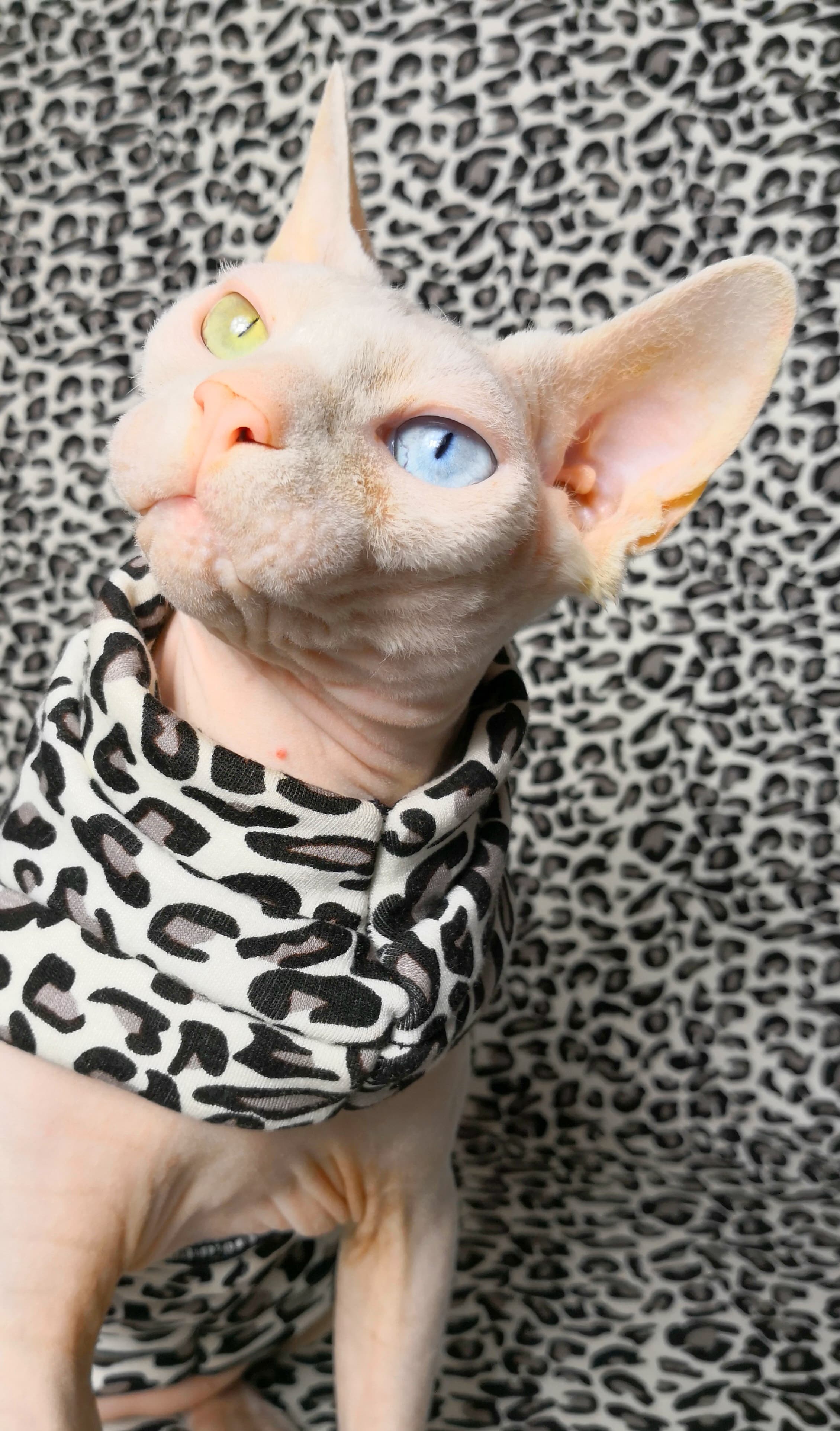 This is a Limited Edition cat shirt / sweater for your hairless Sphynx / Devon Rex / Cornish Rex / Peterbald, and even for some of our stylish furry friends. This is a heavy weight tan and black animal print on off white fabric that has plush velour/terry fabric on the inside. Regular Size limited to only 8. Bambino Size is limited to only 8. Ankle Biter Size is limited to 4, Lil Nipper Size is limited to 3. Pattern is very large and all sweaters will vary. No more will be made when they are gone.