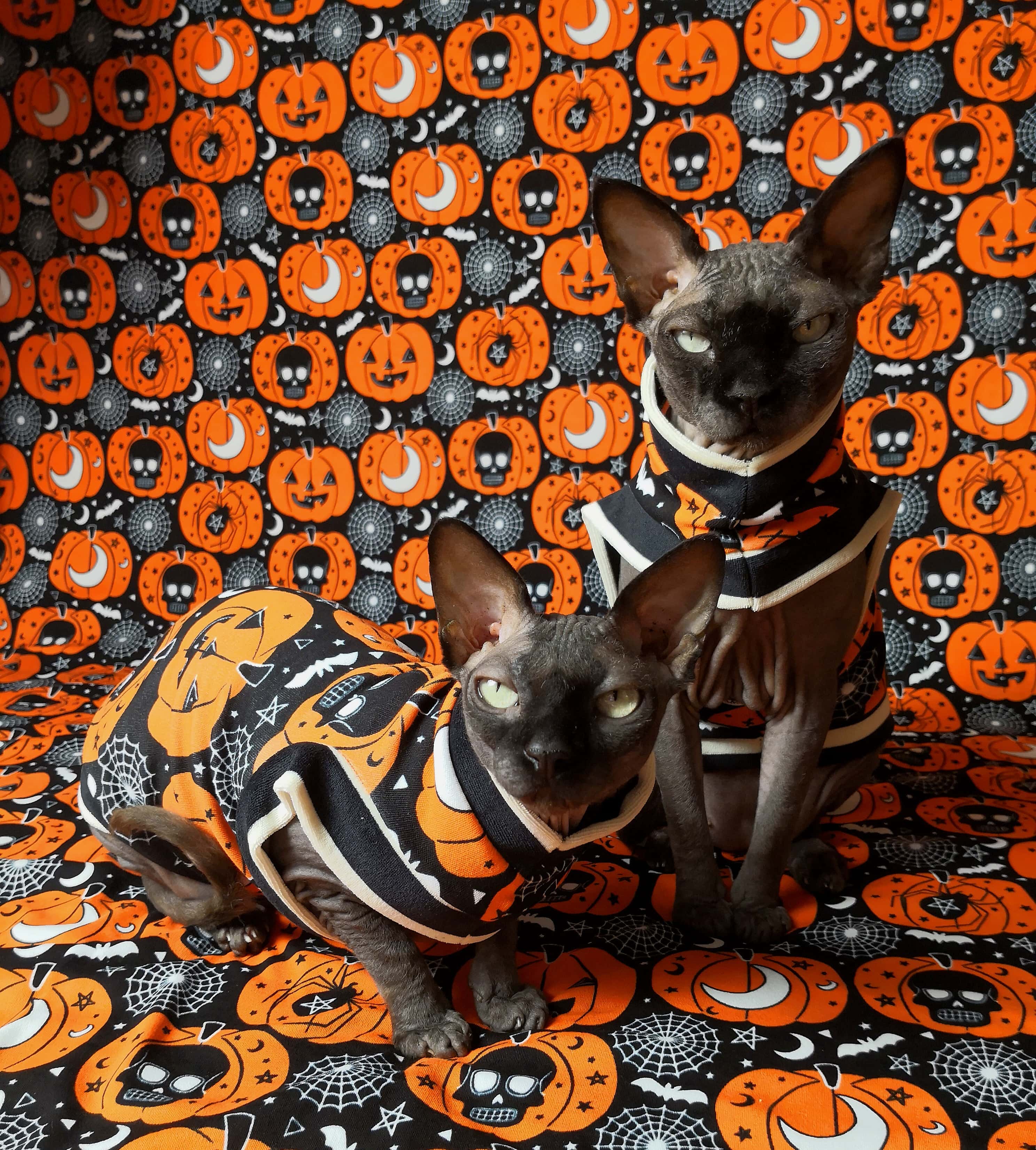 This is an Open Edition cat shirt / sweater for your hairless Sphynx / Devon Rex / Cornish Rex / Peterbald, and even for some of our stylish furry friends. This is a lightweight stretchy cotton spandex blend fabric with printed glow-in-the-dark Halloween pattern adorned with black and white striped velvet trim. This is our first Open Edition Line and we will try our best to accommodate all orders right up until Halloween. These will ship after 8/28!