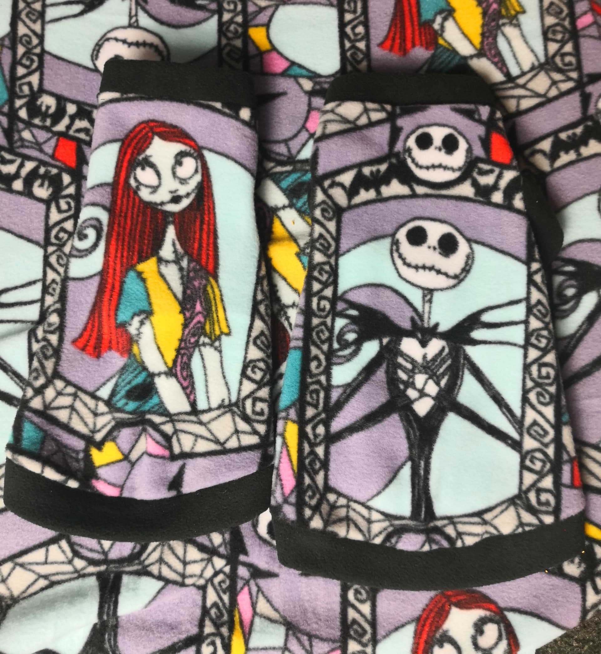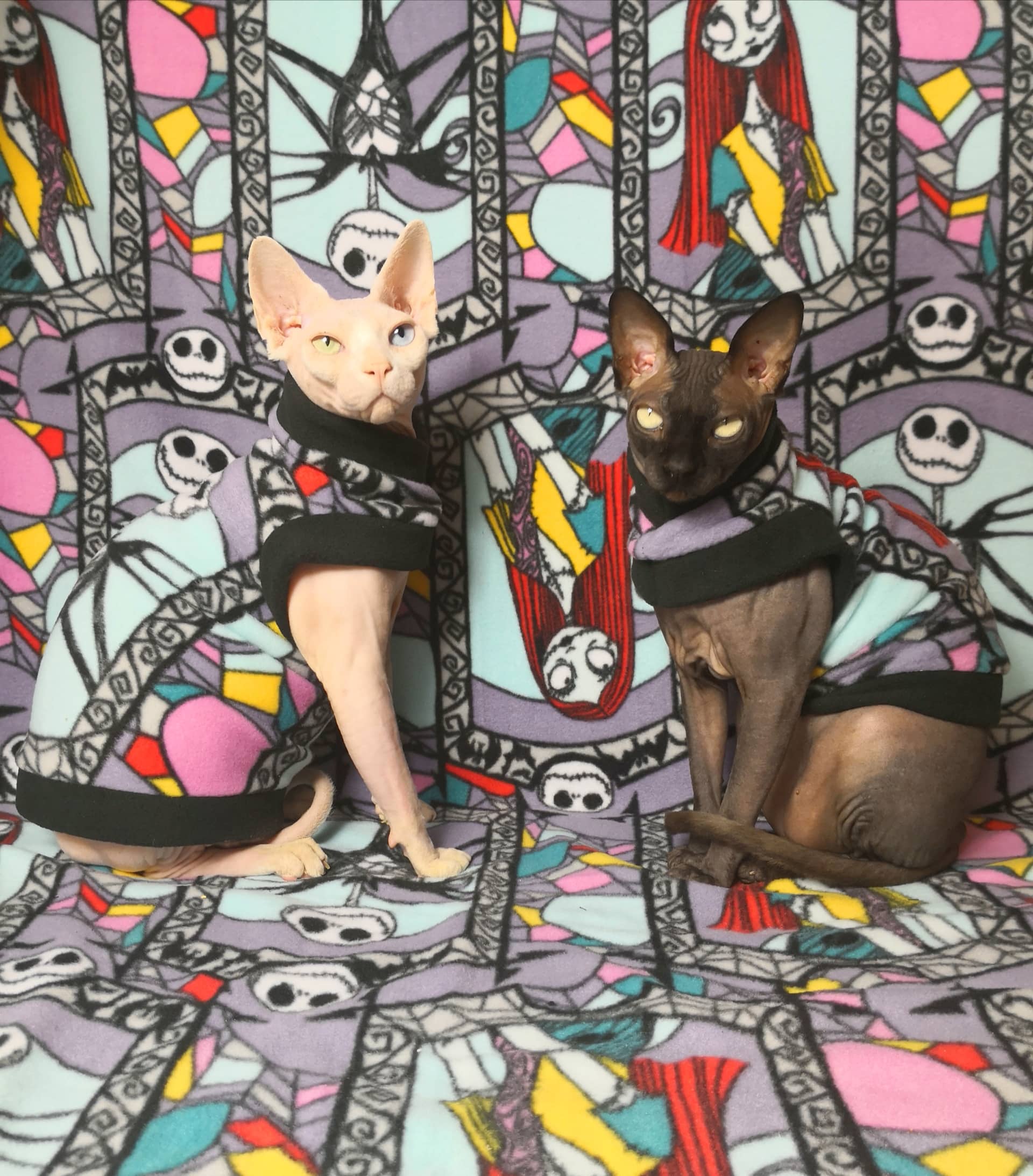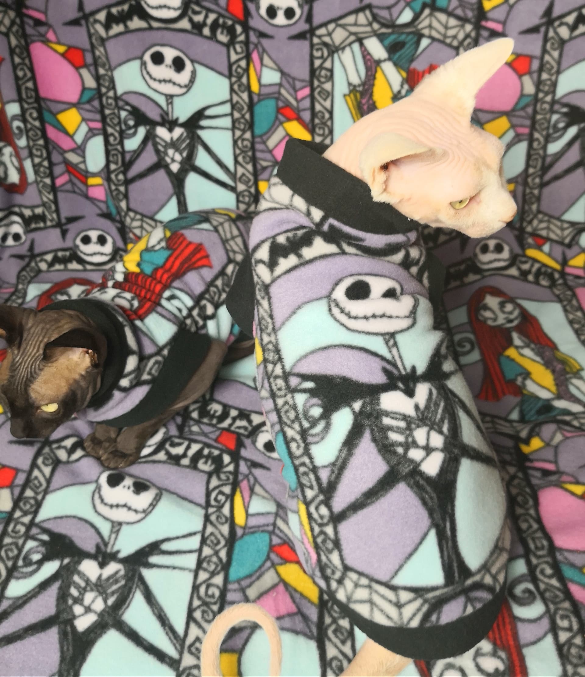 This is a Limited Edition cat shirt / sweater for your hairless Sphynx / Devon Rex / Cornish Rex / Peterbald, and even for some of our stylish furry friends. This is a stretchy medium weight licensed fleece. Jack and Sally versions sold separately. Both have black fleece trim. Actual designs vary due to size ordered. Regular Size limited to only 2 of each design, Bambino Size limited to only 2 of each design. Ankle Biter Size limited to only 2 of each design, Lil Nipper Size limited to only 2 of each design. No more will be made when they are gone.