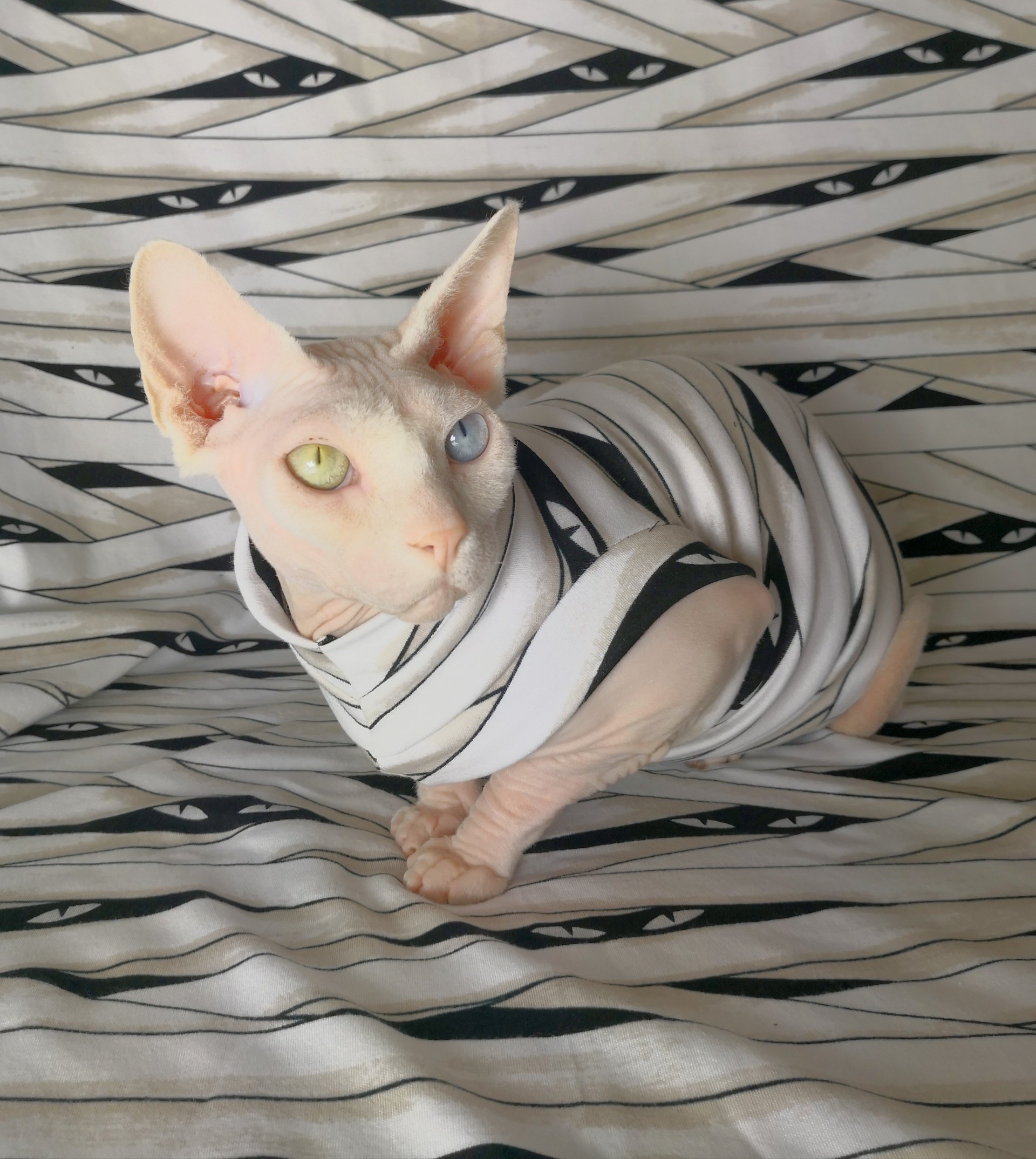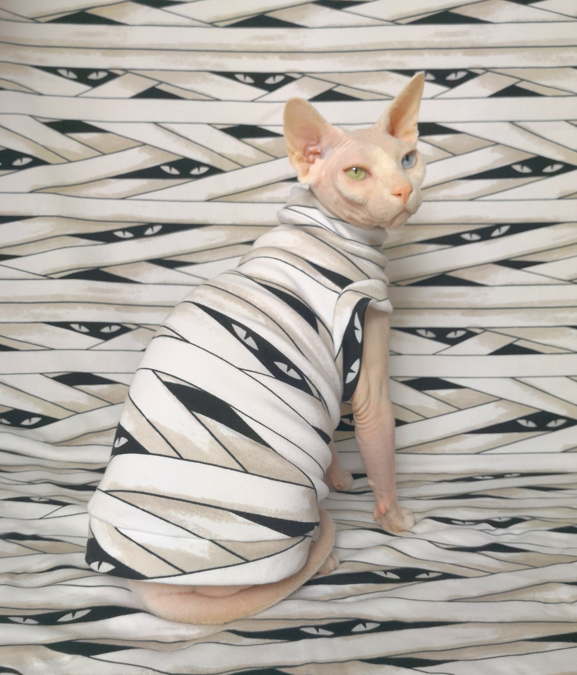 This is a lightweight stretchy cotton spandex blend fabric with printed glow-in-the-dark Halloween mummy wrapping with glowing eyes with same fabric used for trim. This is our first Open Edition and we will try our best to accommodate all orders right up until Halloween.