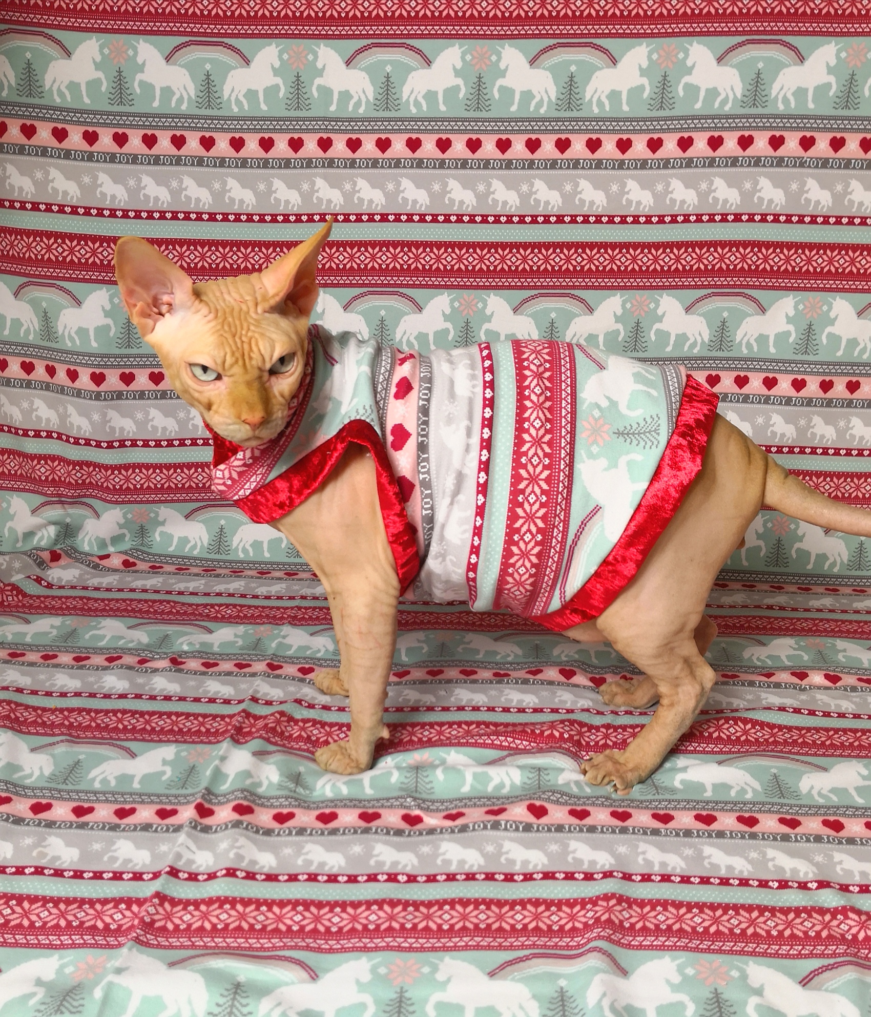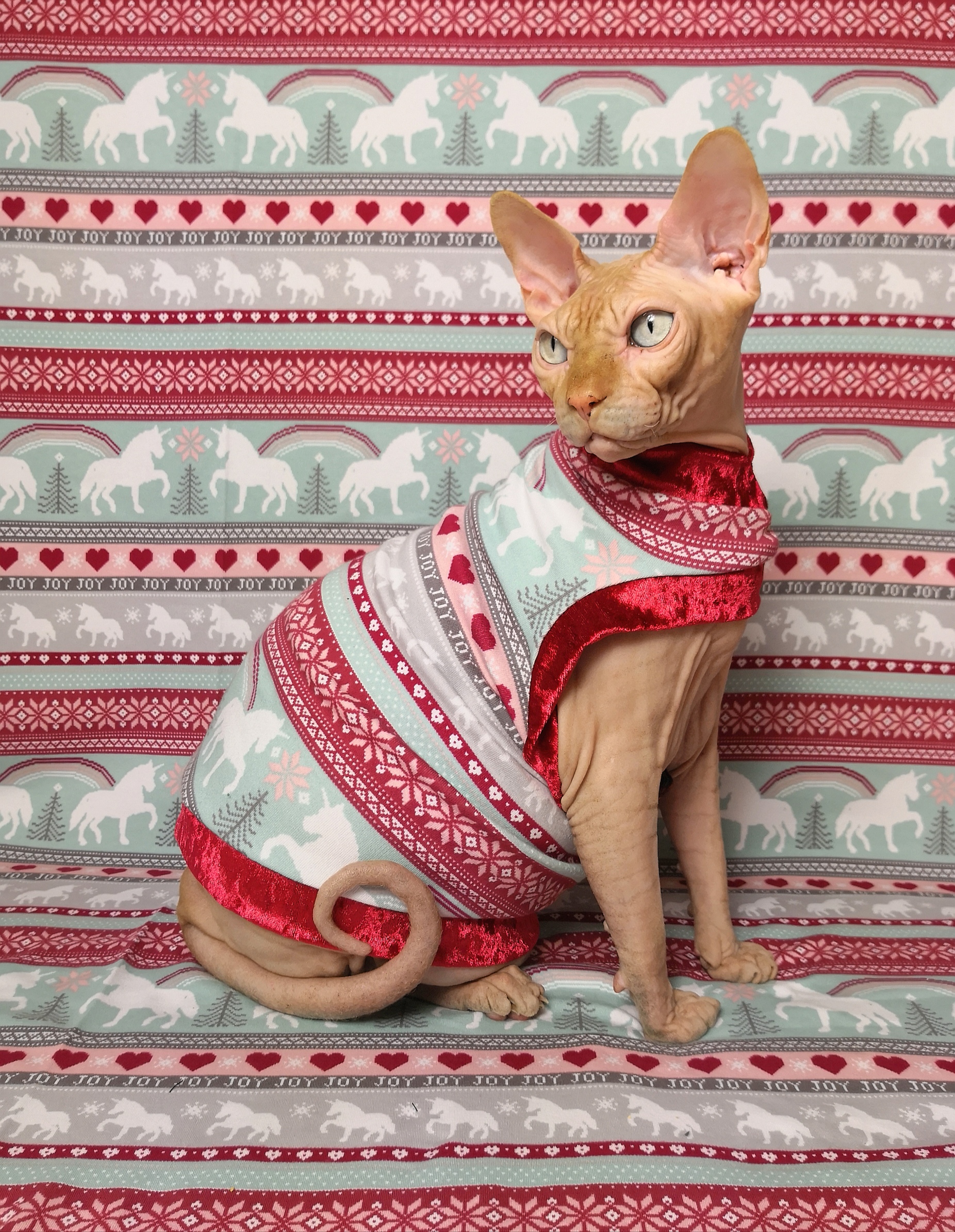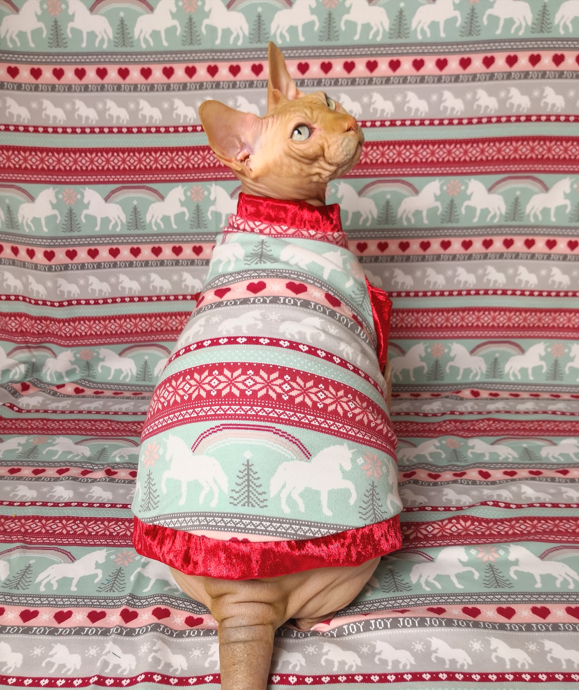 This is an Open Edition cat shirt / sweater for your hairless Sphynx / Devon Rex / Cornish Rex / Peterbald, and even for some of our stylish furry friends. This is a lightweight stretchy cotton spandex blend fabric with Christmas themed unicorn, rainbows, snowflakes and Joy pattern adorned with cranberry crushed velvet trim. This is our second Open Edition and we will try our best to accommodate all orders right up until Christmas. These will ship after 10/8!