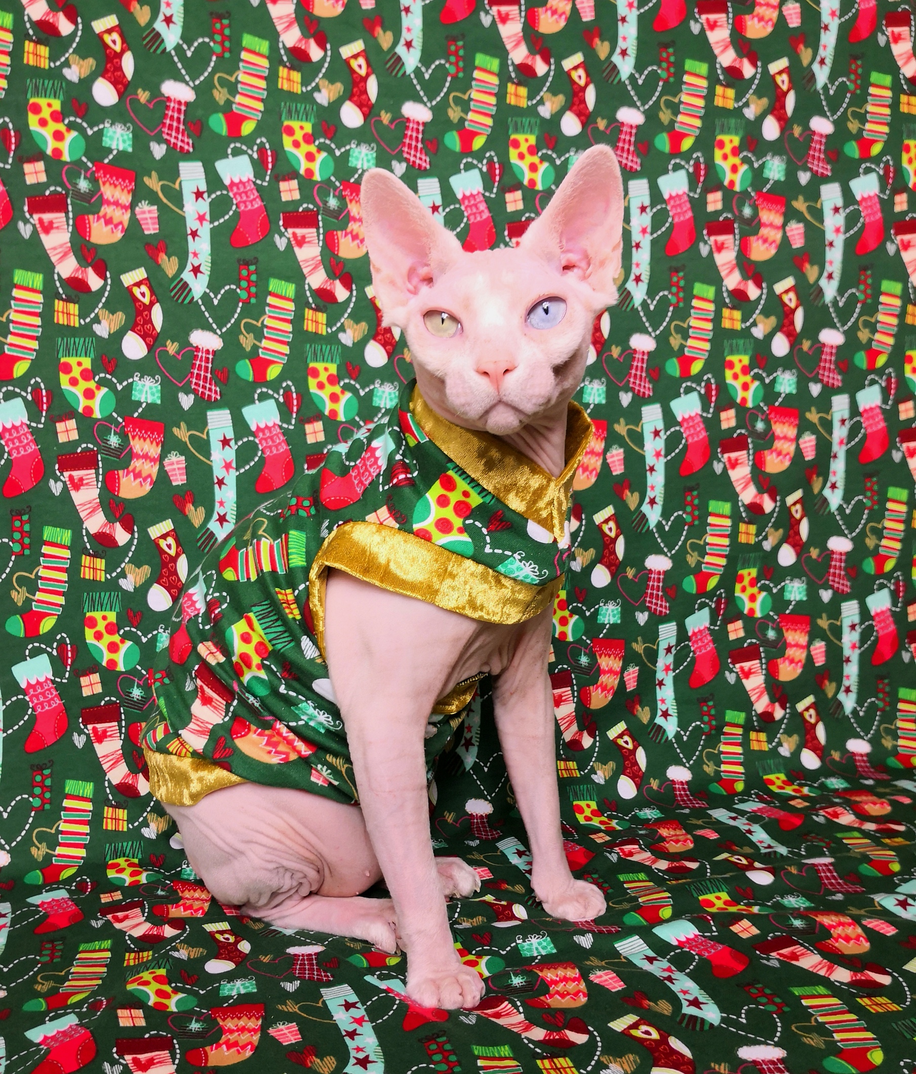 This is an Open Edition cat shirt / sweater for your hairless Sphynx / Devon Rex / Cornish Rex / Peterbald, and even for some of our stylish furry friends. This is a lightweight stretchy cotton spandex blend fabric with Christmas stockings and hearts pattern adorned with mystery velvet trim. This is our second Open Edition and we will try our best to accommodate all orders right up until Christmas. These will ship after 10/8!
