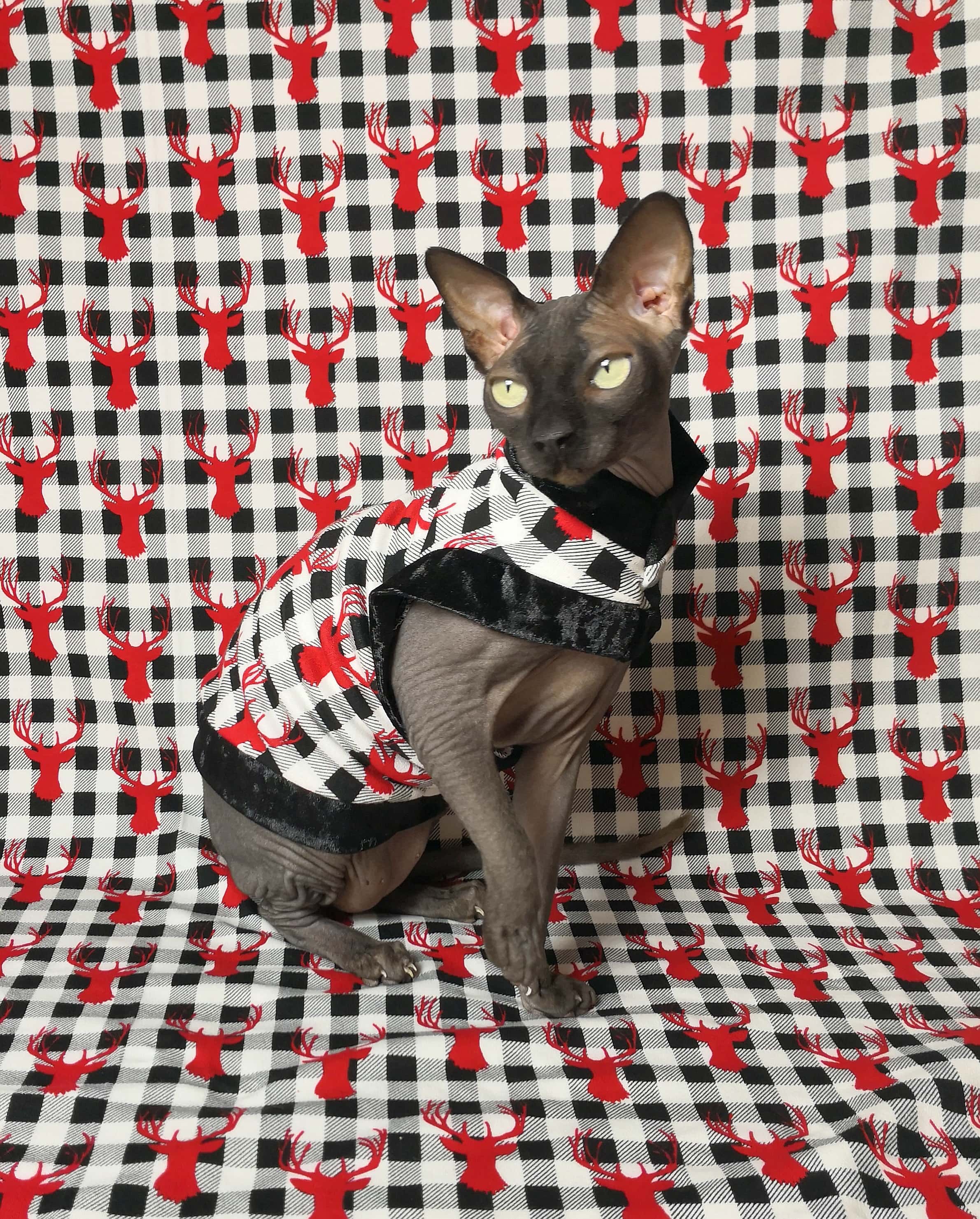 This is an Open Edition cat shirt / sweater for your hairless Sphynx / Devon Rex / Cornish Rex / Peterbald, and even for some of our stylish furry friends. This is a lightweight stretchy cotton spandex blend fabric with buffalo check and red deer pattern adorned with black velvet trim. This is our second Open Edition and we will try our best to accommodate all orders right up until Christmas. These will ship after 10/8!
