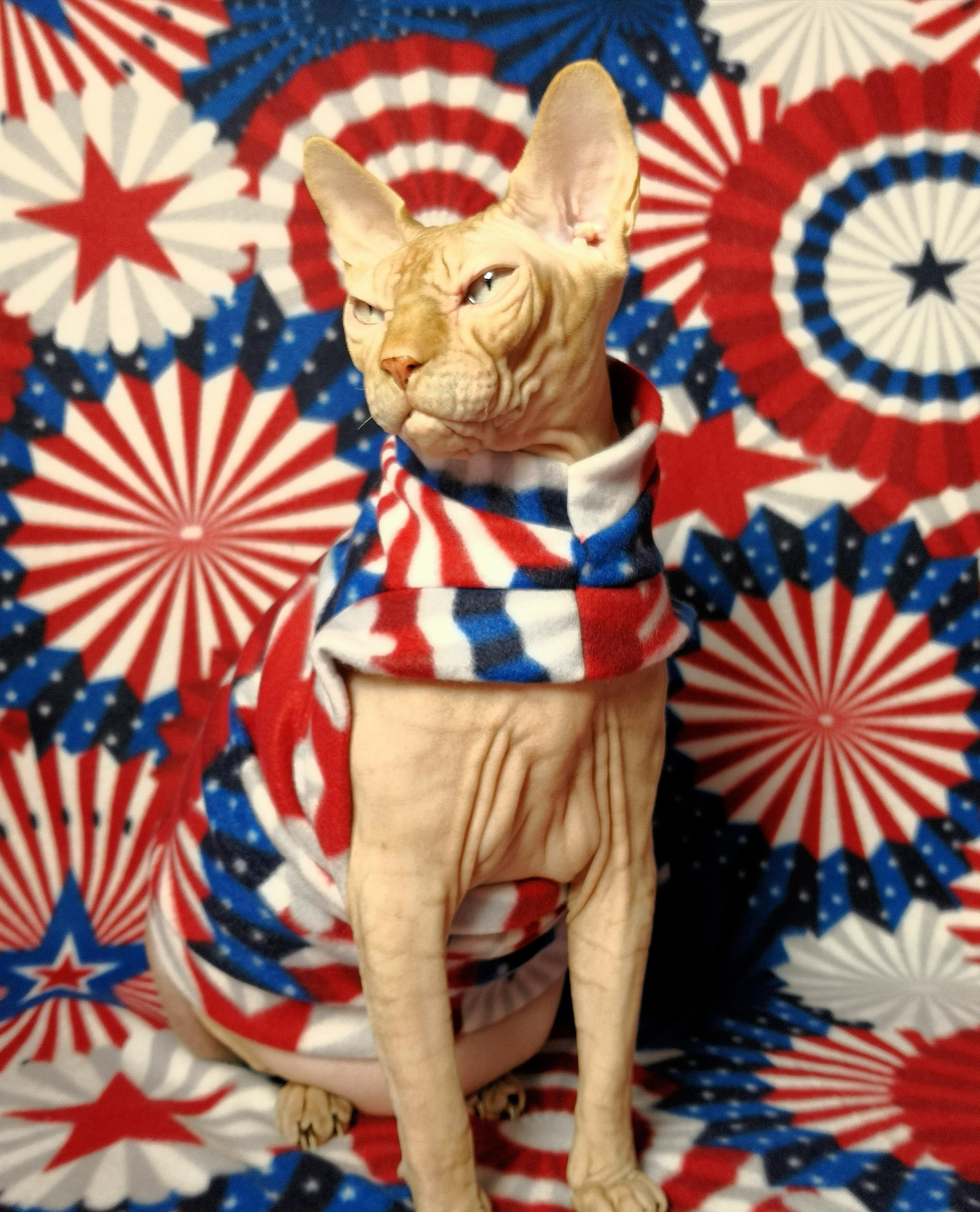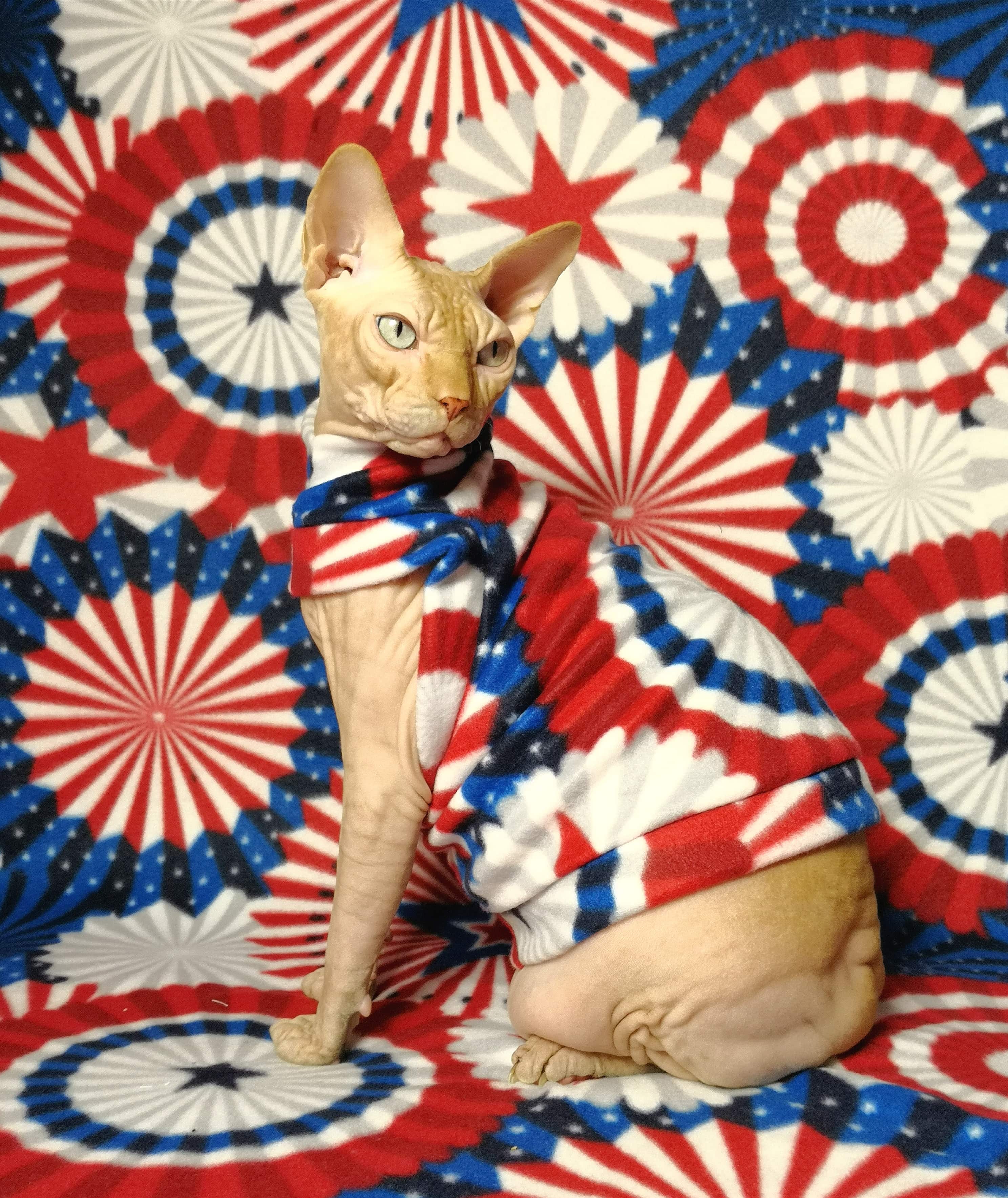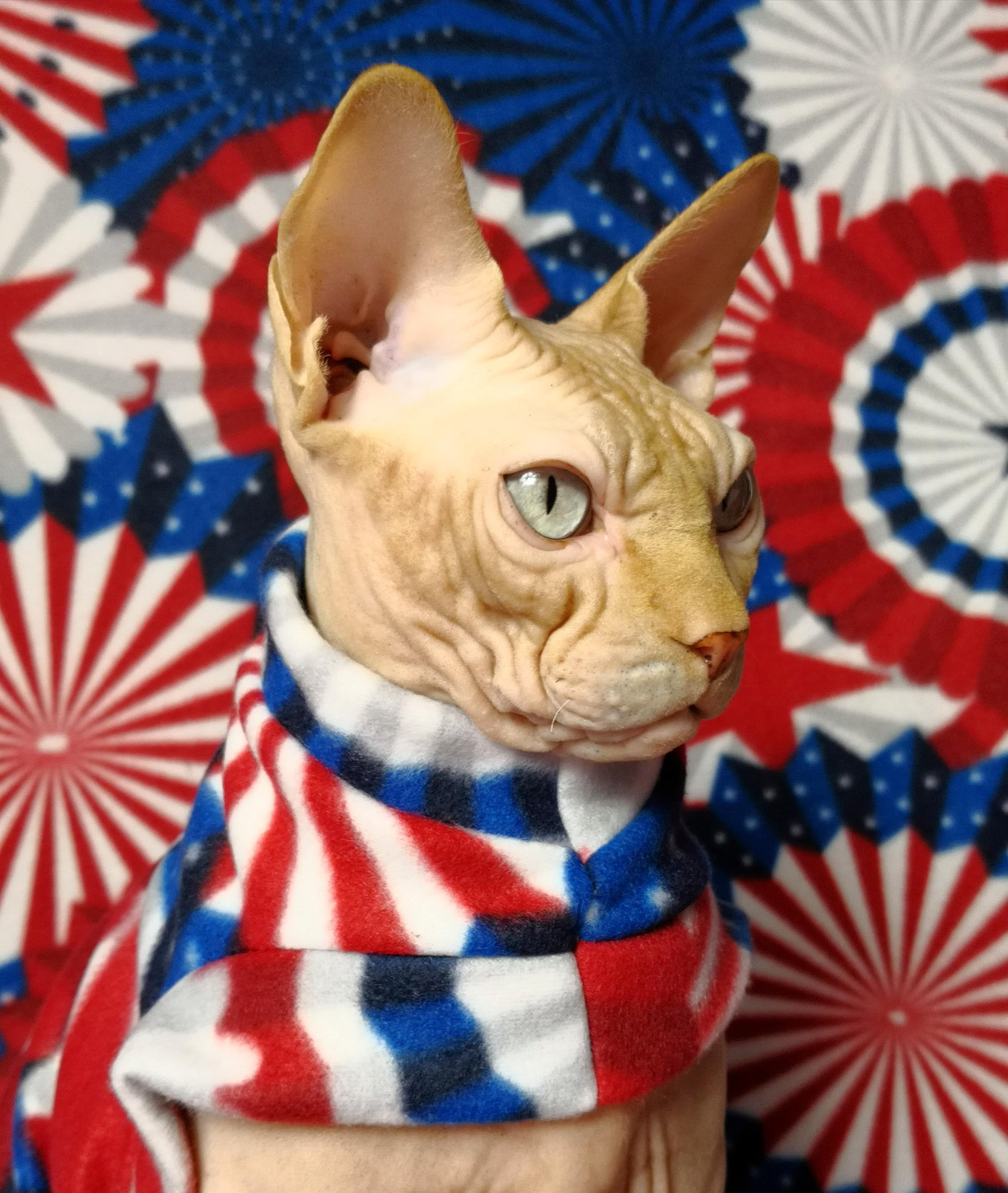 This is a Limited Edition cat shirt / sweater for your hairless Sphynx / Devon Rex / Cornish Rex / Peterbald, and even for some of our stylish furry friends. This is a medium weight stretchy fleece with patriotic theme of red white and blue. Regular Size limited to only 7. Bambino Size limited to only 7, Ankle Biter Size limited to only 2. Lil Nipper Size limited to only 2. No more will be made when they are gone.