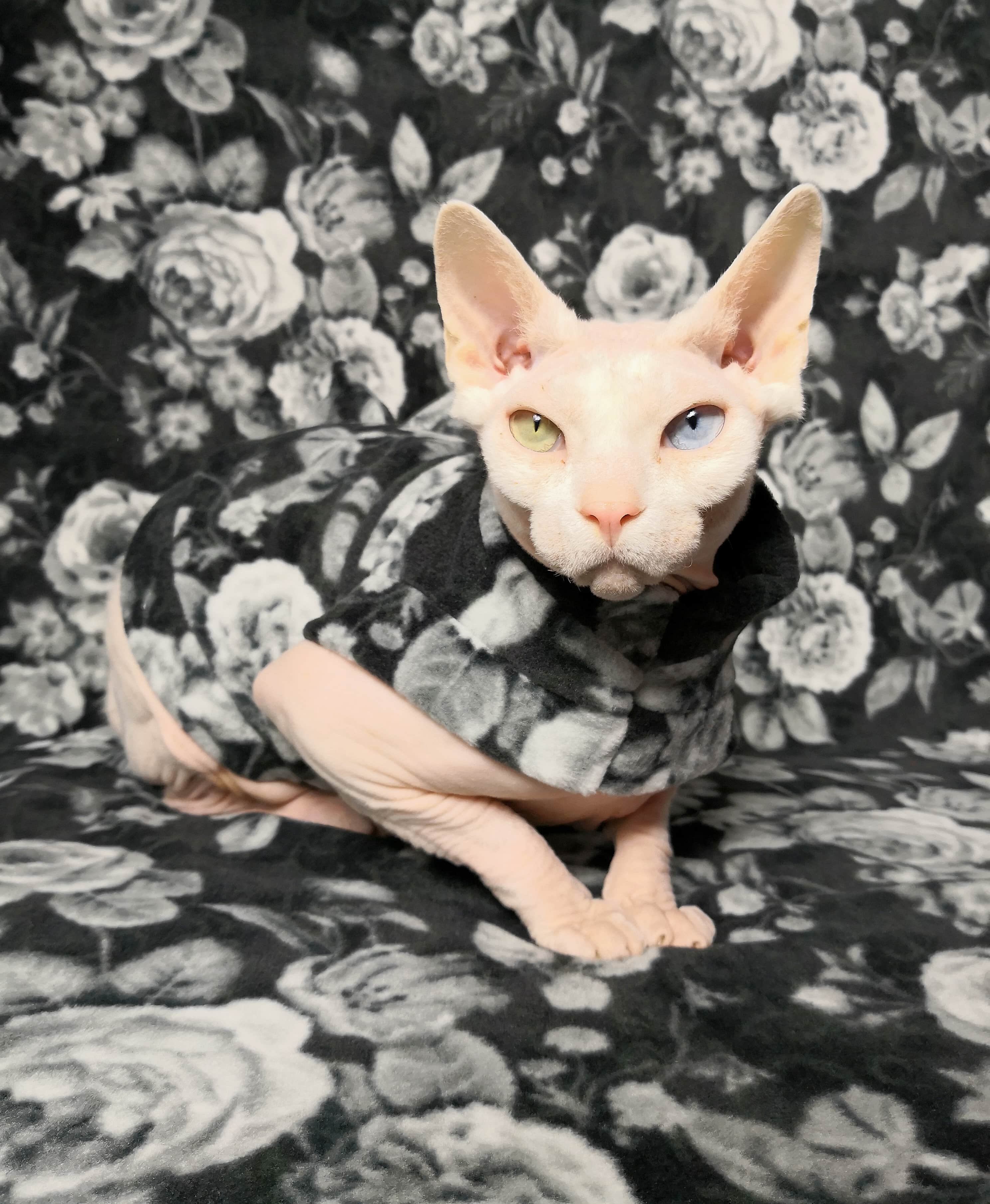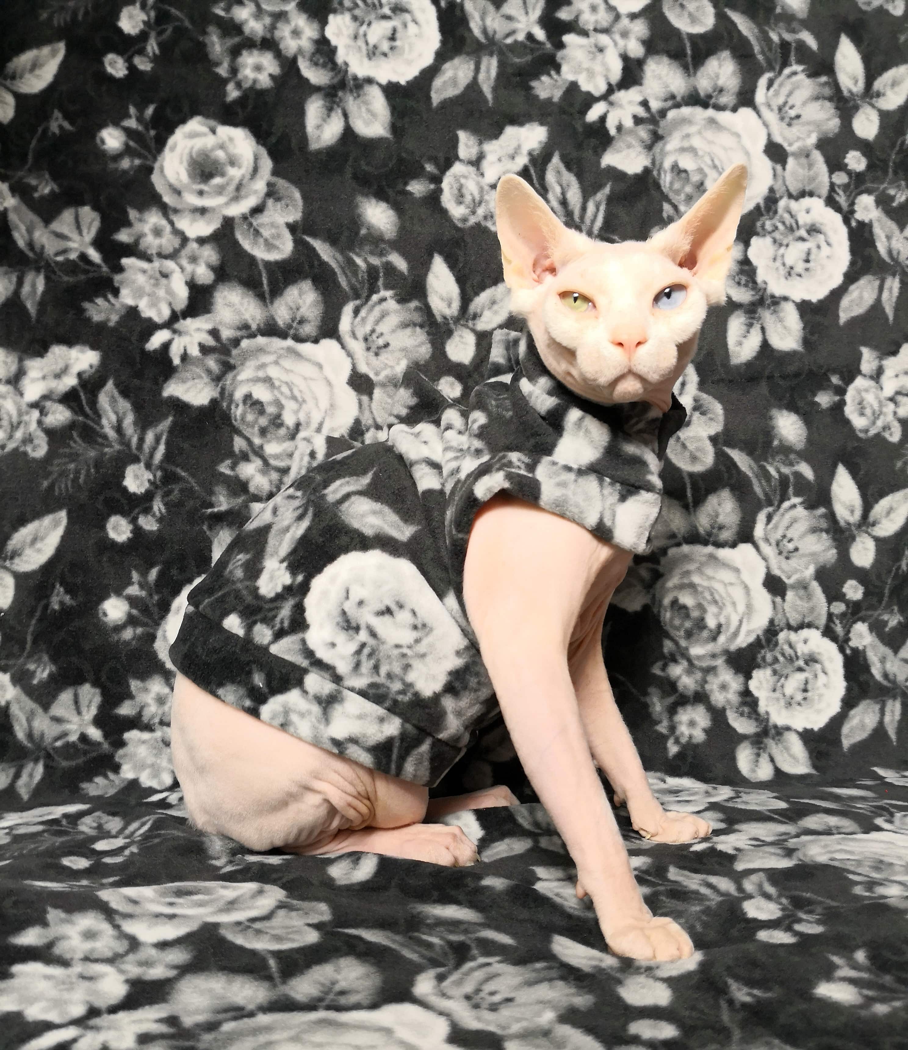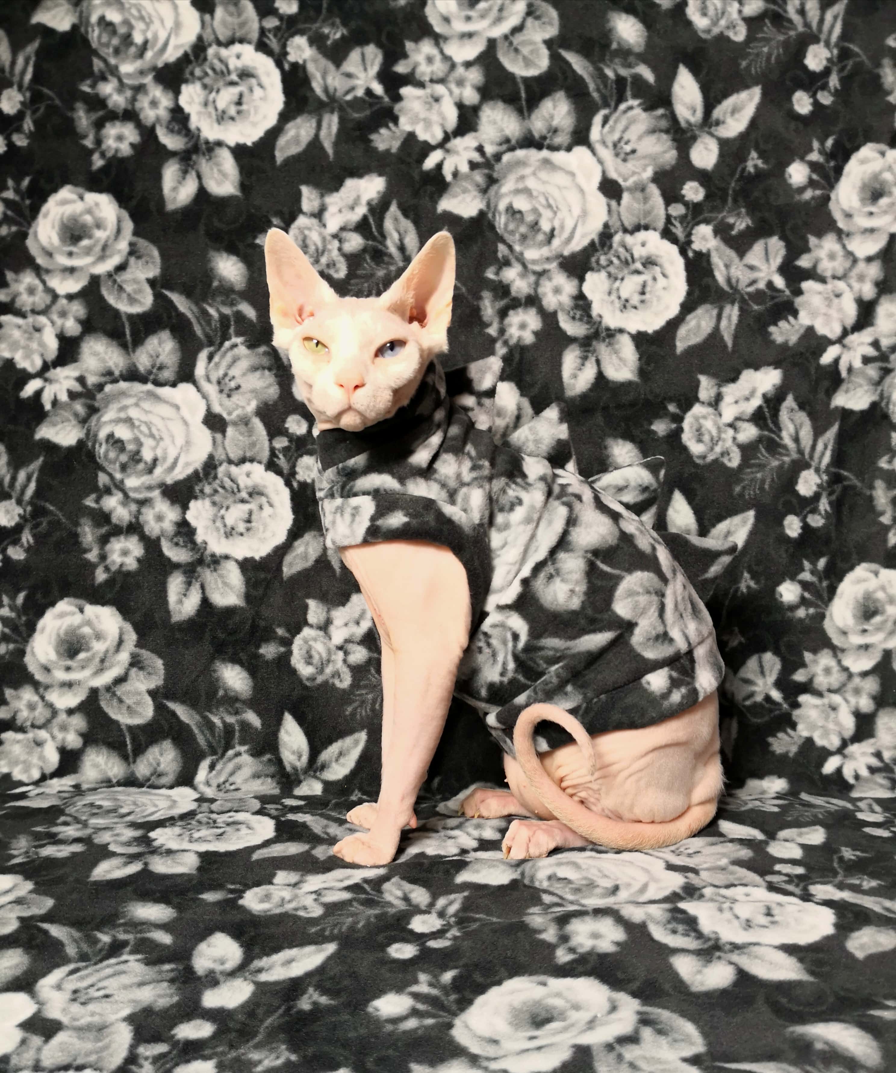 This is a Timed Limited Edition cat sweater for your hairless Sphynx / Devon Rex / Cornish Rex / Peterbald, and even for some of our stylish furry friends. This is beautiful rose patterned plush fleece in black and white with tiny amounts of green. This sweater will only be available until 2/2/2020 OR when all materials run out. Whichever happens first.