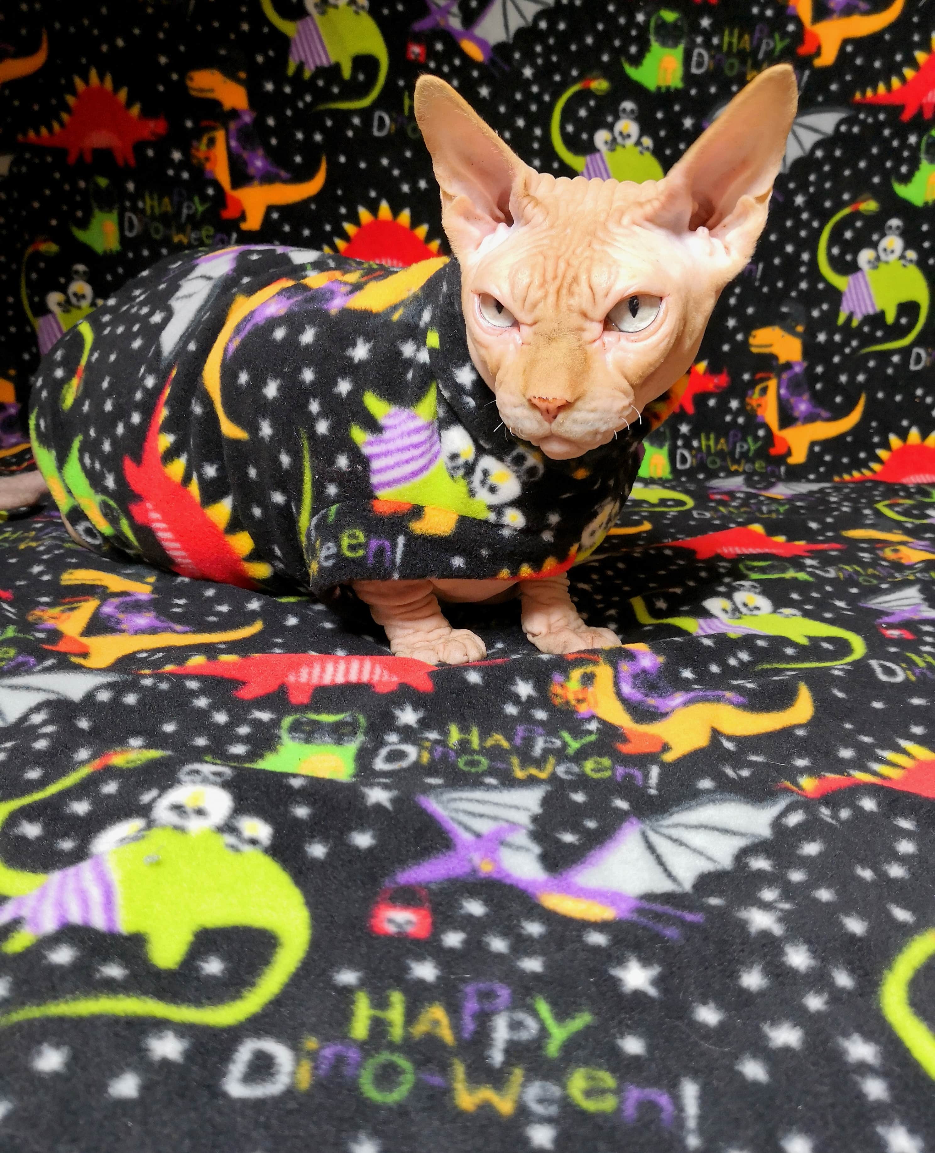 This is a Limited Edition cat shirt / sweater for your hairless Sphynx / Devon Rex / Cornish Rex / Peterbald, and even for some of our stylish furry friends. This is a medium weight stretchy luxe fleece in a fun Halloween pattern with dinosaurs and even a cat dressed as a dino. Regular Size limited to only 12. Bambino Size limited to only 12. Ankle Biter Size limited to only 2. Lil Nipper Size limited to only 2. No more will be made when they are gone.