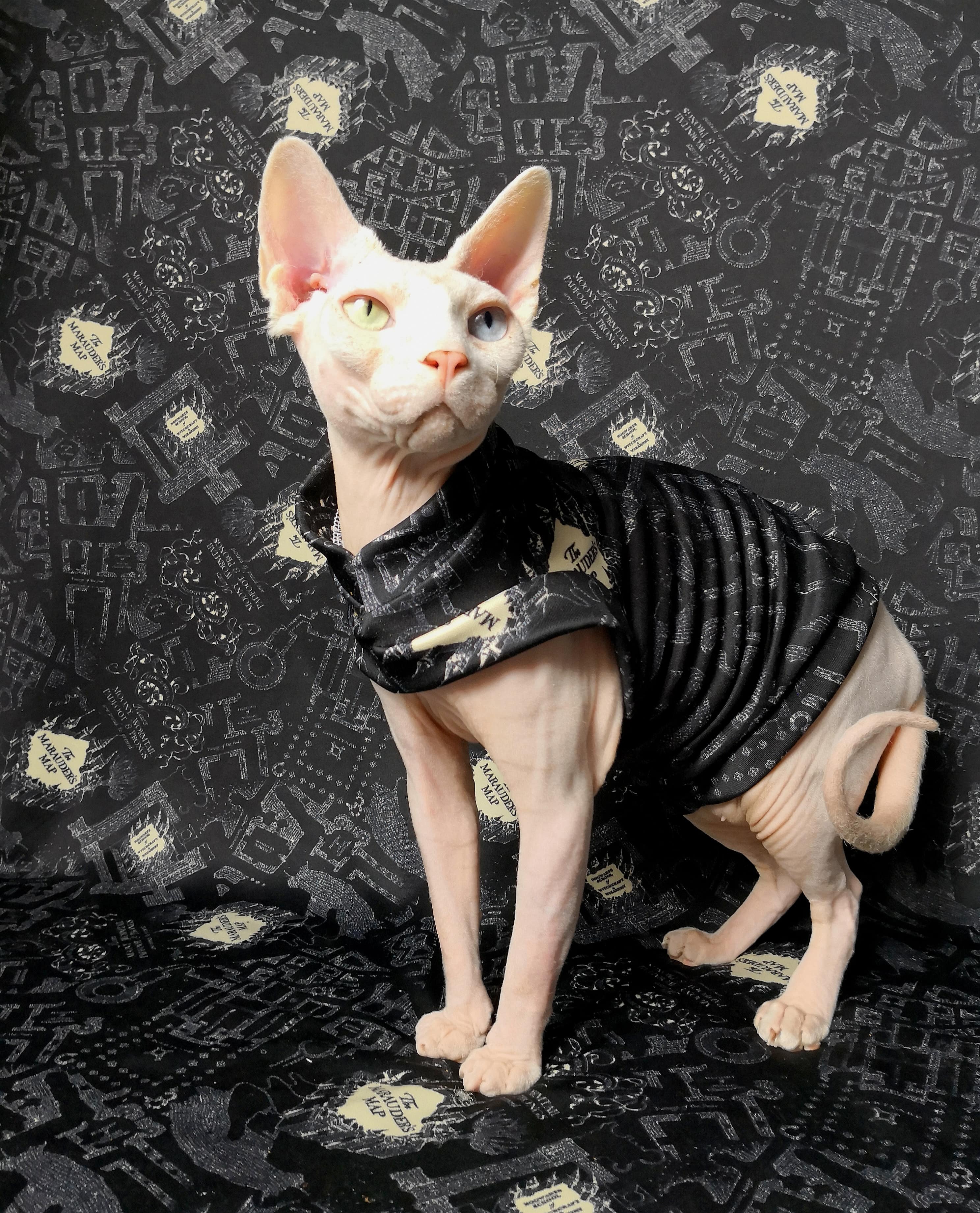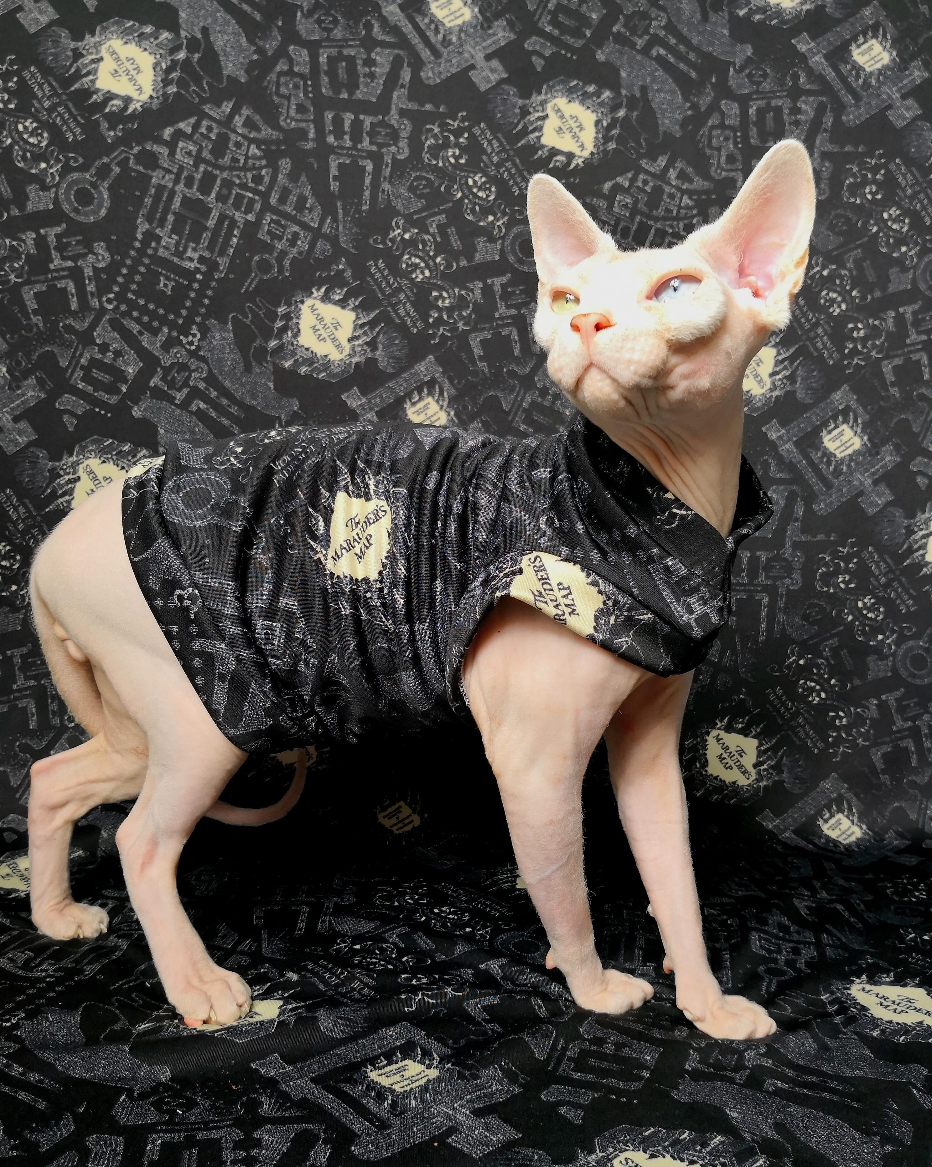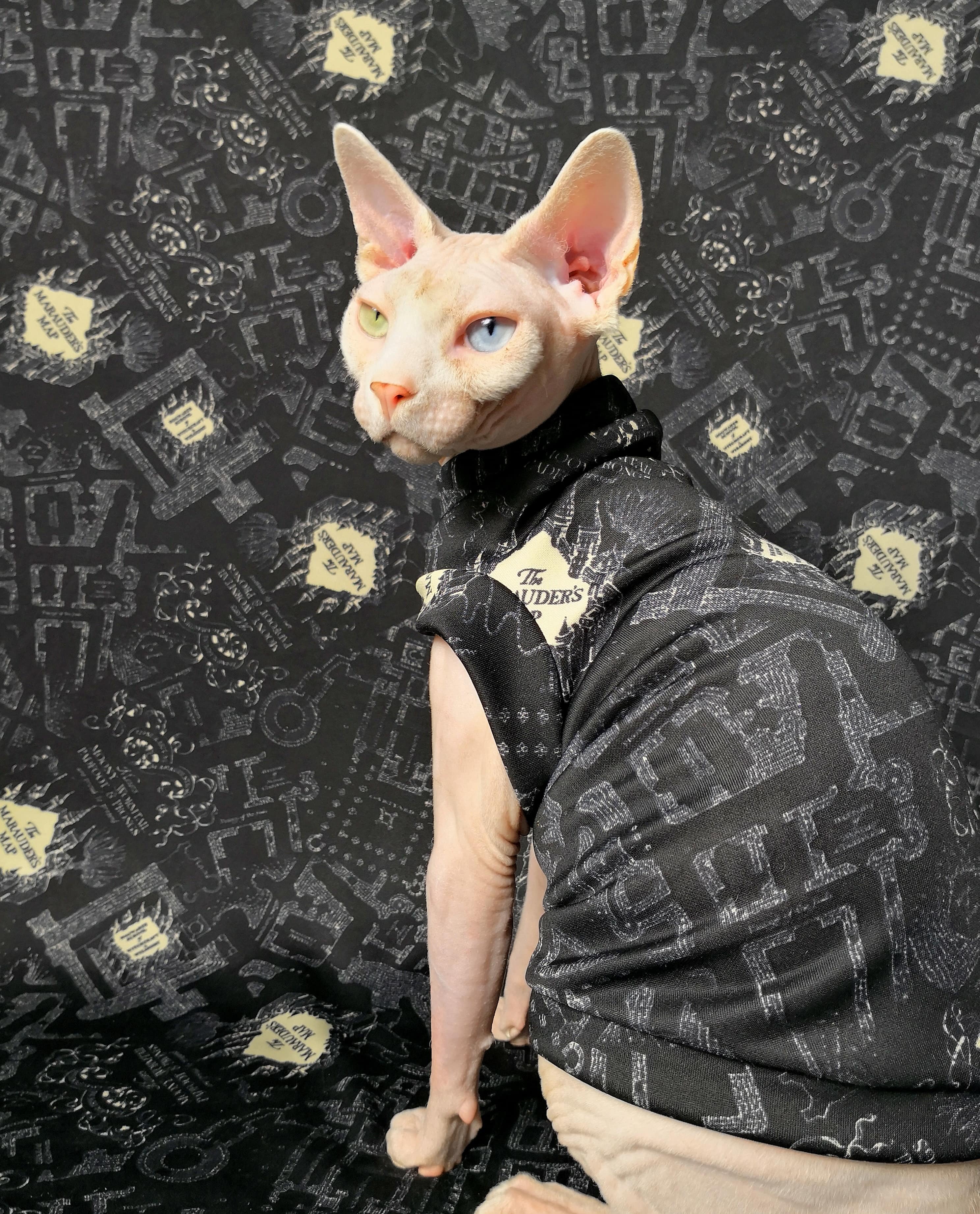 This is a Limited Edition cat shirt / sweater for your hairless Sphynx / Devon Rex / Cornish Rex / Peterbald, and even for some of our stylish furry friends. This is a stretchy midweight fabric printed with The Marauder's Map. Regular Size limited to only 8. Bambino Size limited to only 7, Ankle Biter Size limited to 2 and Lil Nipper Size limited to 2. No more will be made when they are gone.