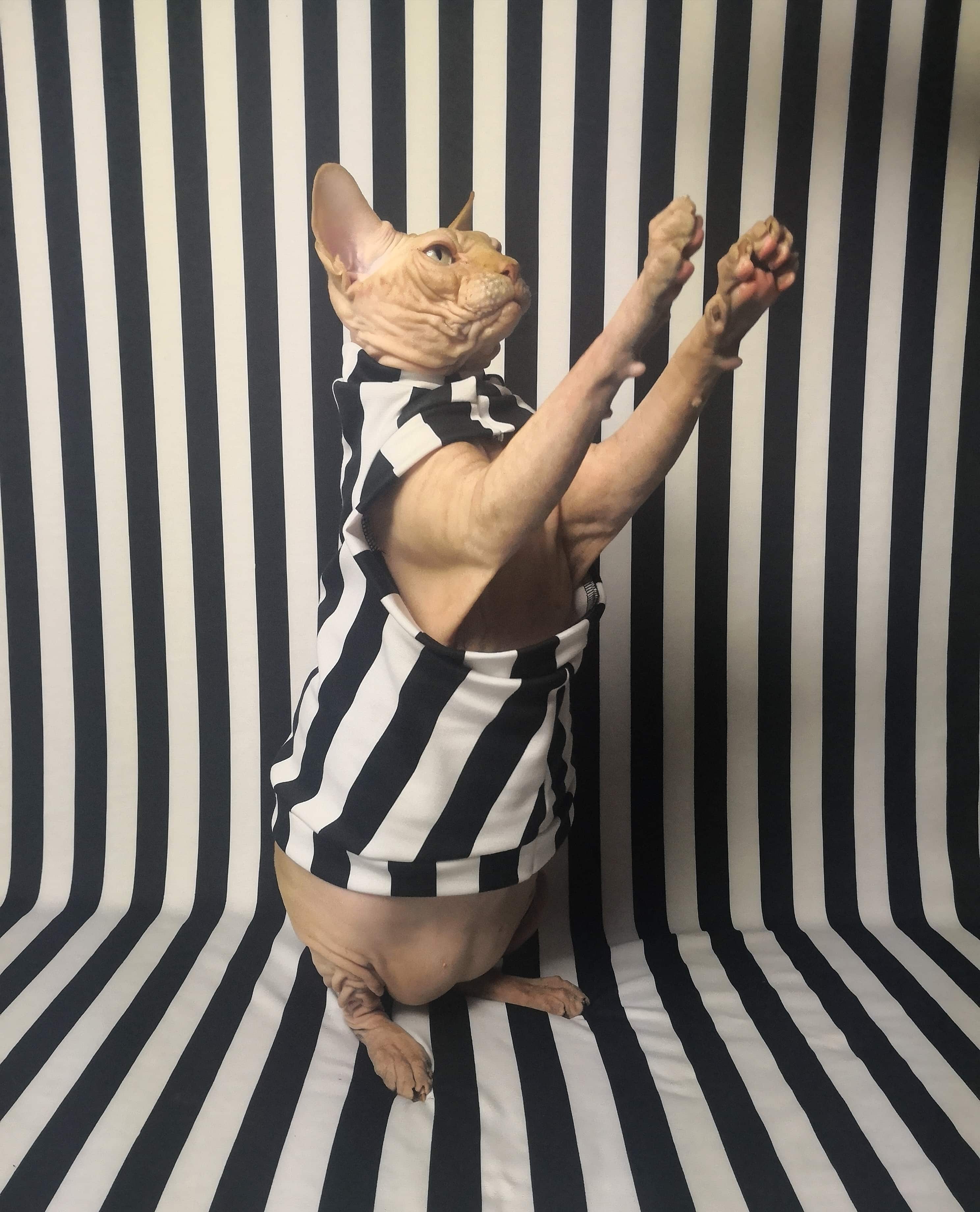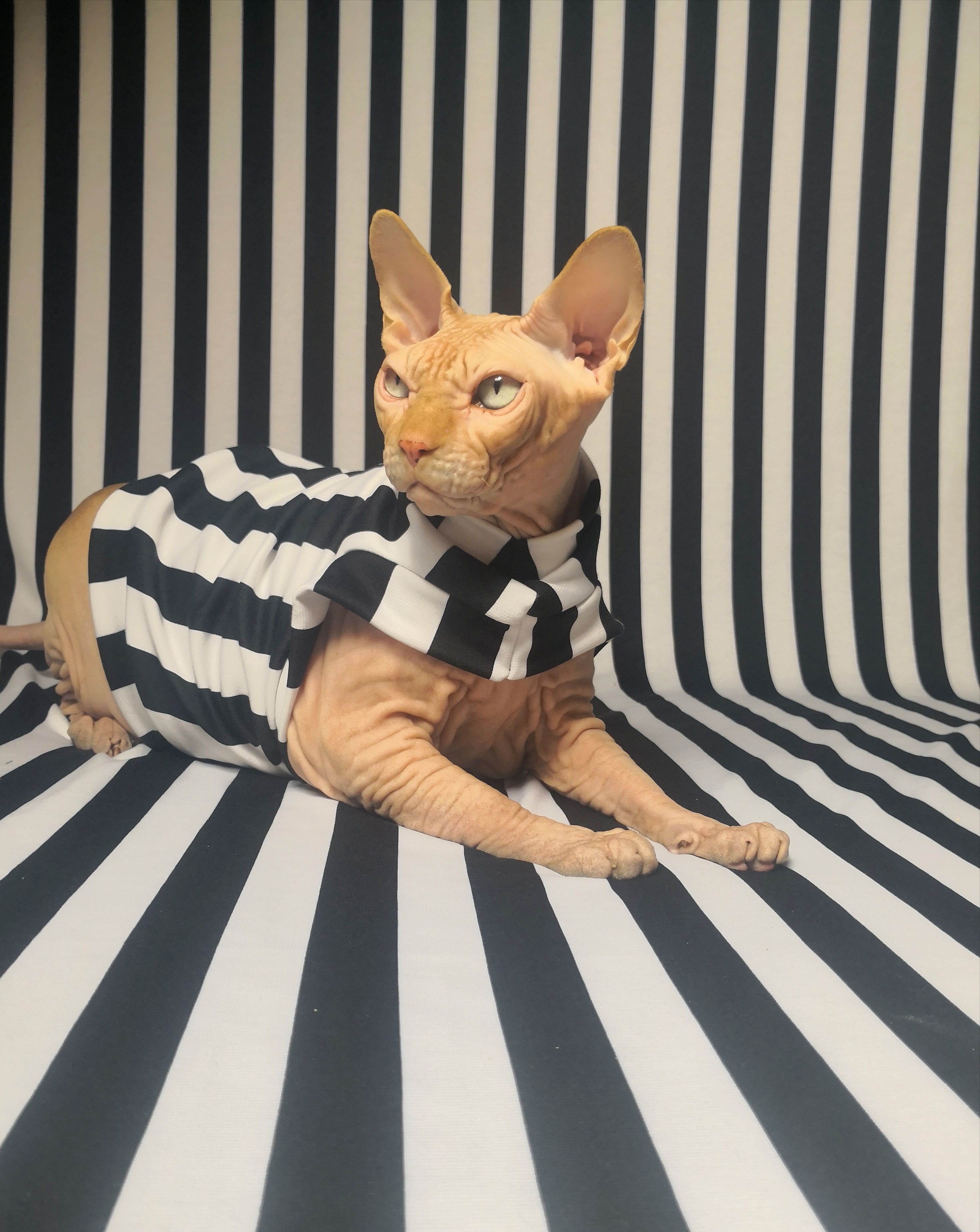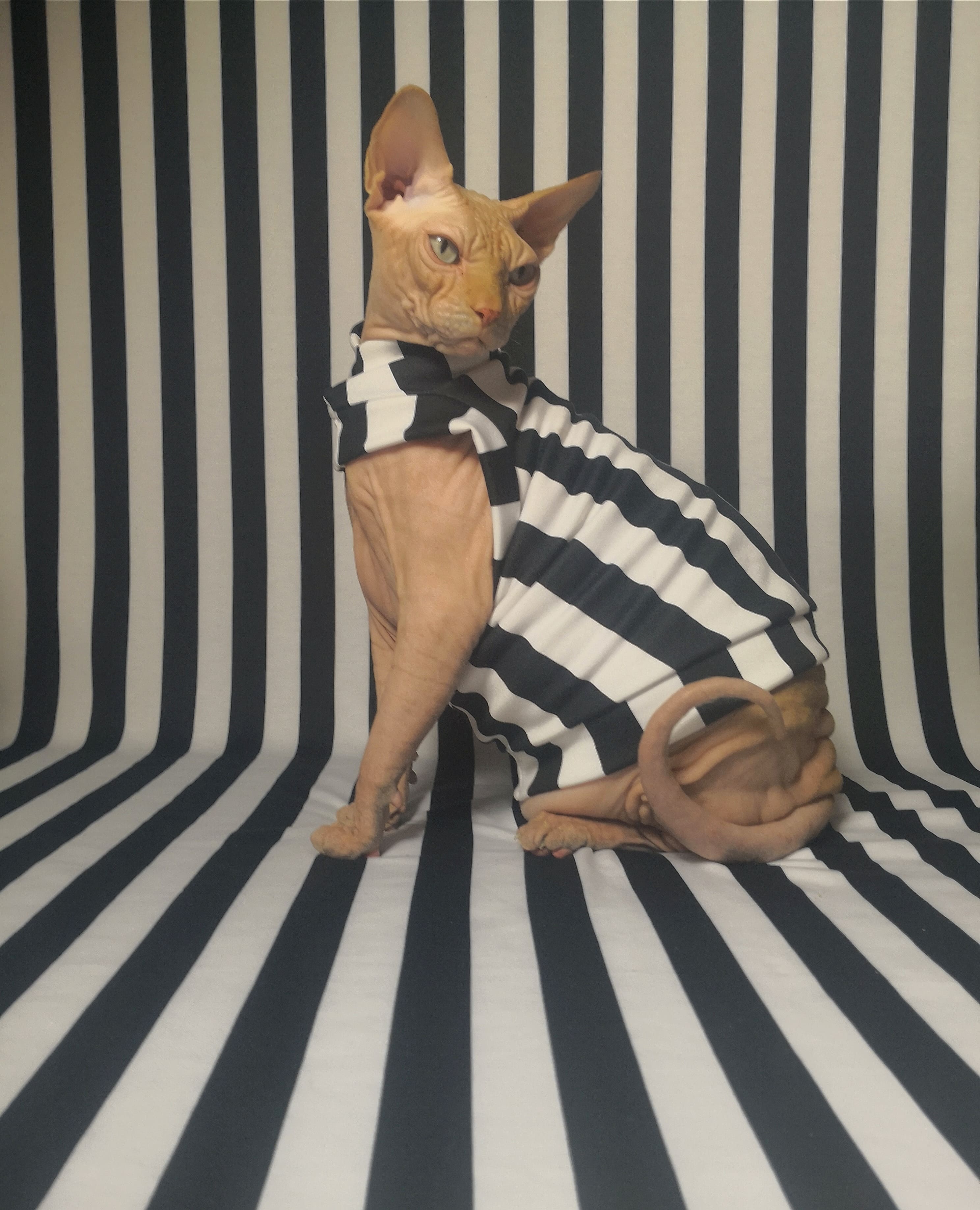This is an Open Edition cat shirt / sweater for your hairless Sphynx / Devon Rex / Cornish Rex / Peterbald, and even for some of our stylish furry friends. This is a stretchy lightweight white fabric with printed black lines. This is our second Open Edition and we will try our best to accommodate all orders right up until Halloween.
