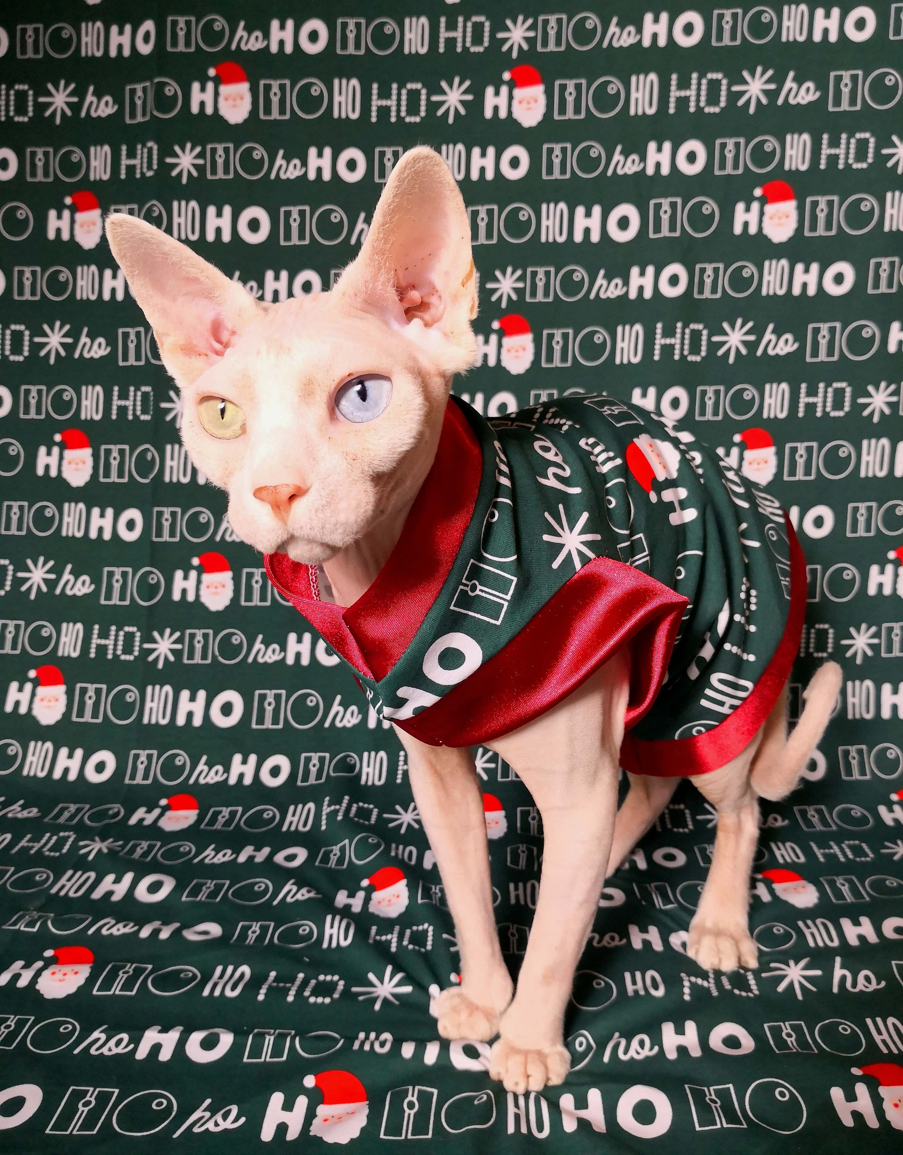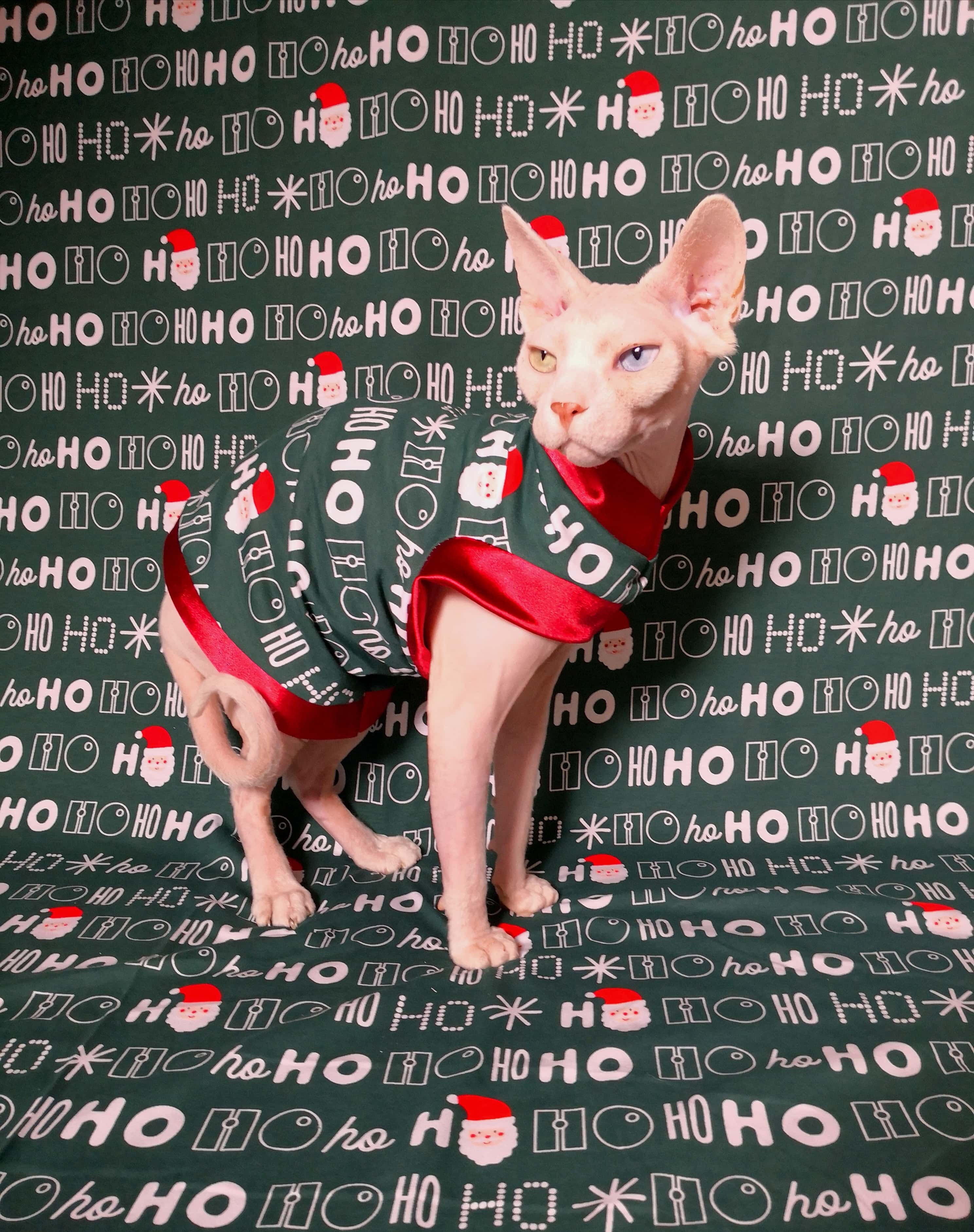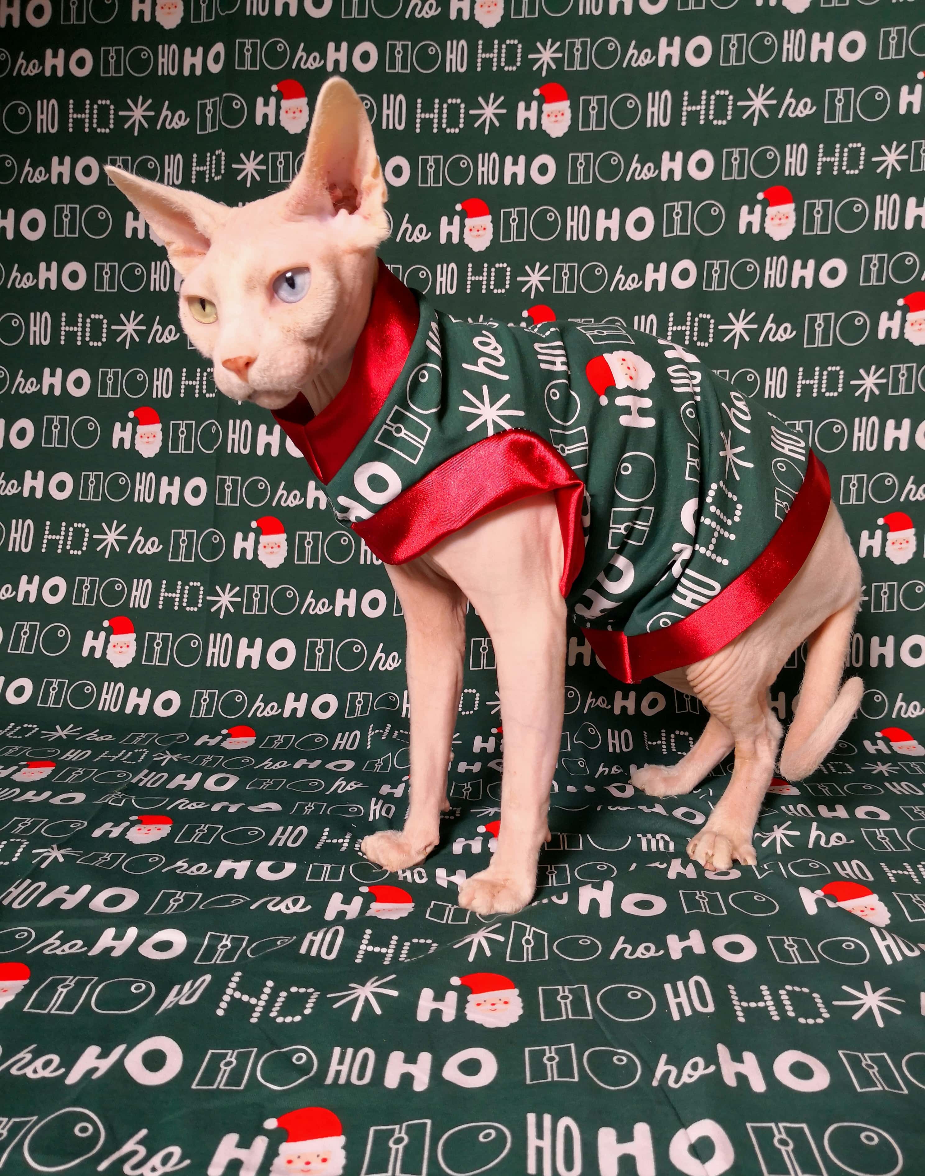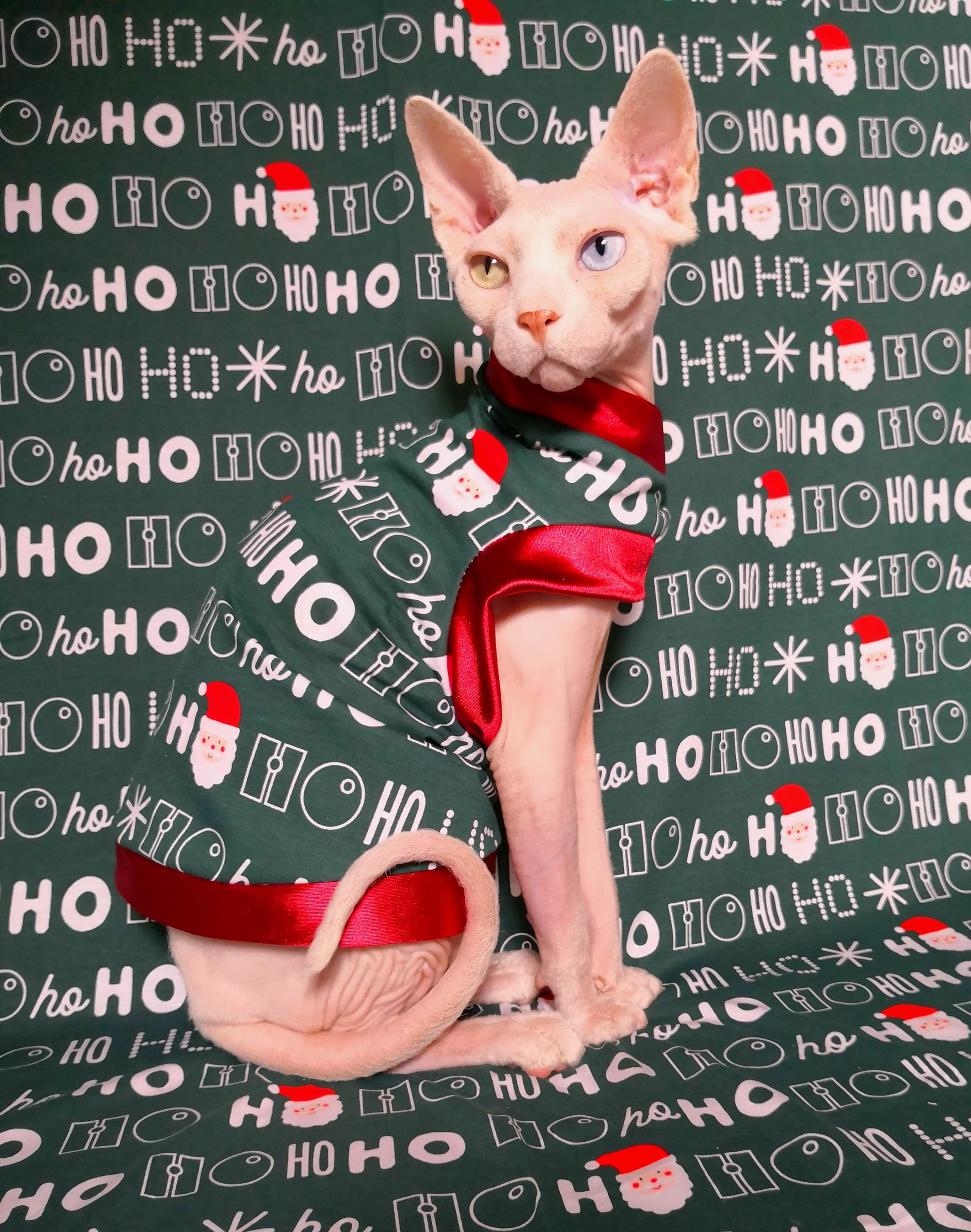 This is an Open Edition cat shirt / sweater for your hairless Sphynx / Devon Rex / Cornish Rex / Peterbald, and even for some of our stylish furry friends. This is a lightweight cotton fabric with stretch printed with Ho's in different fonts (and Santa) with electric red stretchy stim. This is our second Open Edition and we will try our best to accommodate all orders right up until Halloween.