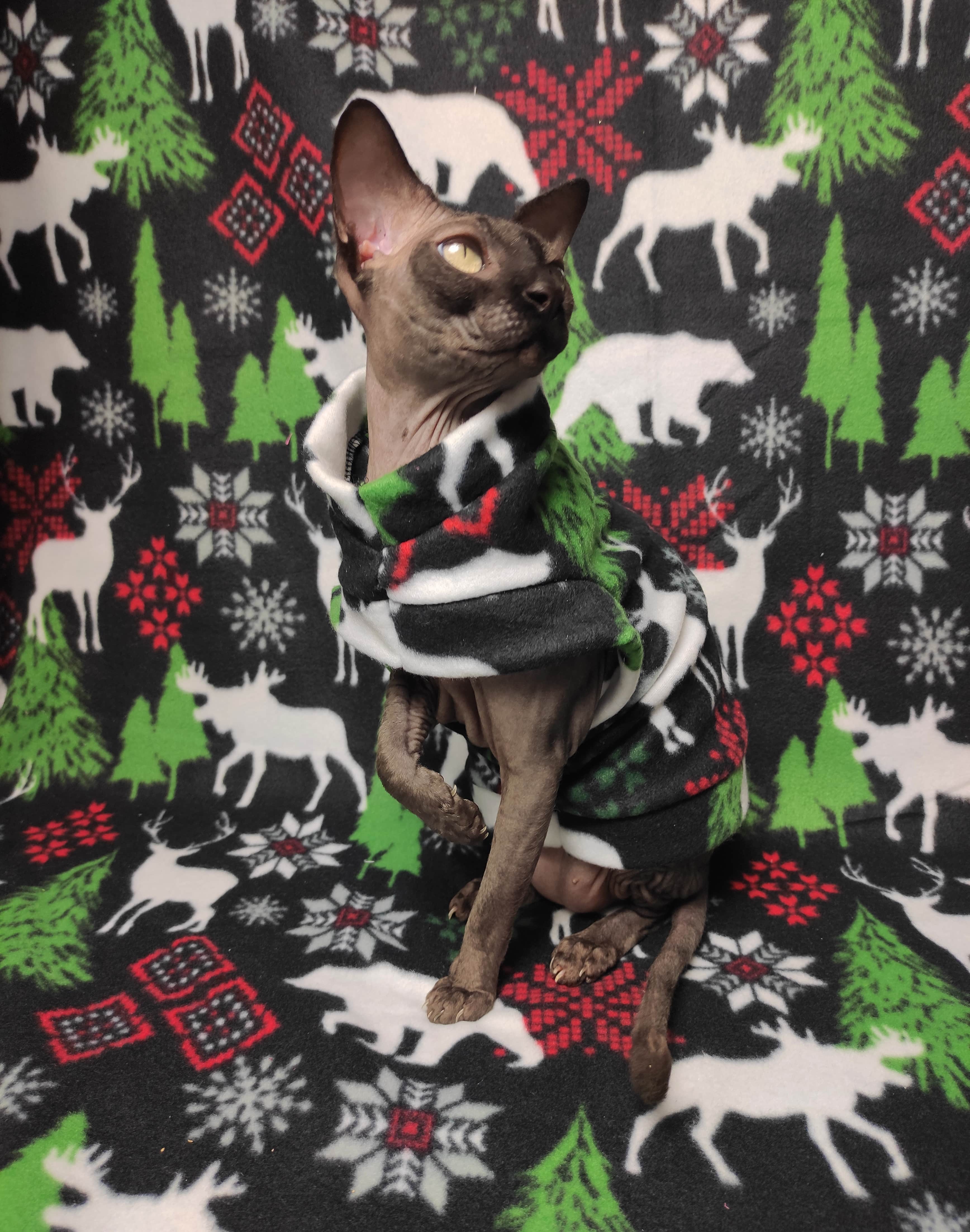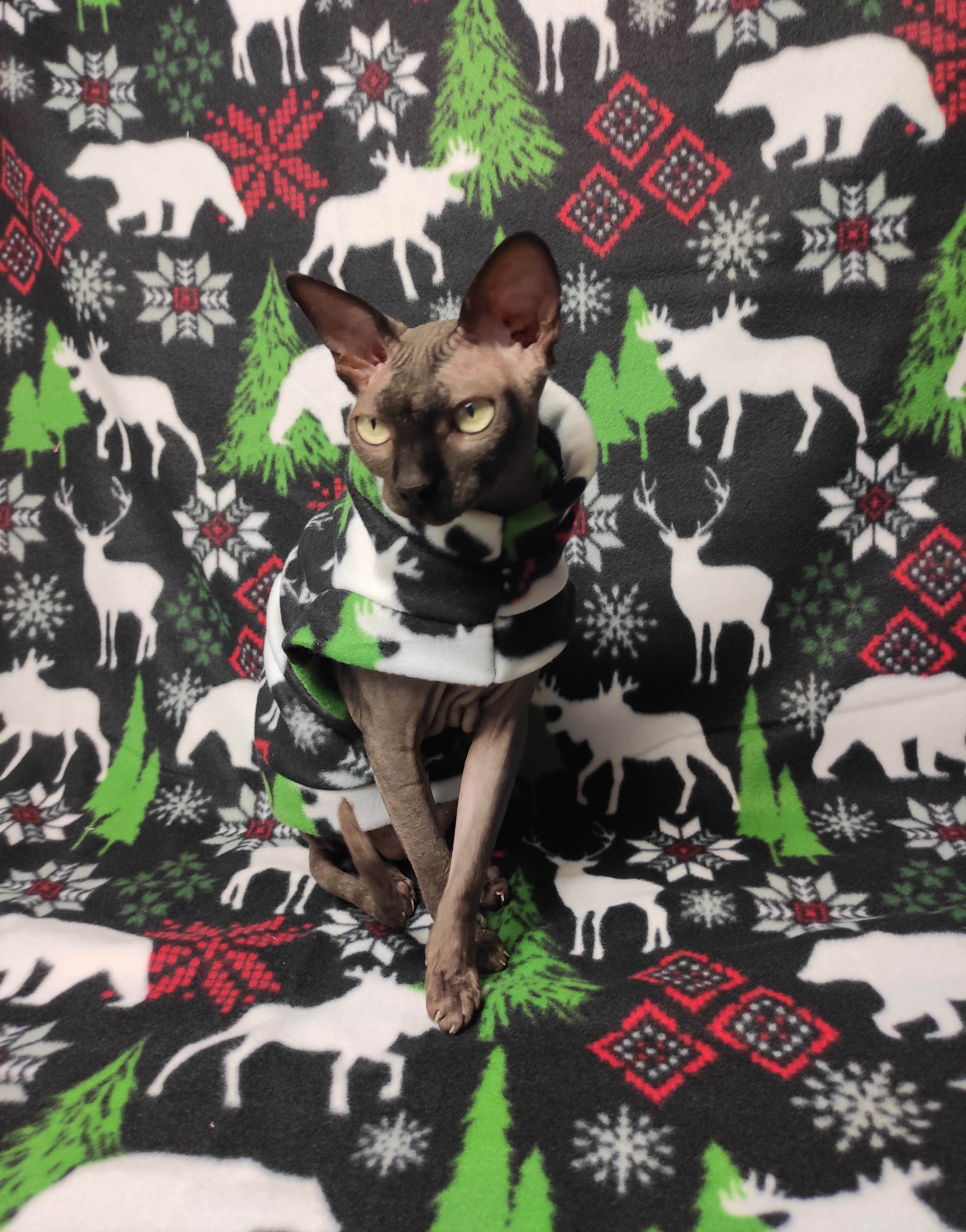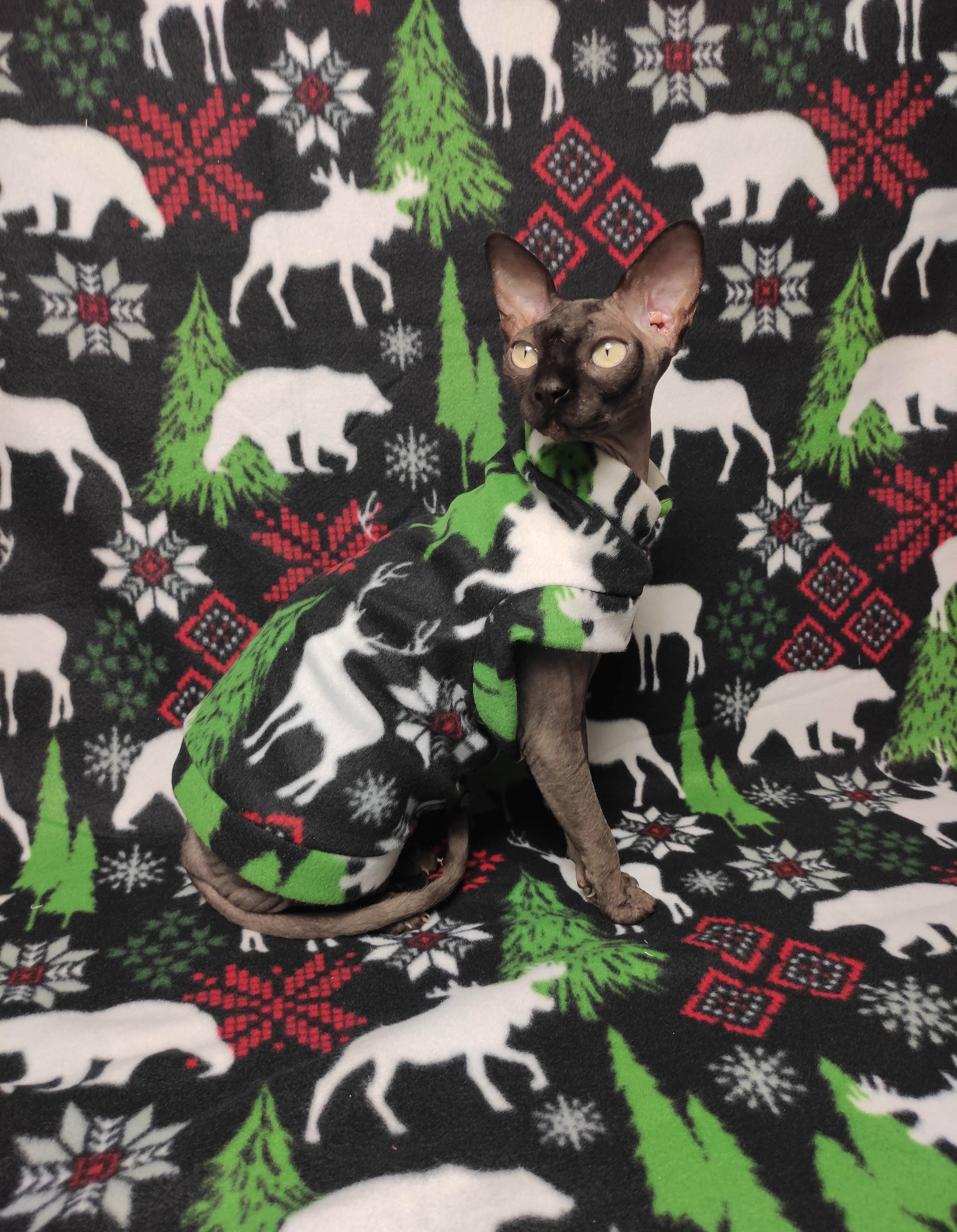 This is the second year we are doing Open Edition cat shirts for Holiday Swag! We will try our best to keep items in stock until Christmas! This is an amazingly soft luxe medium weight stretchy fleece with animals,trees and nordic patterns in green, red, and black.🎄😻