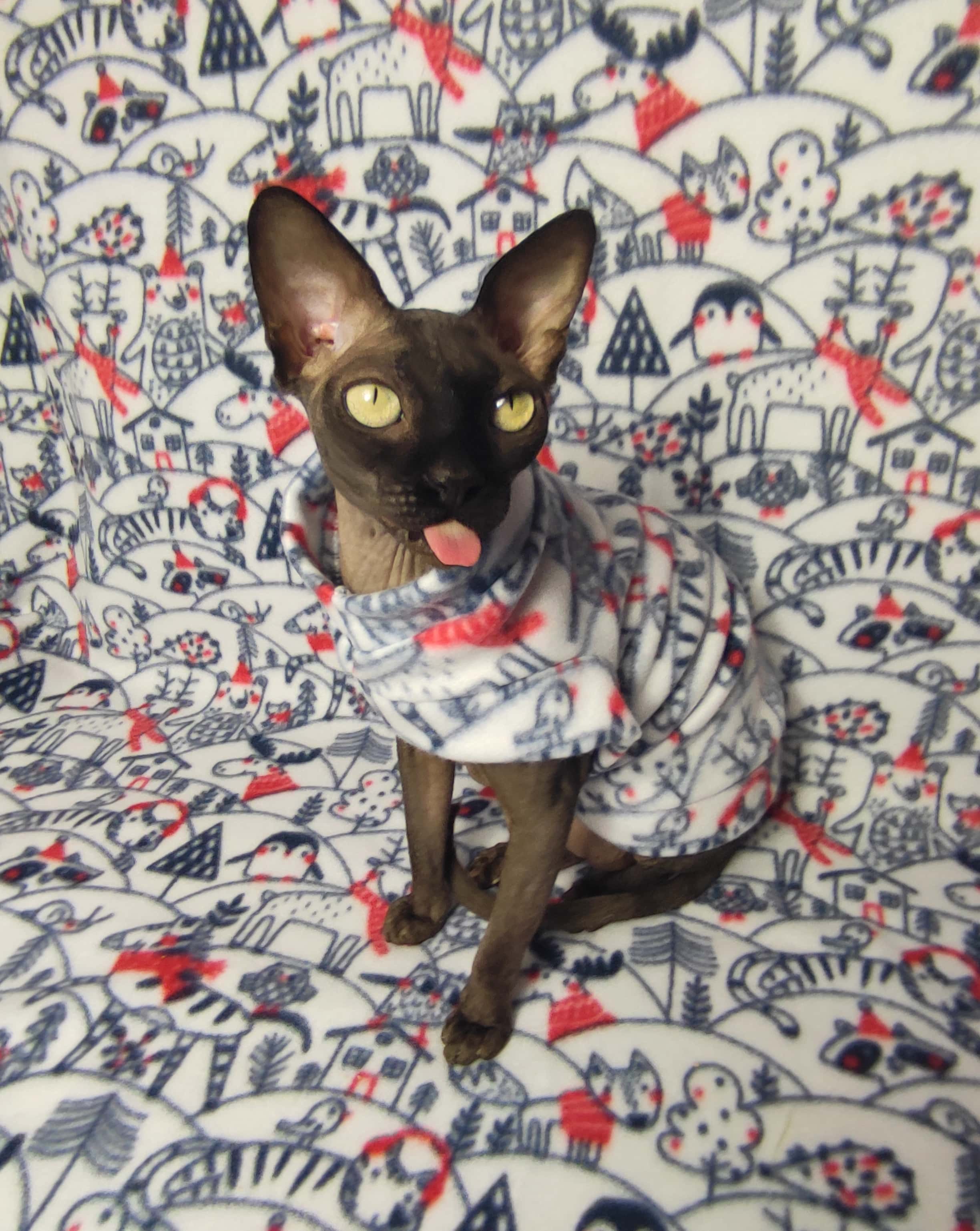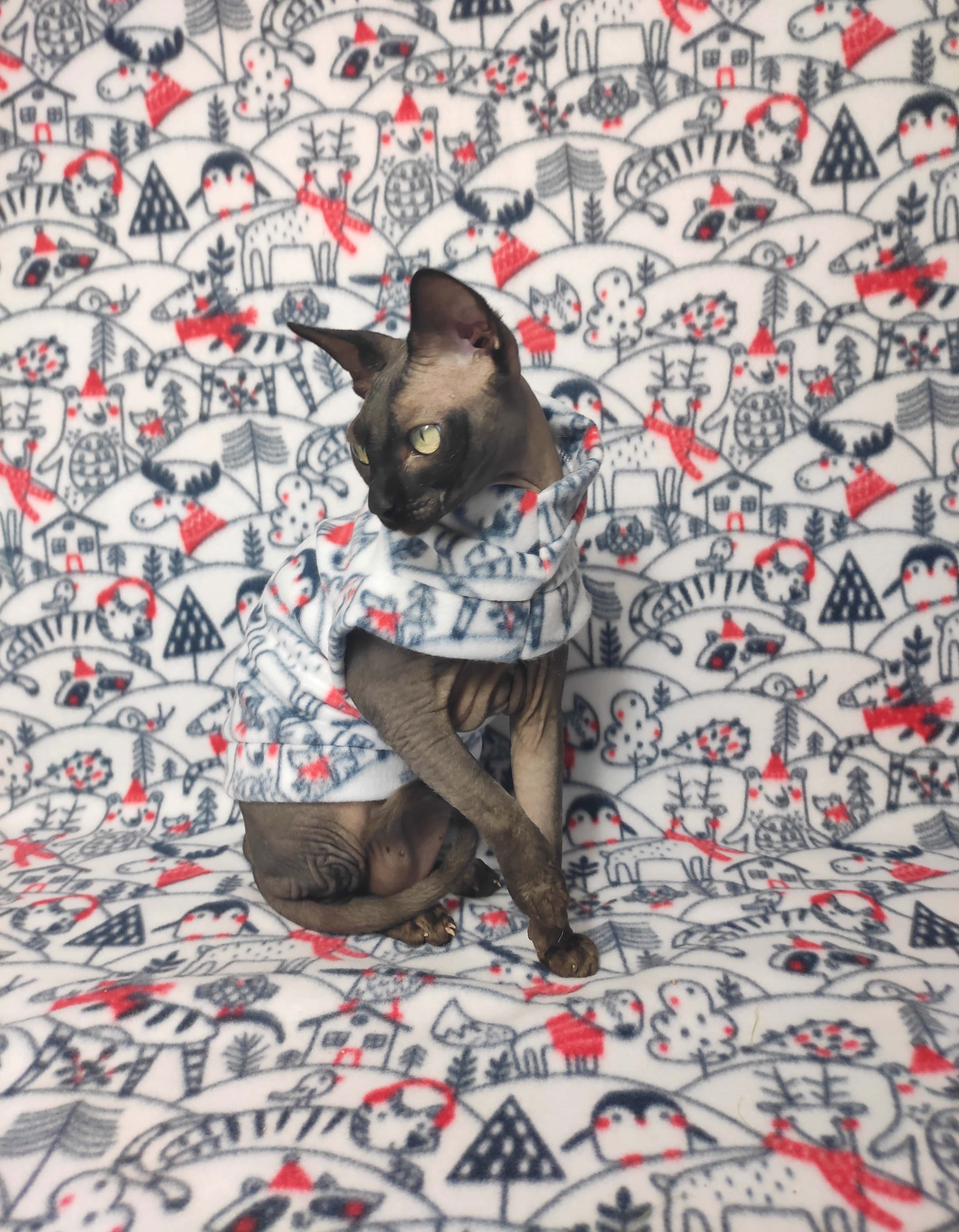REGULAR size is for most adult hairless cats age 1 to 18. BAMBINO size fits hairless kittens age 6 months to 1 year and smaller adult cats. LIL NIPPER size fits hairless kittens age 8 weeks to 15 week olds for when they are with the breeder or for the trip home. Custom orders are welcome for larger and smaller cats - pricing is the same - $27.50