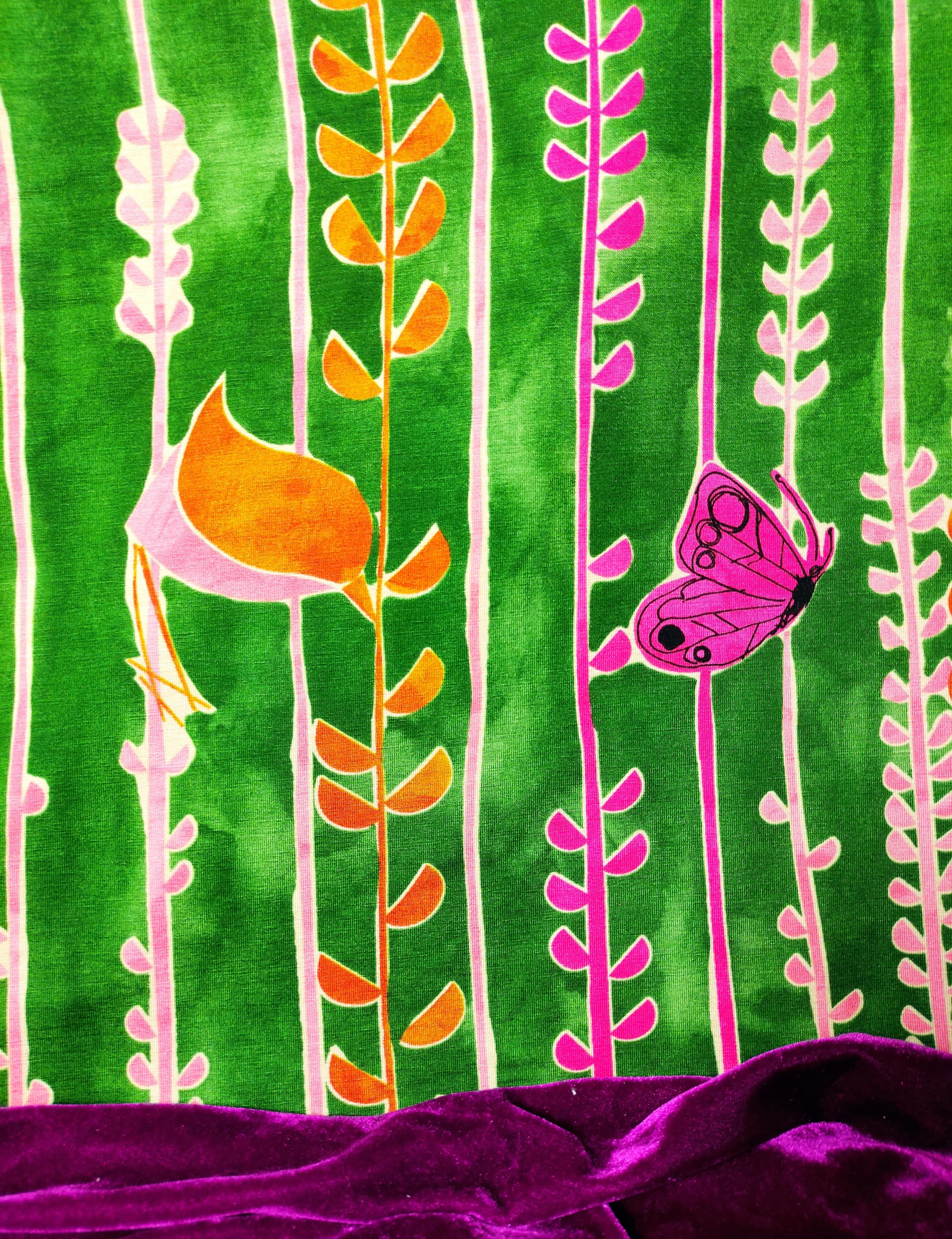 This is a beautiful lightweight stretchy cotton pandex blend fabric with printed batik hanging Vines, birds and butterflies with magenta velvet trim. Regular Size limited to only 8. Bambino Size is limited to only 7, Ankle Biter Size is limited to 2, Lil Nipper Size is limited to 2. No more will be made when they are gone.