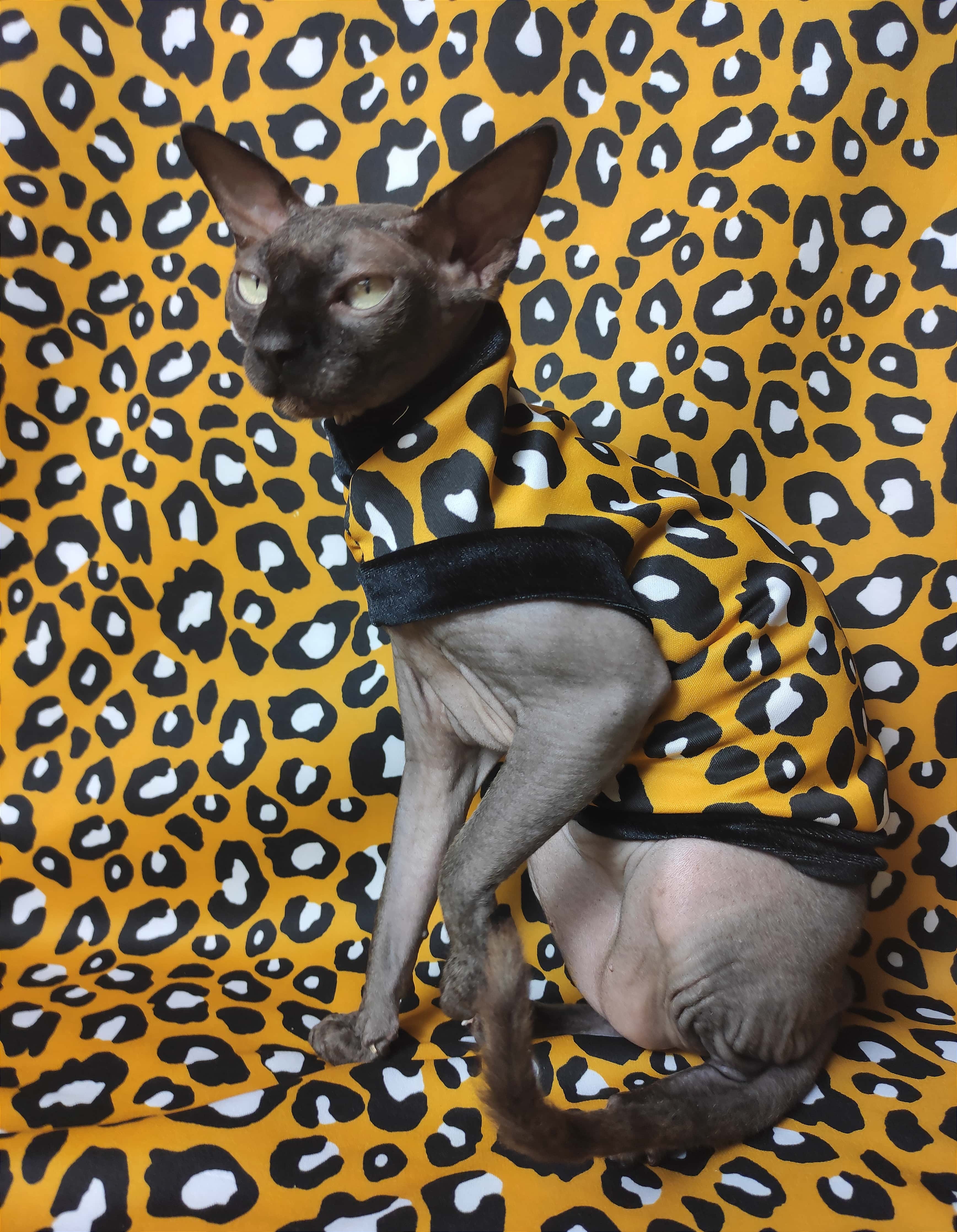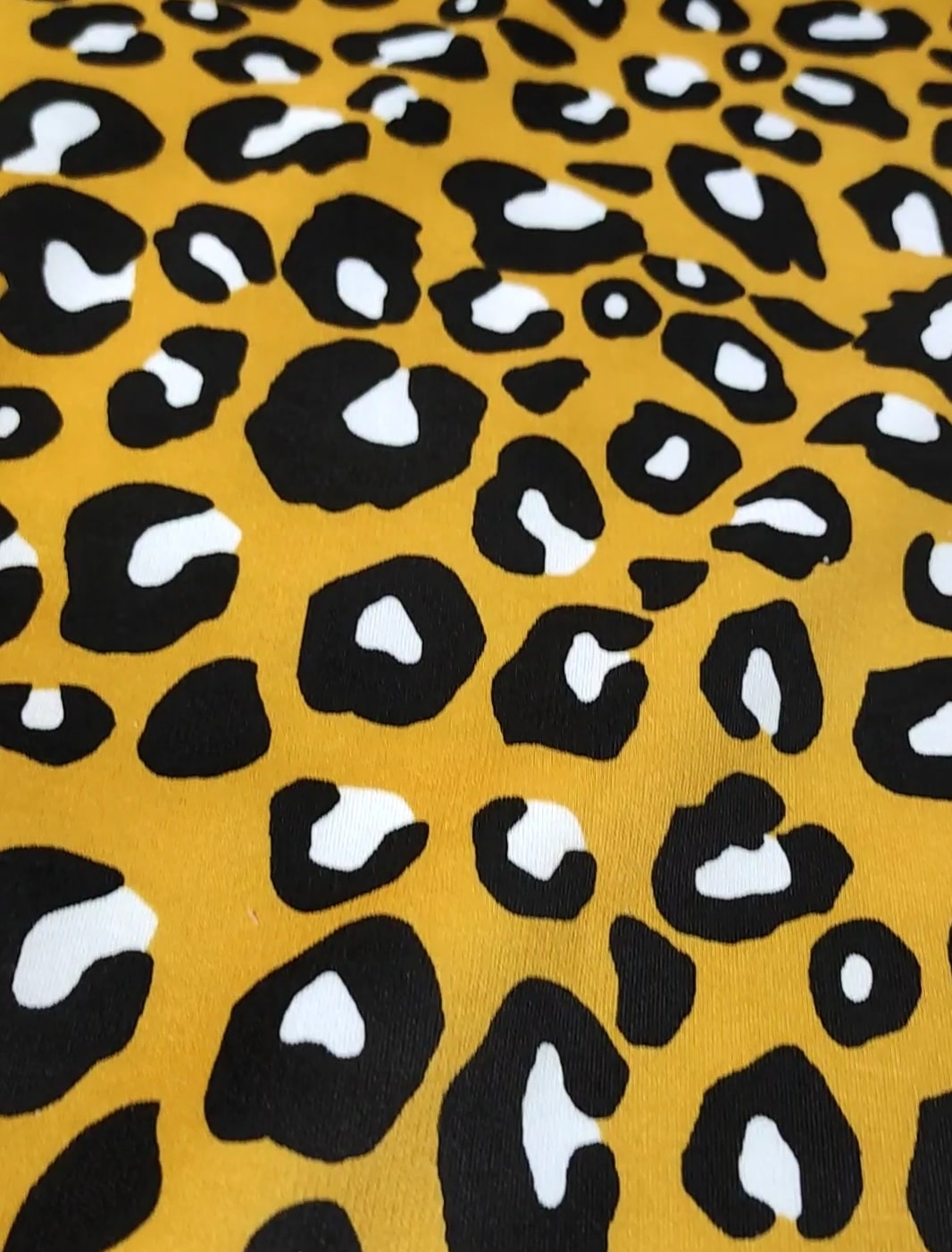 This is a beautiful lightweight stretchy spandex blend fabric with printed yellow leopard pattern with black velvet trim. Regular Size limited to only 8. Bambino Size is limited to only 7, Ankle Biter Size is limited to 3, Lil Nipper Size is limited to 2. No more will be made when they are gone.