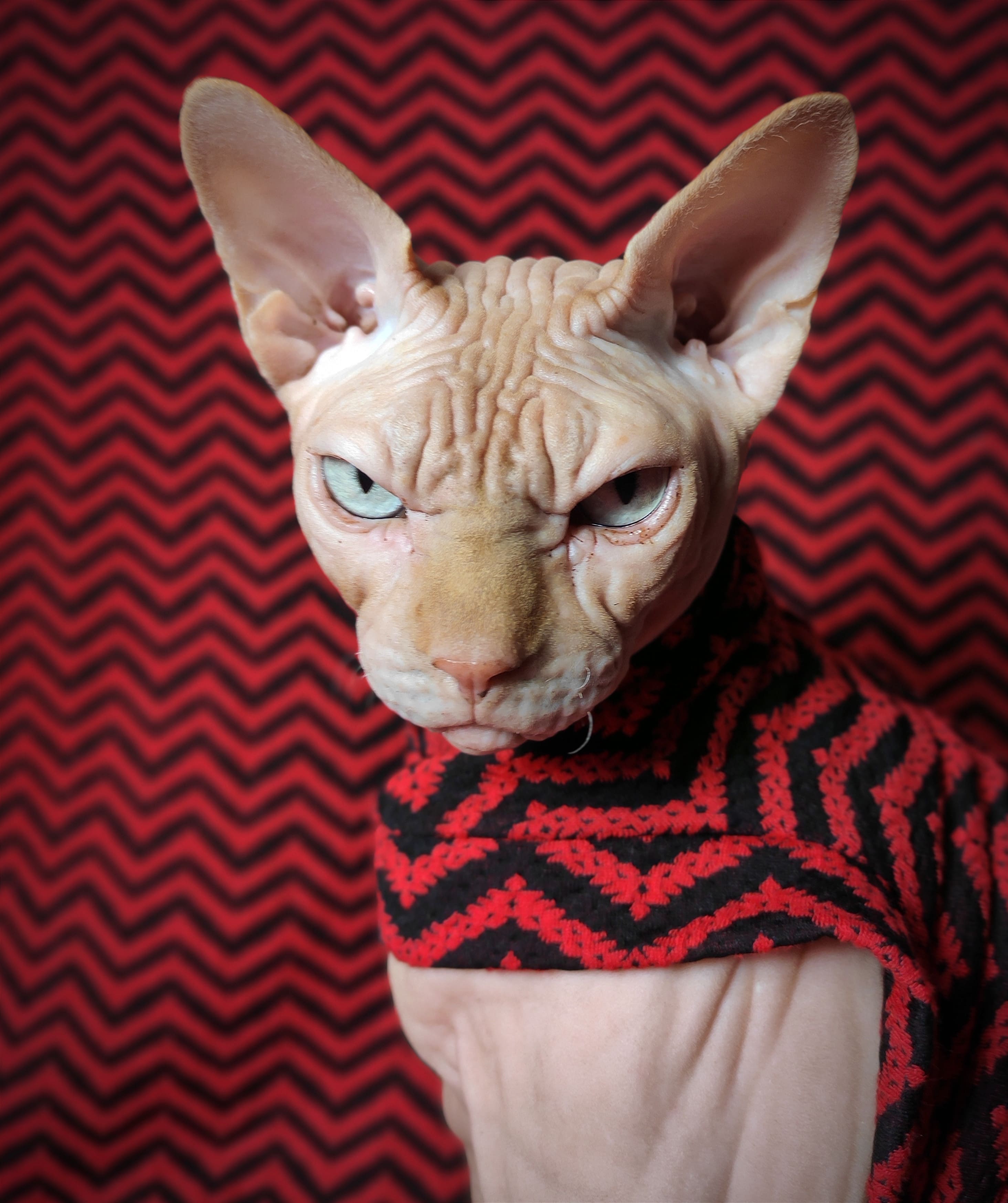 These sweaters fit like no other sweaters. Our original pattern has one hole for both front legs rather than individual holes. The unique design makes it easy to put on and take off, while allowing for improved mobility of your cat. No annoying Velcro anywhere. No awkward walking. All sweaters are machine washable and dryer safe unless specifically mentioned.