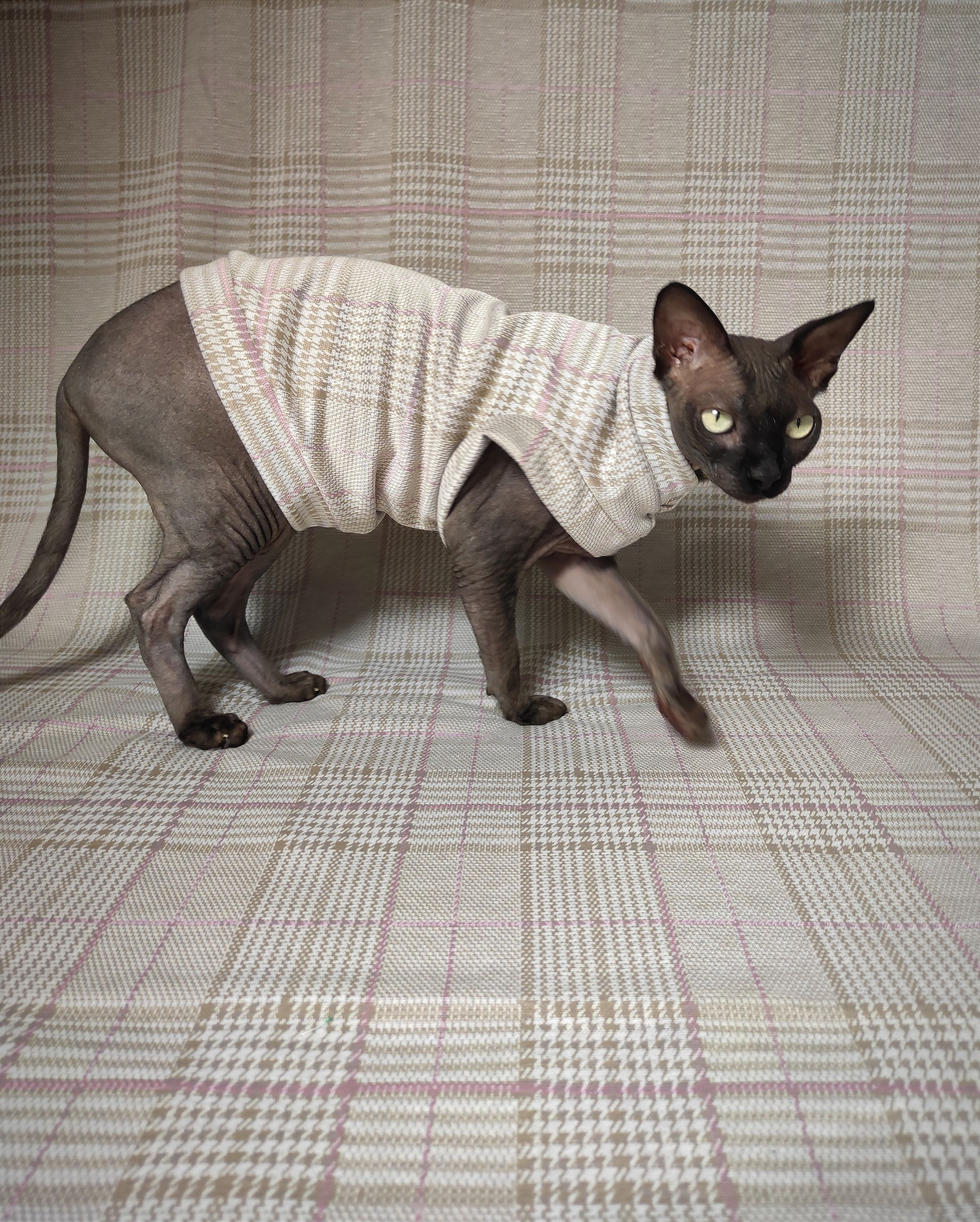These sweaters fit like no other sweaters. Our original pattern has one hole for both front legs rather than individual holes. The unique design makes it easy to put on and take off, while allowing for improved mobility of your cat. No annoying Velcro anywhere. No awkward walking. All sweaters are machine washable and dryer safe unless specifically mentioned.