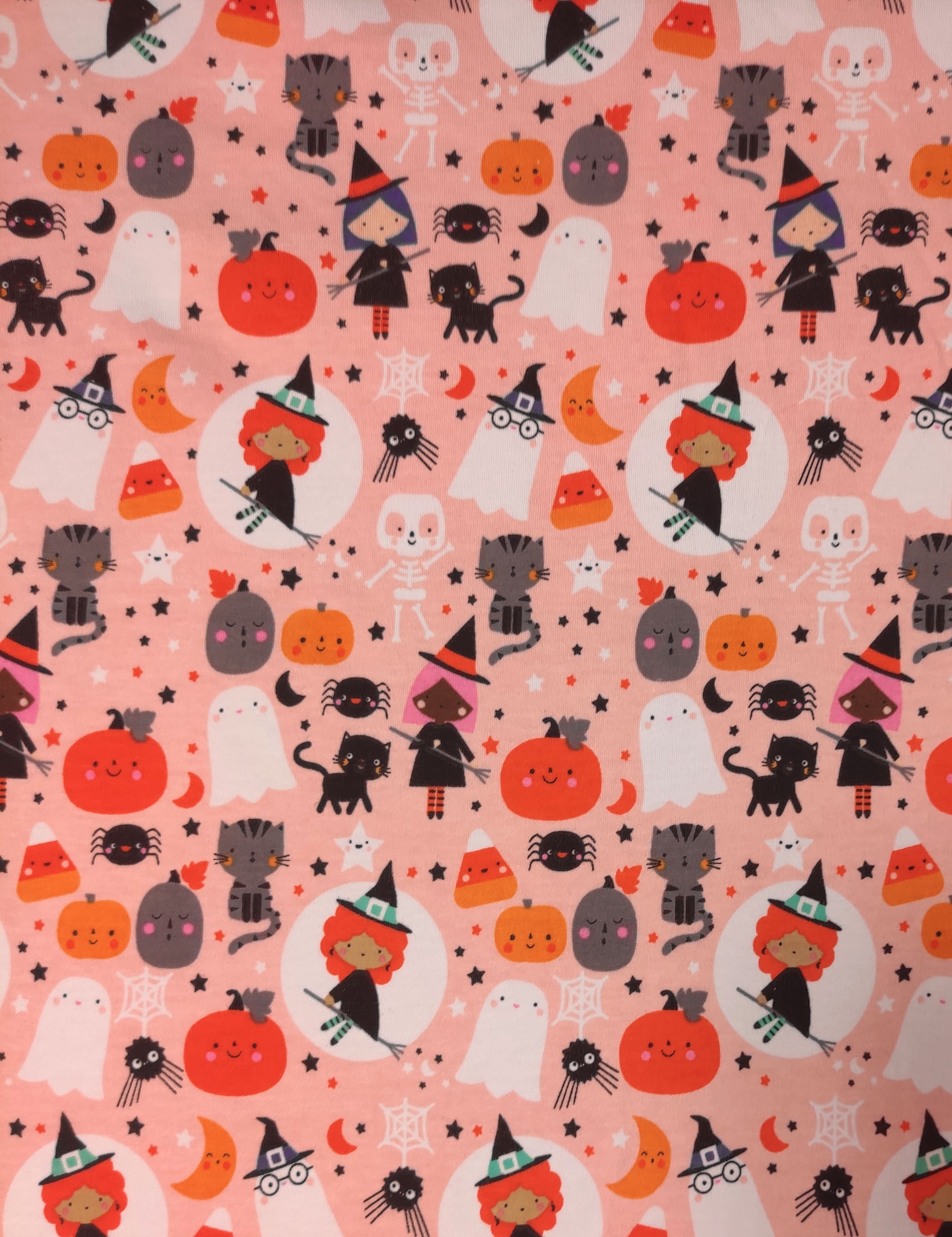 This is a beautiful lightweight stretchy cotton fabric with various witches, ghosts, cats, pumpkins, moons and skeletons with either orange w/ black stars trim or Mystery velour trim (where we choose what trim goes on your Swag and you are surprised when it arrives at your door) Regular Size limited to only 9. Bambino Size is limited to only 7, Ankle Biter Size is limited to 2, Lil Nipper Size is limited to 2. No more will be made when they are gone.