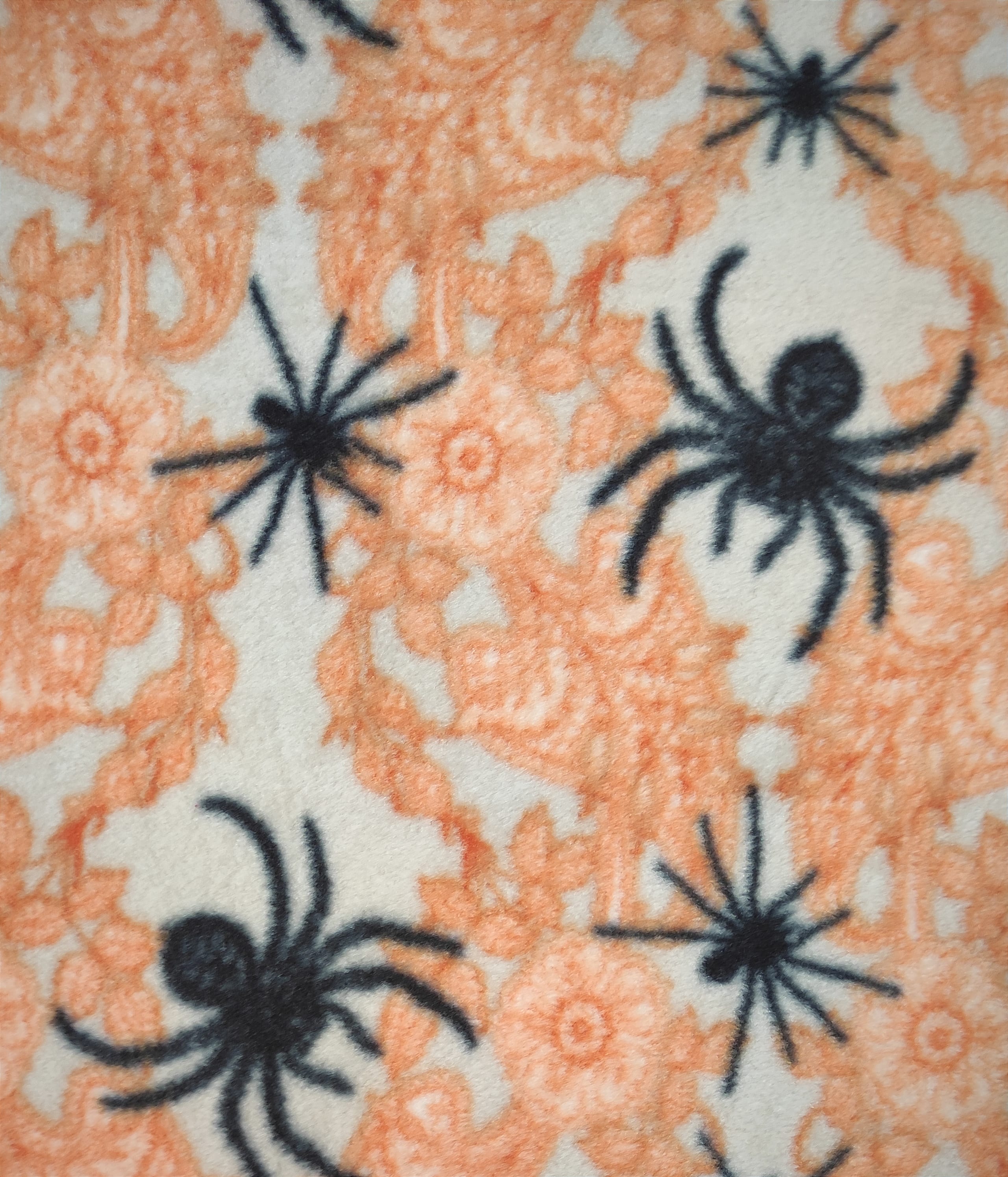 This is a soft medium weight stretchy luxe fleece with spiders, climbing on orange lace.