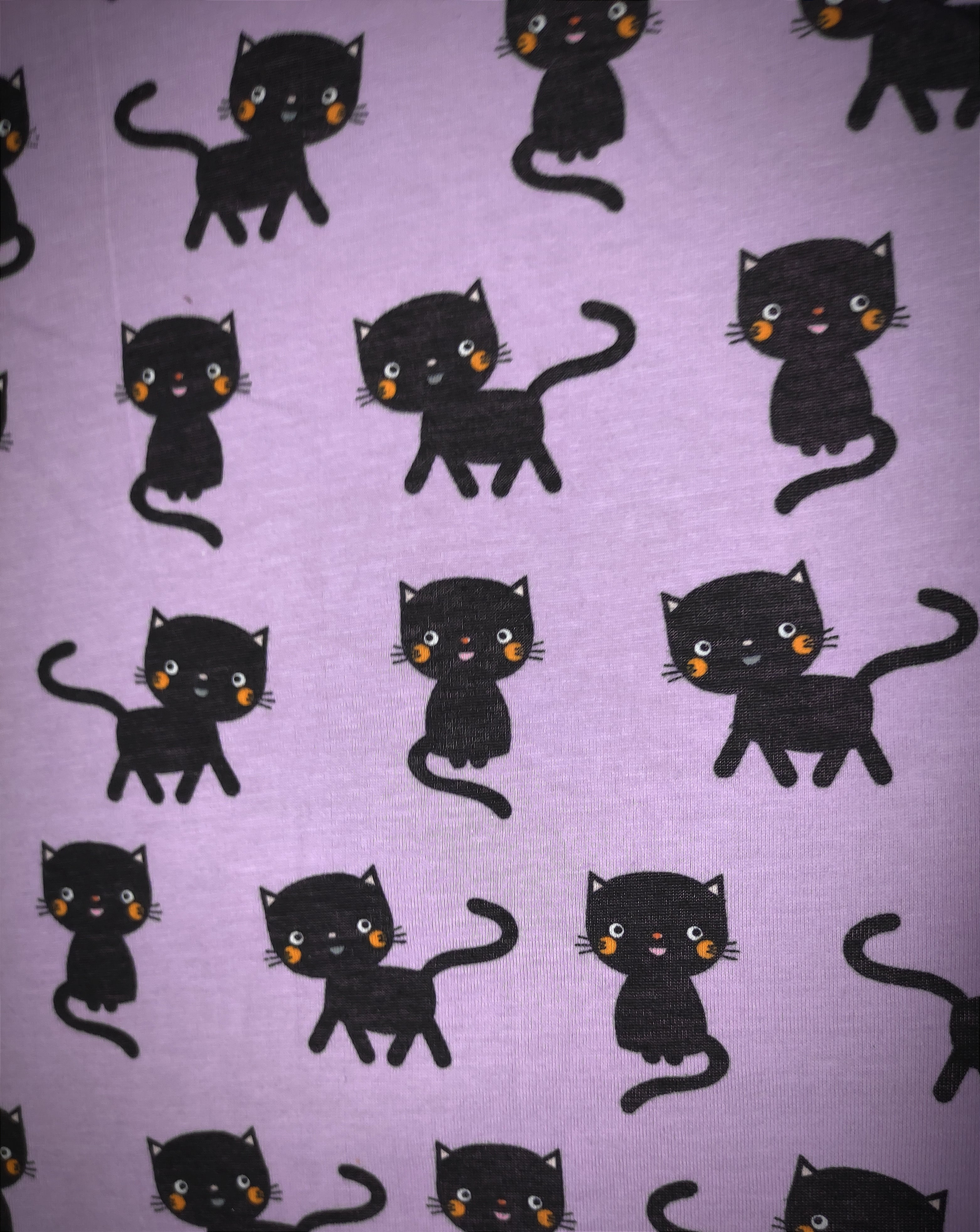 This is a fun lightweight stretchy cotton fabric with black cats on lilac background with black velvet trim or Mystery velour trim (where we choose what trim goes on your Swag and you are surprised when it arrives at your door.)Regular Size limited to only 9. Bambino Size is limited to only 7, Ankle Biter Size is limited to 2, Lil Nipper Size is limited to 2. No more will be made when they are gone.
