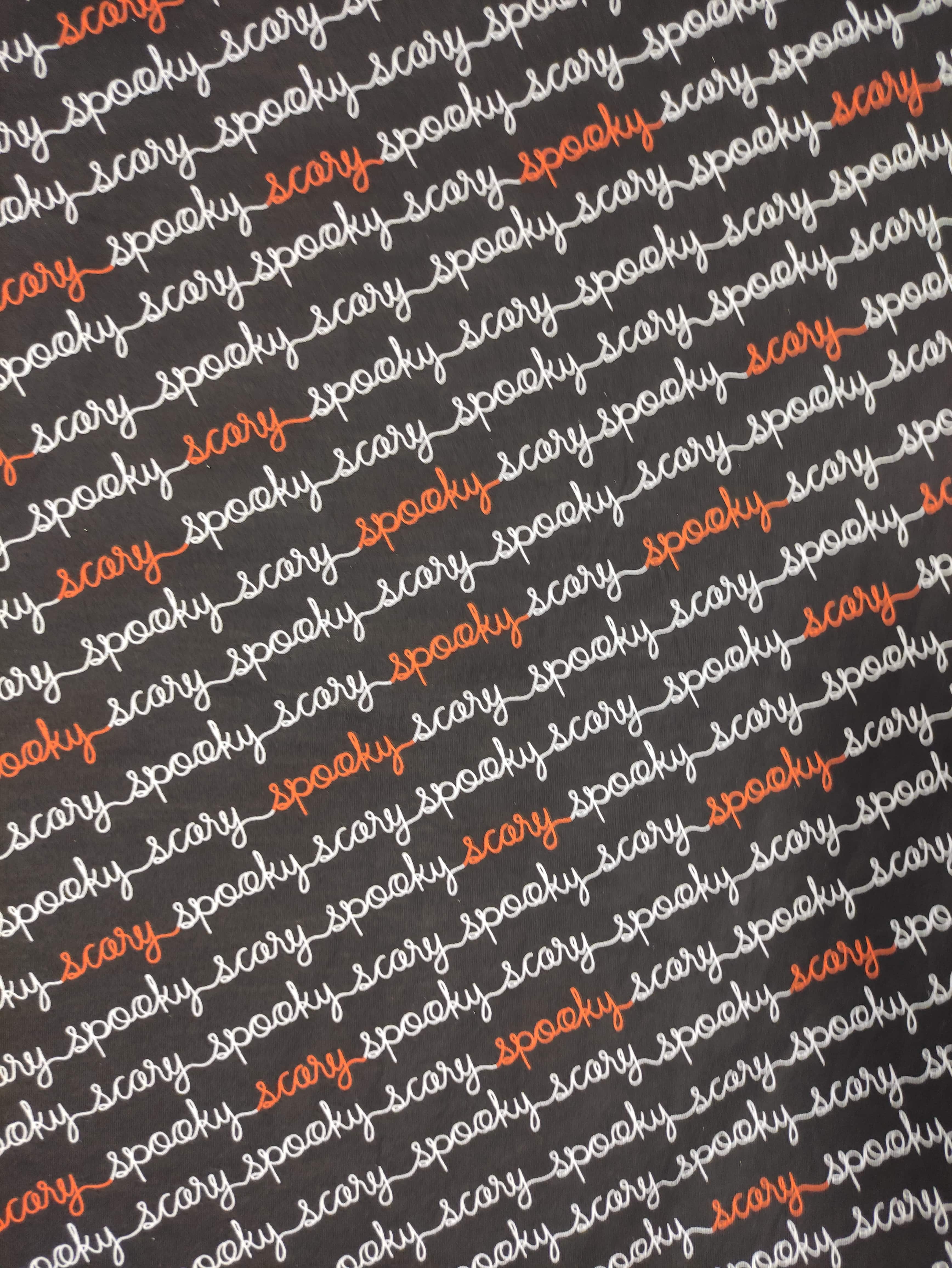 This is a fun lightweight cotton fabric with some stretch with printed angled spooky and scary cursive text with same trim or Mystery velour trim (where we choose what trim goes on your Swag and you are surprised when it arrives at your door) Regular Size limited to only 9. Bambino Size is limited to only 7, Ankle Biter Size is limited to 2, Lil Nipper Size is limited to 2. No more will be made when they are gone.