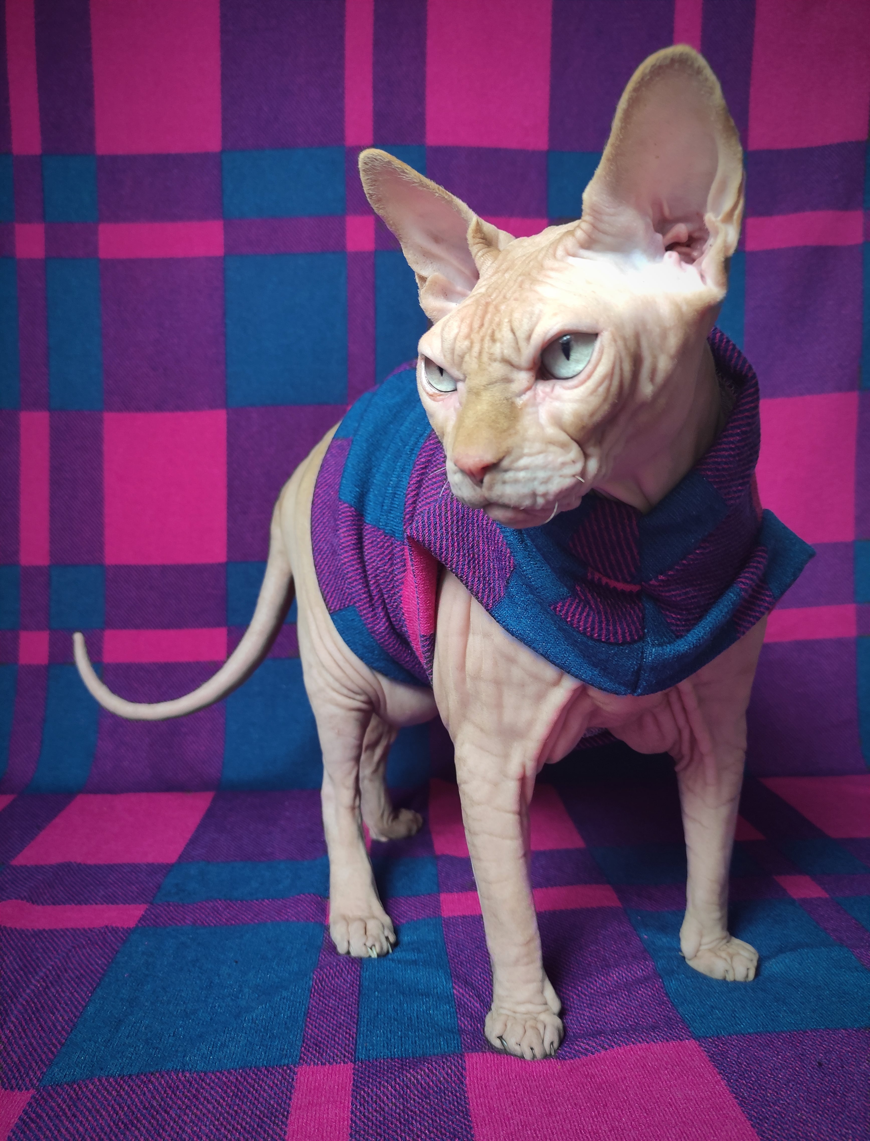 REGULAR size is for most adult hairless cats age 1 to 18. BAMBINO size fits hairless kittens age 6 months to 1 year and smaller adult cats. ANKLE BITER size fits hairless kittens 15 week to 6 month olds. LIL NIPPER size fits hairless kittens age 8 weeks to 15 week olds for when they are with the breeder or for the trip home. Custom orders are welcome for larger and smaller cats - pricing is the same - $27.50