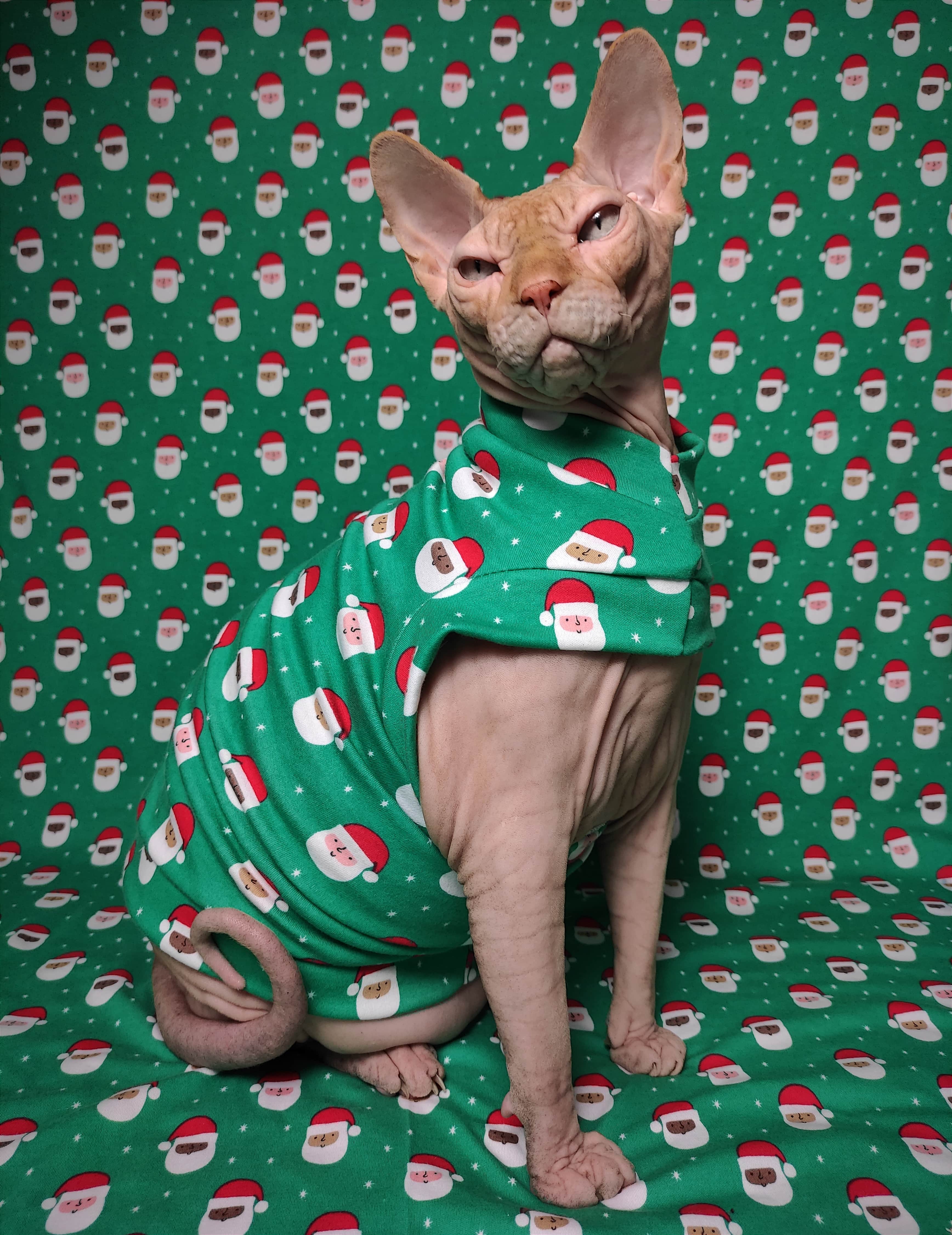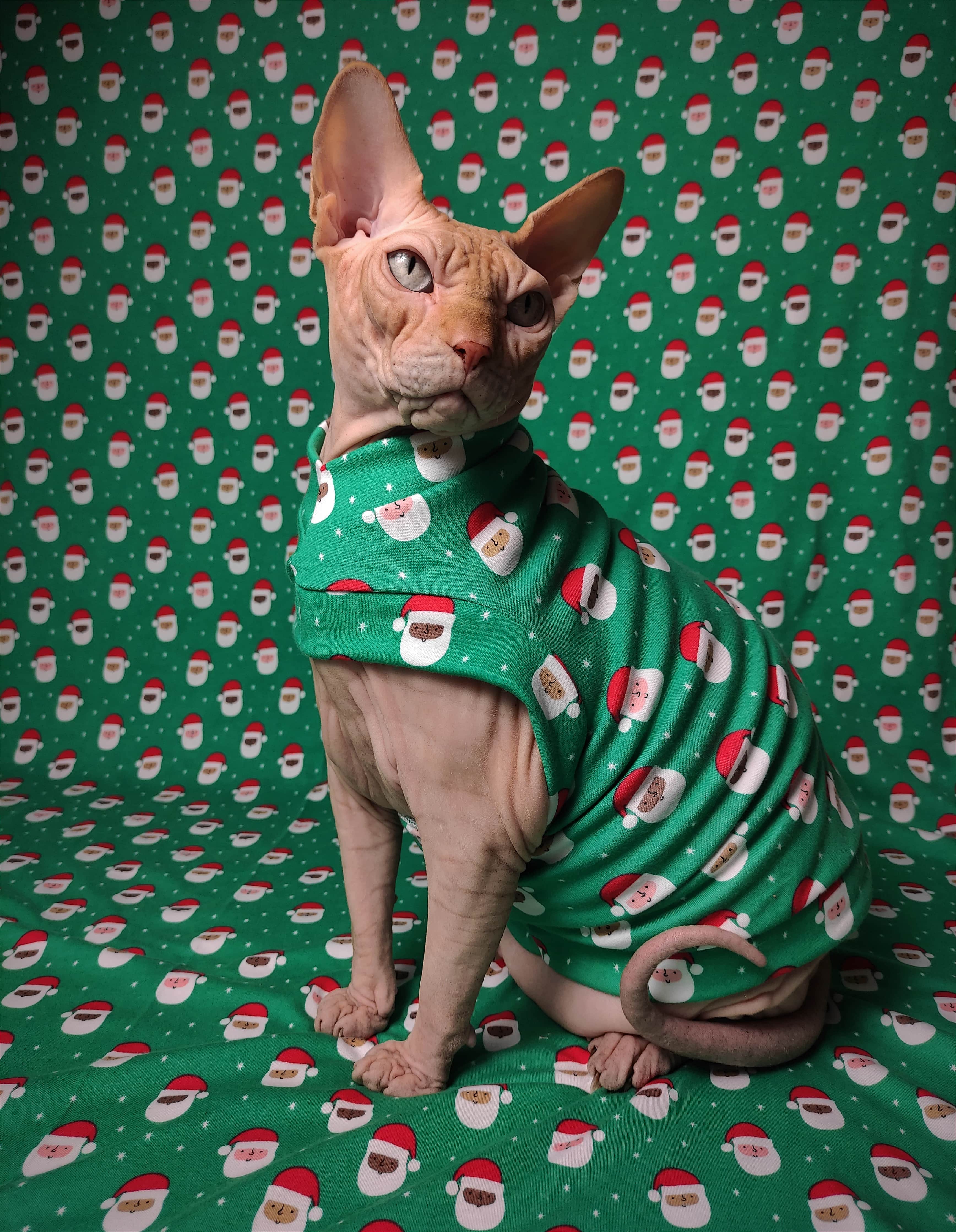 This is an Open Edition cat shirt / sweater for your hairless Sphynx / Devon Rex / Cornish Rex / Peterbald, and even for some of our stylish furry friends. This is a lightweight cotton fabric with stretch printed with Ho's in different fonts (and Santa) with electric red stretchy stim. This is our second Open Edition and we will try our best to accommodate all orders right up until Halloween.