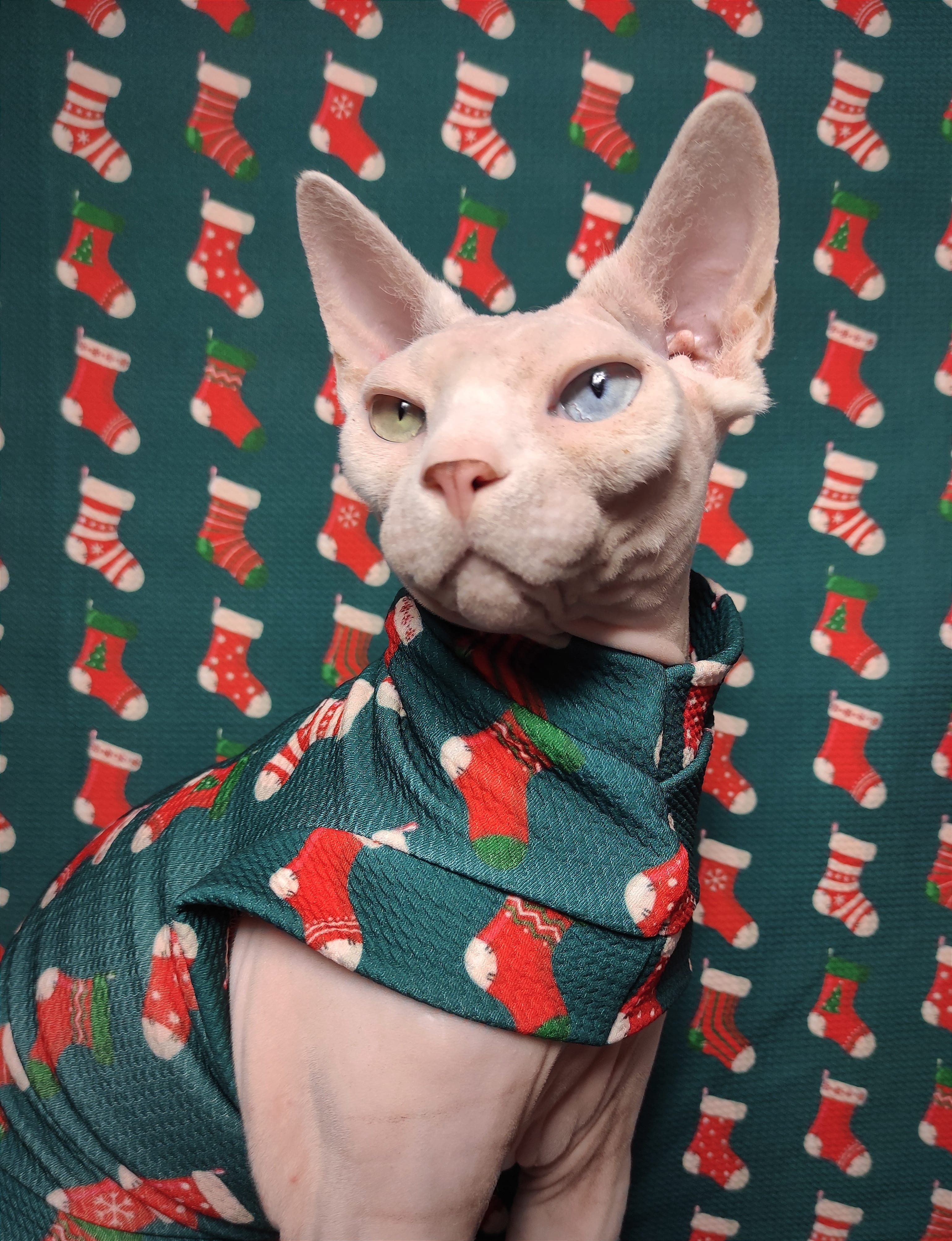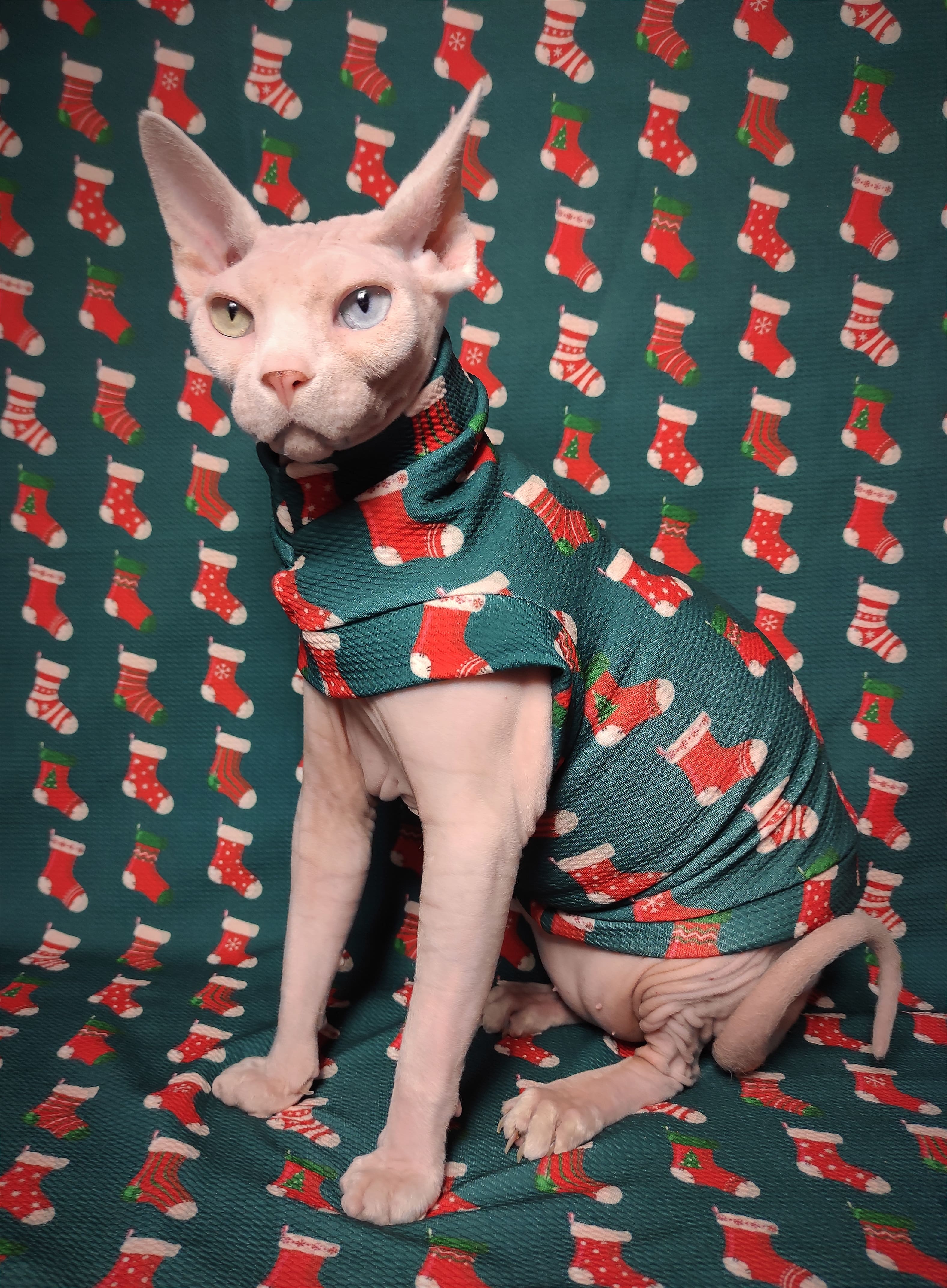 This is the third year we are doing Open Edition cat shirts for Holiday Swag! We will try our best to keep items in stock until Christmas! This is a fun lightweight stretchy textured fabric with printed Santa hats on green background 🎄😻