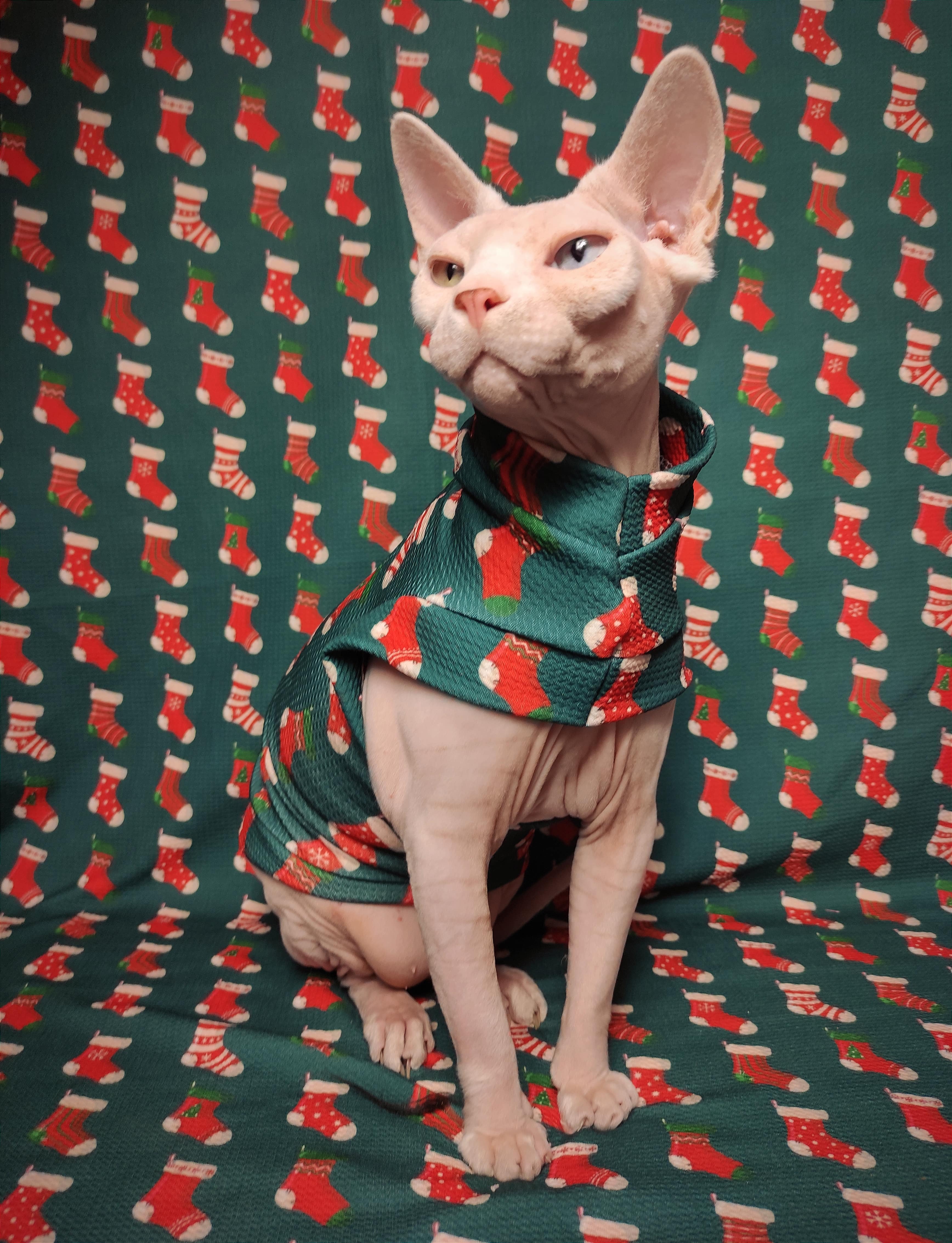 REGULAR size is for most adult hairless cats age 1 to 18. BAMBINO size fits hairless kittens age 6 months to 1 year and smaller adult cats. LIL NIPPER size fits hairless kittens age 8 weeks to 15 week olds for when they are with the breeder or for the trip home. Custom orders are welcome for larger and smaller cats - pricing is the same - $27.50