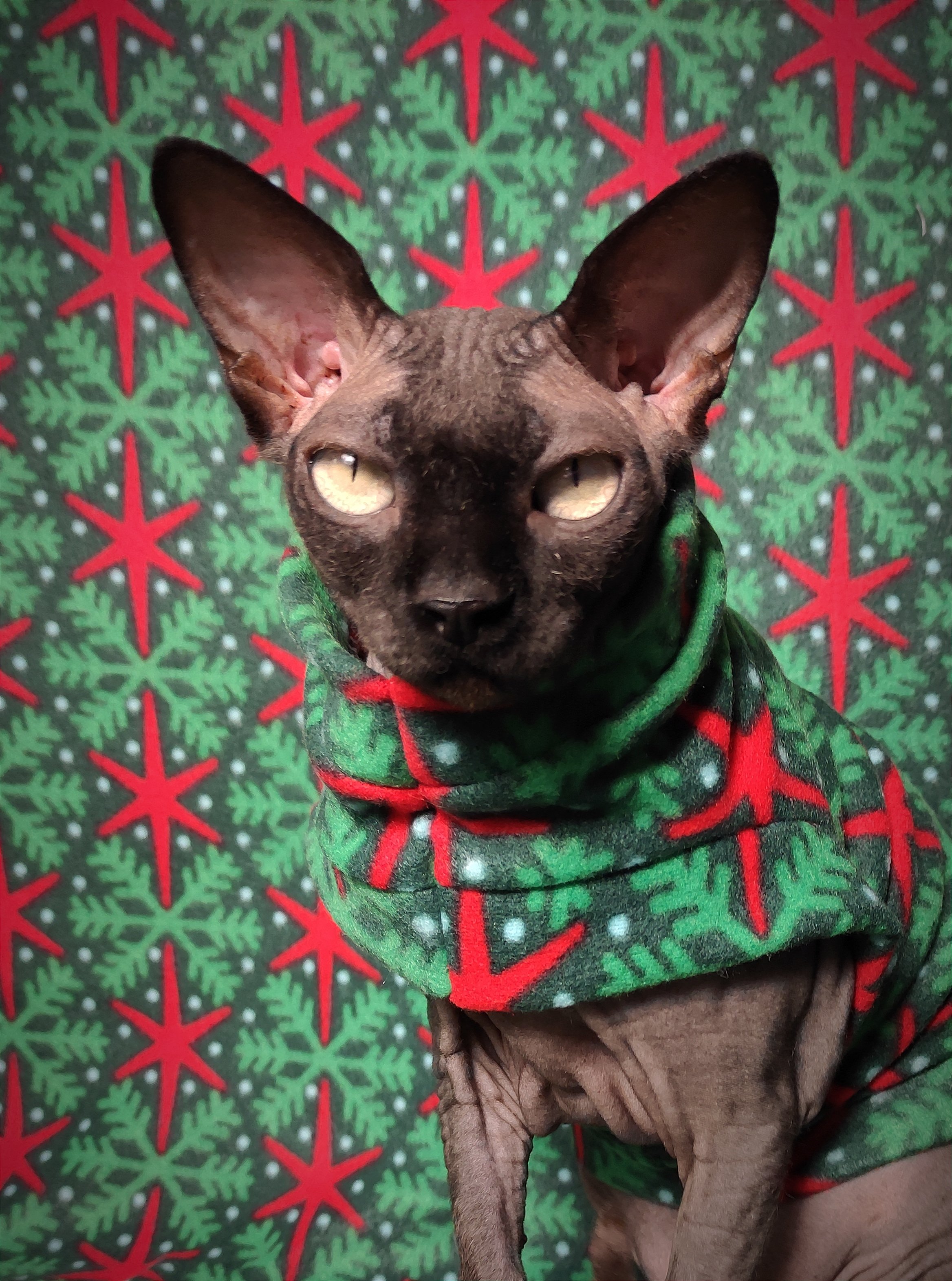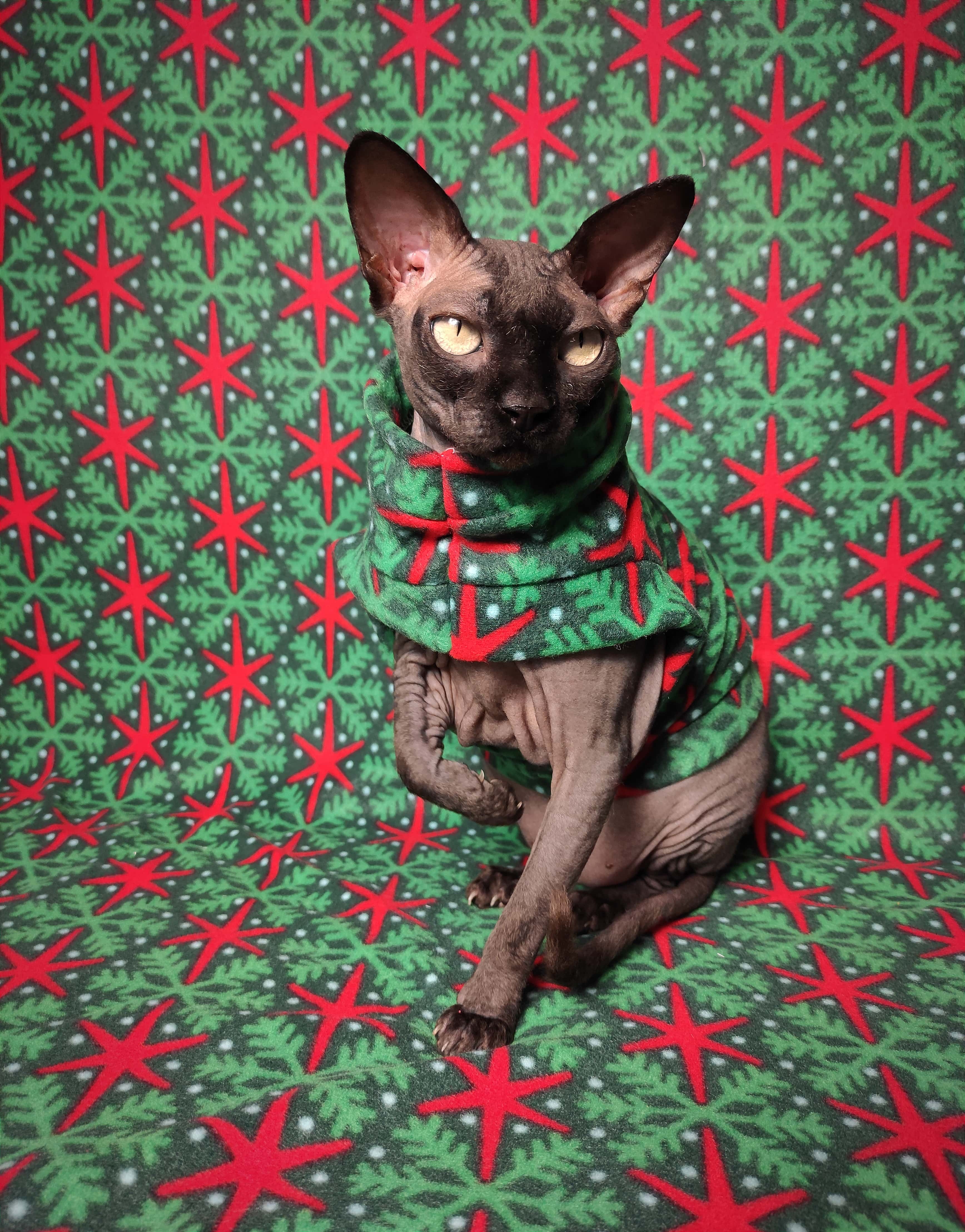 This is the third year we are doing Open Edition cat shirts for Holiday Swag! We will try our best to keep items in stock until Christmas! This is an amazing medium weight stretchy holiday pattern that features red stars and trim trimmings that look like snowflakes 😻